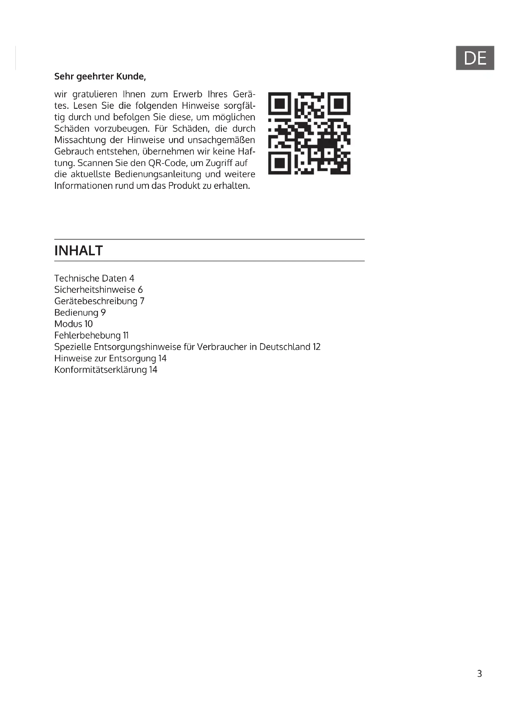 INHALT Technische Daten 4 Sicherheitshinweise 6 Gerätebeschreibung 7 Bedienung 9 Modus 10 Fehlerbehebung 11 Spezielle Entsorgungshinweise für Verbraucher in Deutschland 12 Hinweise zur Entsorgung 14 Konformitätserklärung 14 Sehr geehrter Kunde, wir gratulieren Ihnen zum Erwerb Ihres Gerä- tes. Lesen Sie die folgenden Hinweise sorgfäl- tig durch und befolgen Sie diese, um möglichen Schäden vorzubeugen. Für Schäden, die durch Missachtung der Hinweise und unsachgemäßen Gebrauch entstehen, übernehmen wir keine Haf- tung. Scannen Sie den QR-Code, um Zugri auf die aktuellste Bedienungsanleitung und weitere Informationen rund um das Produkt zu erhalten.4