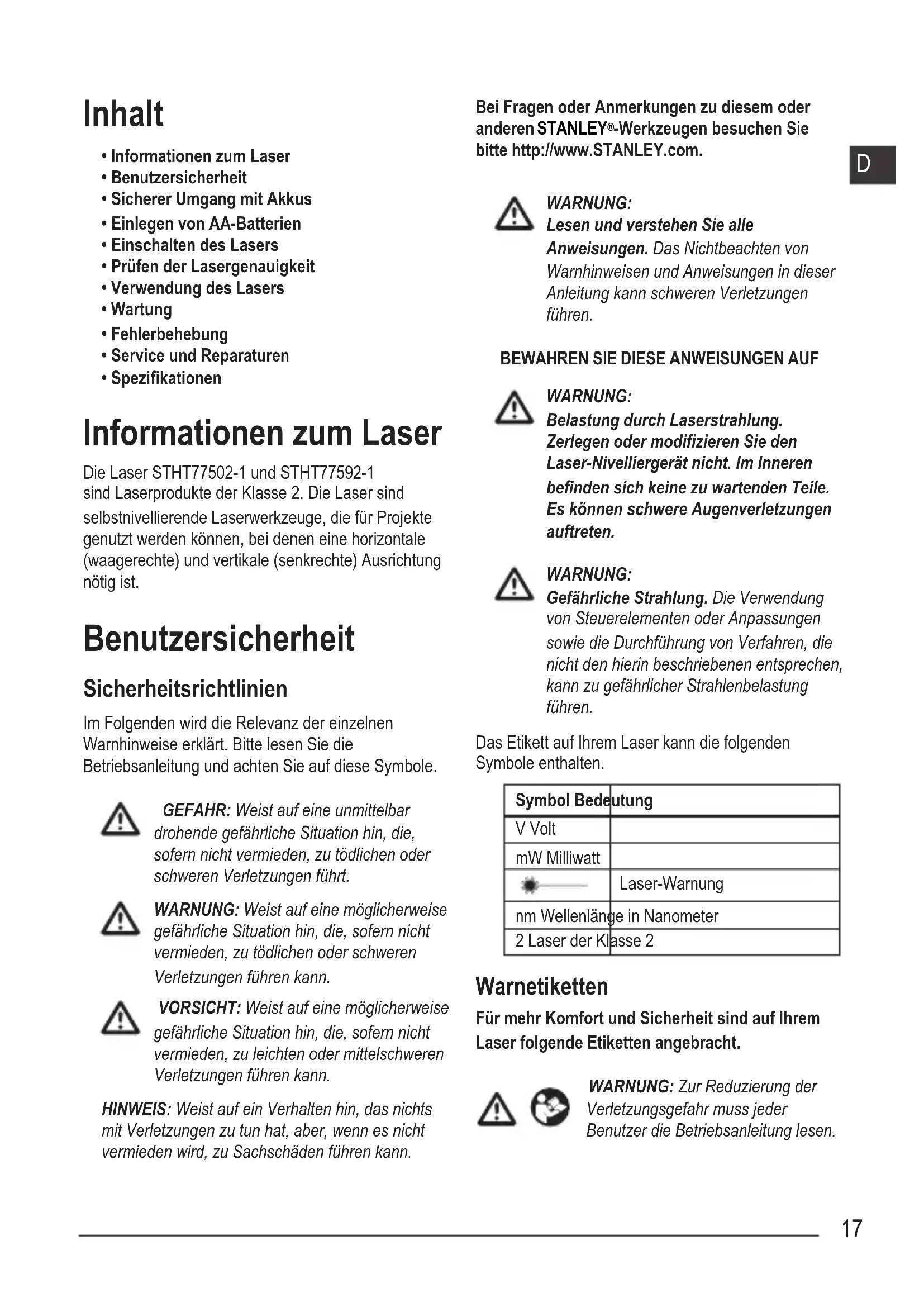 - Spezikationen Informationen zum Laser Die Laser STHT77502-1 und STHT77592-1 sind Laserprodukte der Klasse 2. Die Laser sind selbstnivellierende Laserwerkzeuge, die für Projekte genutzt werden können, bei denen eine horizontale (waagerechte) und vertikale (senkrechte) Ausrichtung nötig ist. Benutzersicherheit Sicherheitsrichtlinien Im Folgenden wird die Relevanz der einzelnen Warnhinweise erklärt. Bitte lesen Sie die Betriebsanleitung und achten Sie auf diese Symbole. GEFAHR: Weist auf eine unmittelbar drohende gefährliche Situation hin, die, sofern nicht vermieden, zu tödlichen oder schweren Verletzungen führt. WARNUNG: Weist auf eine möglicherweise gefährliche Situation hin, die, sofern nicht vermieden, zu tödlichen oder schweren Verletzungen führen kann. VORSICHT: Weist auf eine möglicherweise gefährliche Situation hin, die, sofern nicht vermieden, zu leichten oder mittelschweren Verletzungen führen kann. HINWEIS: Weist auf ein Verhalten hin, das nichts mit Verletzungen zu tun hat, aber, wenn es nicht vermieden wird, zu Sachschäden führen kann. Bei Fragen oder Anmerkungen zu diesem oder anderen STANLEY