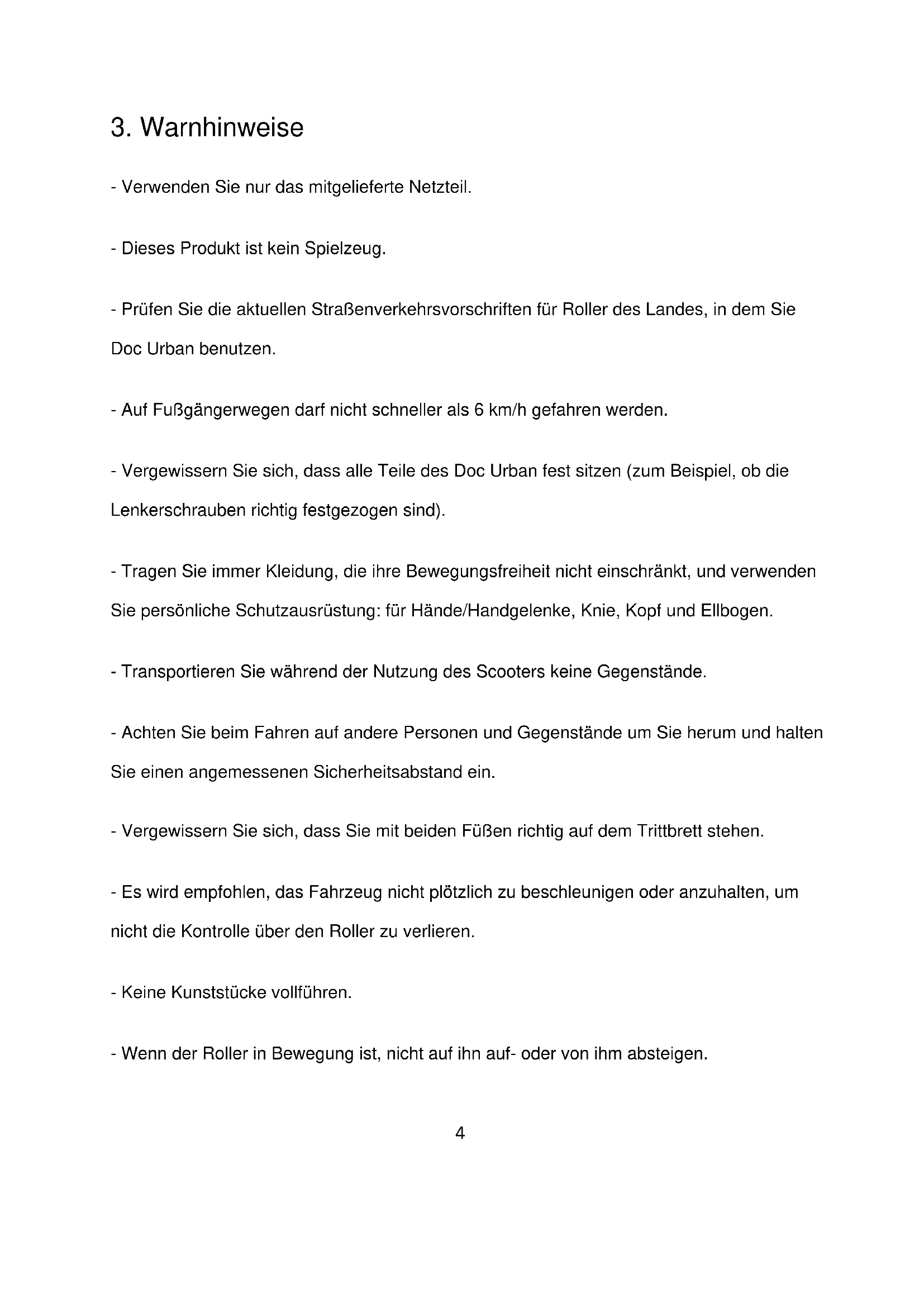 - Verwenden Sie nur das mitgelieferte Netzteil. - Dieses Produkt ist kein Spielzeug. - Prüfen Sie die aktuellen Straßenverkehrsvorschriften für Roller des Landes, in dem Sie Doc Urban benutzen. - Auf Fußgängerwegen darf nicht schneller als 6 km/h gefahren werden. - Vergewissern Sie sich, dass alle Teile des Doc Urban fest sitzen (zum Beispiel, ob die Lenkerschrauben richtig festgezogen sind). - Tragen Sie immer Kleidung, die ihre Bewegungsfreiheit nicht einschränkt, und verwenden Sie persönliche Schutzausrüstung: für Hände/Handgelenke, Knie, Kopf und Ellbogen. - Transportieren Sie während der Nutzung des Scooters keine Gegenstände. - Achten Sie beim Fahren auf andere Personen und Gegenstände um Sie herum und halten Sie einen angemessenen Sicherheitsabstand ein. - Vergewissern Sie sich, dass Sie mit beiden Füßen richtig auf dem Trittbrett stehen. - Es wird empfohlen, das Fahrzeug nicht plötzlich zu beschleunigen oder anzuhalten, um nicht die Kontrolle über den Roller zu verlieren. - Keine Kunststücke vollführen. - Wenn der Roller in Bewegung ist, nicht auf ihn auf- oder von ihm absteigen.5 - Halten Sie das für den Fahrer vorgesehene Maximalgewicht ein. - Verwenden Sie das Produkt nicht bei ungünstigen Witterungsbedingungen (z.B. Regen, Hagel oder Schnee), um Schäden am Stromsystem und Motor zu vermeiden. Vermeiden Sie ebenfalls, Doc Urban auf bekiesten, sandigen oder rutschigen Oberflächen zu benutzen. Steigen Sie auf steilen bergab- oder bergaufführenden Wegen nicht auf den Doc Urban auf oder von ihm ab. - Bei schlechter Sicht muss das Vorder- und das Rücklicht eingeschaltet werden und gut sichtbare, reflektierende Kleidung getragen werden. - Benutzen Sie Doc Urban nicht bei Temperaturen unter -5° C. - Benutzen Sie Doc Urban nicht mit heruntergeklapptem Ständer. - Es ist verboten, den Doc Urban mit mehreren Personen zu besteigen. - Die Benutzung von Doc Urban wird nicht empfohlen für Menschen mit eingeschränkten motorischen Fähigkeiten, Menschen mit verändertem psychophysischen Zustand und für Schwangere. - Wenn Sie Doc Urban zum ersten Mal benutzen, üben Sie zur Sicherheit in einem offenen, gefahrenfreien Gelände damit zu fahren. - Nicht in brennbaren Umgebungen benutzen. - Hersteller, Importeur und Verkäufer sind nicht für Personen- oder Sachschäden verantwortlich, die durch unsachgemäßen Gebrauch von Doc Urban entstehen.6 - Versuchen Sie nicht, das Produkt selbst zu reparieren, sondern wenden Sie sich im Falle einer Funktionsstörung an Ihren Händler. - Trennen Sie vor der Reinigung die Stromversorgung. - Verwenden Sie zur Reinigung ein soeben mit Wasser oder mit einem zur Reinigung solcher Geräte geeigneten Mittel befeuchtetes Tuch. Tauchen Sie Doc Urban nicht ins Wasser ein und versuchen Sie nicht, ihn mit Wasserstrahlen zu reinigen. - Um die Batterie zu erhalten, muss sie alle 30 Tage aufgeladen werden, auch falls Doc Urban nicht benutzt wird. Sonst verliert die Batterie ihre Leistungsfähigkeit zulasten der Reichweite. - Die maximal mit einer Batterieladung zurückgelegte Entfernung kann in Abhängigkeit bestimmter Faktoren wie dem Gewicht des Fahrers, der Steigung und der Beschaffenheit der Straße sowie der richtigen Wartung der Batterie variieren.