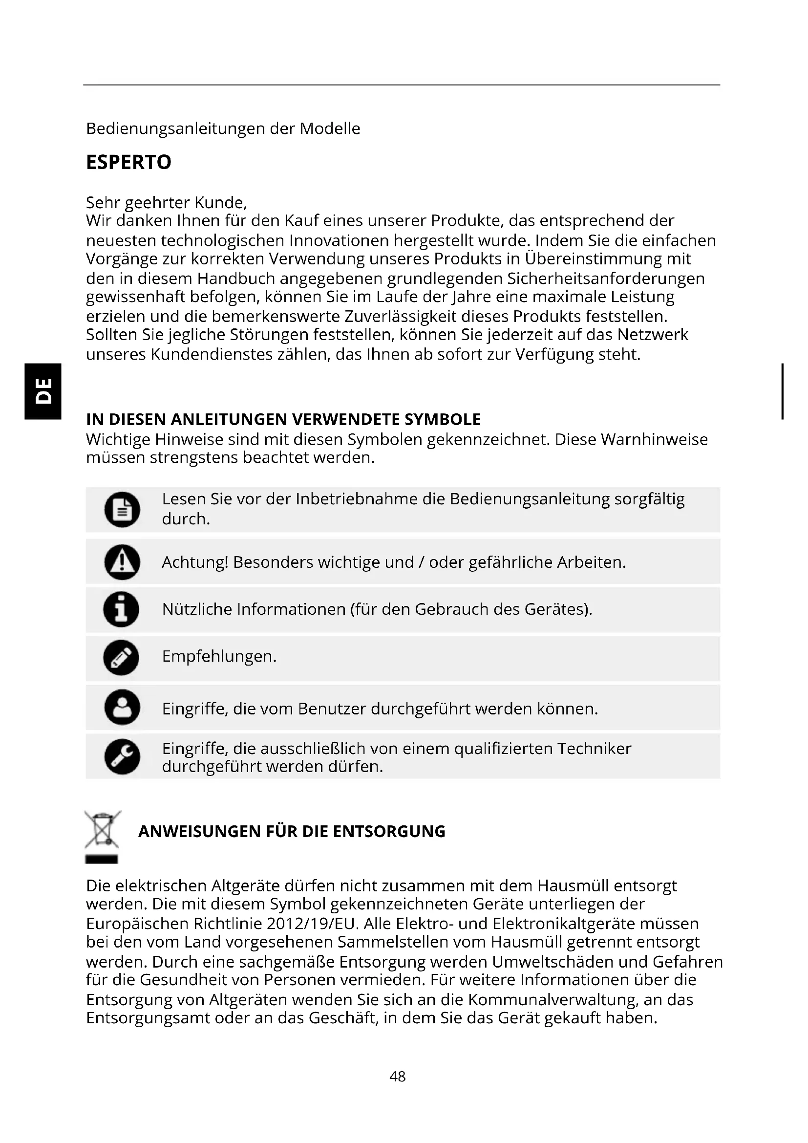 Bedienungsanleitungen der Modelle ESPERTO Sehr geehrter Kunde, Wir danken Ihnen für den Kauf eines unserer Produkte, das entsprechend der neuesten technologischen Innovationen hergestellt wurde. Indem Sie die einfachen Vorgänge zur korrekten Verwendung unseres Produkts in Übereinstimmung mit den in diesem Handbuch angegebenen grundlegenden Sicherheitsanforderungen gewissenhaft befolgen, können Sie im Laufe der Jahre eine maximale Leistung erzielen und die bemerkenswerte Zuverlässigkeit dieses Produkts feststellen. Sollten Sie jegliche Störungen feststellen, können Sie jederzeit auf das Netzwerk unseres Kundendienstes zählen, das Ihnen ab sofort zur Verfügung steht.