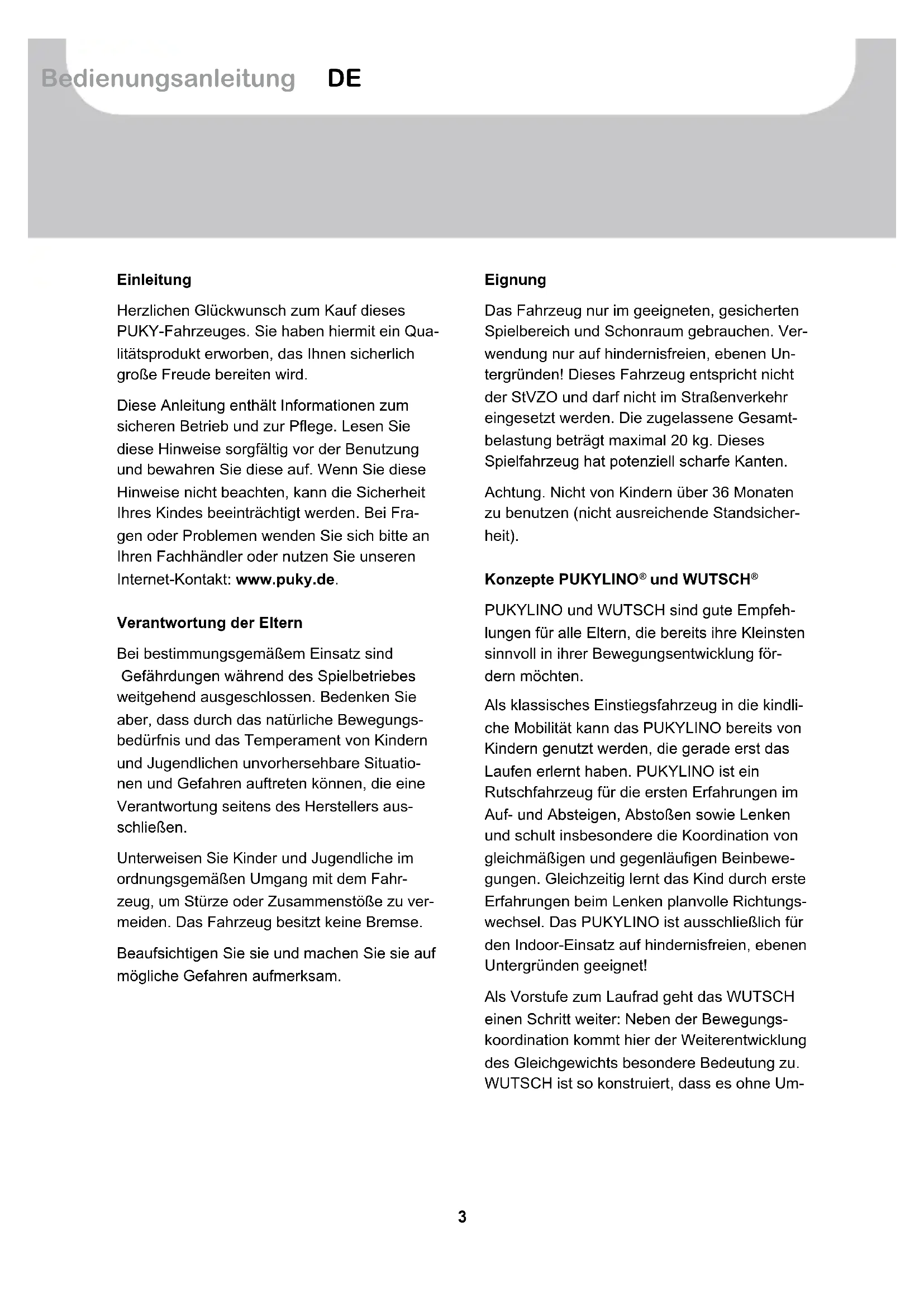 PUKYLINO und WUTSCH sind gute Empfeh- lungen für alle Eltern, die bereits ihre Kleinsten sinnvoll in ihrer Bewegungsentwicklung för- dern möchten. Als klassisches Einstiegsfahrzeug in die kindli- che Mobilität kann das PUKYLINO bereits von Kindern genutzt werden, die gerade erst das Laufen erlernt haben. PUKYLINO ist ein Rutschfahrzeug für die ersten Erfahrungen im Auf- und Absteigen, Abstoßen sowie Lenken und schult insbesondere die Koordination von gleichmäßigen und gegenläufigen Beinbewe- gungen. Gleichzeitig lernt das Kind durch erste Erfahrungen beim Lenken planvolle Richtungs- wechsel. Das PUKYLINO ist ausschließlich für den Indoor-Einsatz auf hindernisfreien, ebenen Untergründen geeignet! Als Vorstufe zum Laufrad geht das WUTSCH einen Schritt weiter: Neben der Bewegungs- koordination kommt hier der Weiterentwicklung des Gleichgewichts besondere Bedeutung zu. WUTSCH ist so konstruiert, dass es ohne Um- Inhalt4 PUKYLINO & WUTSCH zufallen selbst auf seinen Rädern steht, aber im Laufbetrieb durch die Füße des Kindes zusätzlich mit abgestützt werden muss. Neben hohem Fahrspaß erfährt das Kind mit dem WUTSCH eine ausgezeichnete Weiterentwick- lung von Gleichgewicht und Bewegungskoordi- nation. Benutzungshinweise Es ist erforderlich geschlossene Schuhe zu tragen. Das Fahrzeug darf nicht in der Nähe von Treppen, abschüssigem Gelände, Schwimmbecken und anderen Gewässern gefahren werden. Treppen im Umfeld sind so zu sichern, dass Kinder sie auf keinen Fall mit dem Fahrzeug hinauf- oder hinunterfahren können. Es gilt die gesetzliche Sachmängelhaftung. Schäden die durch unsachgemäße Beanspru- chung, Gewalteinwirkung, ungenügende War- tung oder durch normale Abnutzung entste- hen, sind von der Sachmängelhaftung ausge- schlossen. CE-Kennzeichnung Das Fahrzeug erfüllt die Anforderungen der europäischen Richtlinie 2009/48/EG über die Sicherheit von Spielzeug und trägt daher die CE-Kennzeichnung. Typenschild Das Typenschild ist unterhalb am hinteren Rahmen angebracht. Notieren Sie die Anga- ben auf dem Typenschild im Fahrzeugpass am Ende dieser Bedienungsanleitung, um sie bei Fragen oder Ersatzteilbestellungen zur Hand zu haben. Wartung und Pflege Überprüfen Sie vor dem Gebrauch alle Teile auf möglichen Verschleiß, sowie Verschrau- bungen auf ordnungsgemäßen Sitz. Selbst- sichernde Muttern sind schwergängig und müssen nach vollständiger Demontage ersetzt werden! Damit das hohe, konstruktiv vorgegebene Si- cherheitsniveau erhalten bleibt, sind verschlis- sene oder defekte Teile sofort gegen Original PUKY-Ersatzteile auszutauschen. Das Fahr- zeug sollte bis zur Instandsetzung aus Sicher- heitsgründen nicht benutzt werden. Verbogene Teile nicht richten, sondern austauschen. Verschleißteile: Räder, Achsanschlag (nur bei WUTSCH) Das Fahrzeug darf nicht mit einem Hochdruck- reiniger gereinigt werden. Reinigen Sie das Fahrzeug mit einer leichten Seifenlösung und reiben Sie anschließend alles sorgfältig mit einem weichen Tuch trocken. Halten Sie korro- sionsfördernde Materialien (Streusalz, Meer- wasser, Dünger) von dem Fahrzeug fern. Das Fahrzeug darf nicht in feuchten Räumen gela- gert werden. Auspacken und Lieferumfang Benutzen Sie zum Öffnen der Verpackung und zum Entfernen von Schutzmaterial keine scharfen Gegenstände. Sie könnten verse- hentlich die Lackierung oder Teile des Fahr- zeuges beschädigen. ❚ Entnehmen Sie alle Teile aus der Verpackung. ❚ Entfernen Sie das Schutzmaterial. Halten Sie jegliches Verpackungsmaterial von Kin- dern fern, es besteht Erstickungsgefahr.5 Bedienungsanleitung DEPUKYLINO & WUTSCH ❚ Prüfen Sie die Vollständigkeit und Unver- sehrtheit der Lieferung. Falls etwas fehlen sollte, dann wenden Sie sich bitte vor Be- ginn weiterer Arbeiten an Ihren Fachhändler. Lieferumfang PUKYLINO