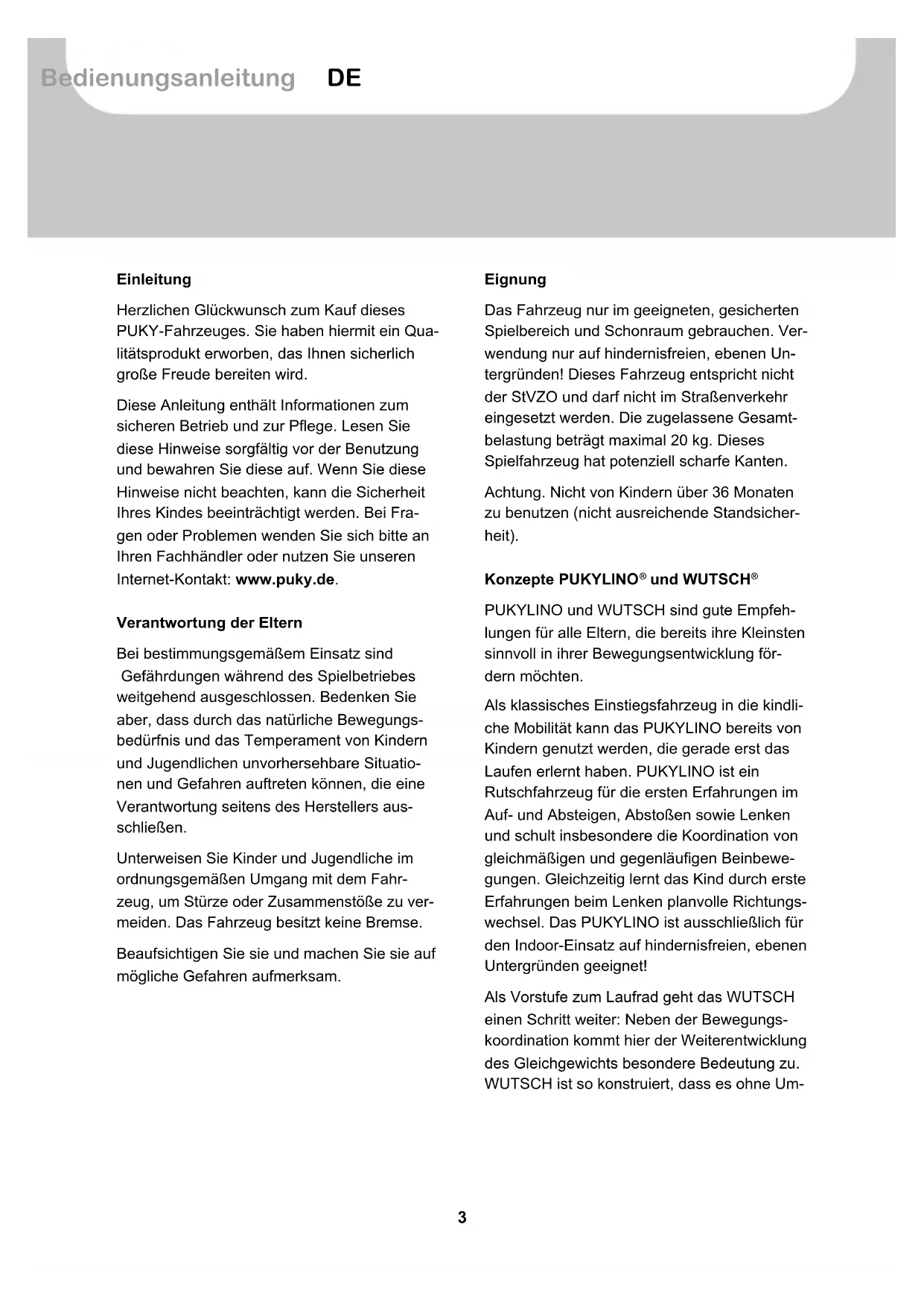 PUKYLINO und WUTSCH sind gute Empfeh- lungen für alle Eltern, die bereits ihre Kleinsten sinnvoll in ihrer Bewegungsentwicklung för- dern möchten. Als klassisches Einstiegsfahrzeug in die kindli- che Mobilität kann das PUKYLINO bereits von Kindern genutzt werden, die gerade erst das Laufen erlernt haben. PUKYLINO ist ein Rutschfahrzeug für die ersten Erfahrungen im Auf- und Absteigen, Abstoßen sowie Lenken und schult insbesondere die Koordination von gleichmäßigen und gegenläufigen Beinbewe- gungen. Gleichzeitig lernt das Kind durch erste Erfahrungen beim Lenken planvolle Richtungs- wechsel. Das PUKYLINO ist ausschließlich für den Indoor-Einsatz auf hindernisfreien, ebenen Untergründen geeignet! Als Vorstufe zum Laufrad geht das WUTSCH einen Schritt weiter: Neben der Bewegungs- koordination kommt hier der Weiterentwicklung des Gleichgewichts besondere Bedeutung zu. WUTSCH ist so konstruiert, dass es ohne Um- Inhalt4 PUKYLINO & WUTSCH zufallen selbst auf seinen Rädern steht, aber im Laufbetrieb durch die Füße des Kindes zusätzlich mit abgestützt werden muss. Neben hohem Fahrspaß erfährt das Kind mit dem WUTSCH eine ausgezeichnete Weiterentwick- lung von Gleichgewicht und Bewegungskoordi- nation. Benutzungshinweise Es ist erforderlich geschlossene Schuhe zu tragen. Das Fahrzeug darf nicht in der Nähe von Treppen, abschüssigem Gelände, Schwimmbecken und anderen Gewässern gefahren werden. Treppen im Umfeld sind so zu sichern, dass Kinder sie auf keinen Fall mit dem Fahrzeug hinauf- oder hinunterfahren können. Es gilt die gesetzliche Sachmängelhaftung. Schäden die durch unsachgemäße Beanspru- chung, Gewalteinwirkung, ungenügende War- tung oder durch normale Abnutzung entste- hen, sind von der Sachmängelhaftung ausge- schlossen. CE-Kennzeichnung Das Fahrzeug erfüllt die Anforderungen der europäischen Richtlinie 2009/48/EG über die Sicherheit von Spielzeug und trägt daher die CE-Kennzeichnung. Typenschild Das Typenschild ist unterhalb am hinteren Rahmen angebracht. Notieren Sie die Anga- ben auf dem Typenschild im Fahrzeugpass am Ende dieser Bedienungsanleitung, um sie bei Fragen oder Ersatzteilbestellungen zur Hand zu haben. Wartung und Pflege Überprüfen Sie vor dem Gebrauch alle Teile auf möglichen Verschleiß, sowie Verschrau- bungen auf ordnungsgemäßen Sitz. Selbst- sichernde Muttern sind schwergängig und müssen nach vollständiger Demontage ersetzt werden! Damit das hohe, konstruktiv vorgegebene Si- cherheitsniveau erhalten bleibt, sind verschlis- sene oder defekte Teile sofort gegen Original PUKY-Ersatzteile auszutauschen. Das Fahr- zeug sollte bis zur Instandsetzung aus Sicher- heitsgründen nicht benutzt werden. Verbogene Teile nicht richten, sondern austauschen. Verschleißteile: Räder, Achsanschlag (nur bei WUTSCH) Das Fahrzeug darf nicht mit einem Hochdruck- reiniger gereinigt werden. Reinigen Sie das Fahrzeug mit einer leichten Seifenlösung und reiben Sie anschließend alles sorgfältig mit einem weichen Tuch trocken. Halten Sie korro- sionsfördernde Materialien (Streusalz, Meer- wasser, Dünger) von dem Fahrzeug fern. Das Fahrzeug darf nicht in feuchten Räumen gela- gert werden. Auspacken und Lieferumfang Benutzen Sie zum Öffnen der Verpackung und zum Entfernen von Schutzmaterial keine scharfen Gegenstände. Sie könnten verse- hentlich die Lackierung oder Teile des Fahr- zeuges beschädigen. ❚ Entnehmen Sie alle Teile aus der Verpackung. ❚ Entfernen Sie das Schutzmaterial. Halten Sie jegliches Verpackungsmaterial von Kin- dern fern, es besteht Erstickungsgefahr.5 Bedienungsanleitung DEPUKYLINO & WUTSCH ❚ Prüfen Sie die Vollständigkeit und Unver- sehrtheit der Lieferung. Falls etwas fehlen sollte, dann wenden Sie sich bitte vor Be- ginn weiterer Arbeiten an Ihren Fachhändler. Lieferumfang PUKYLINO