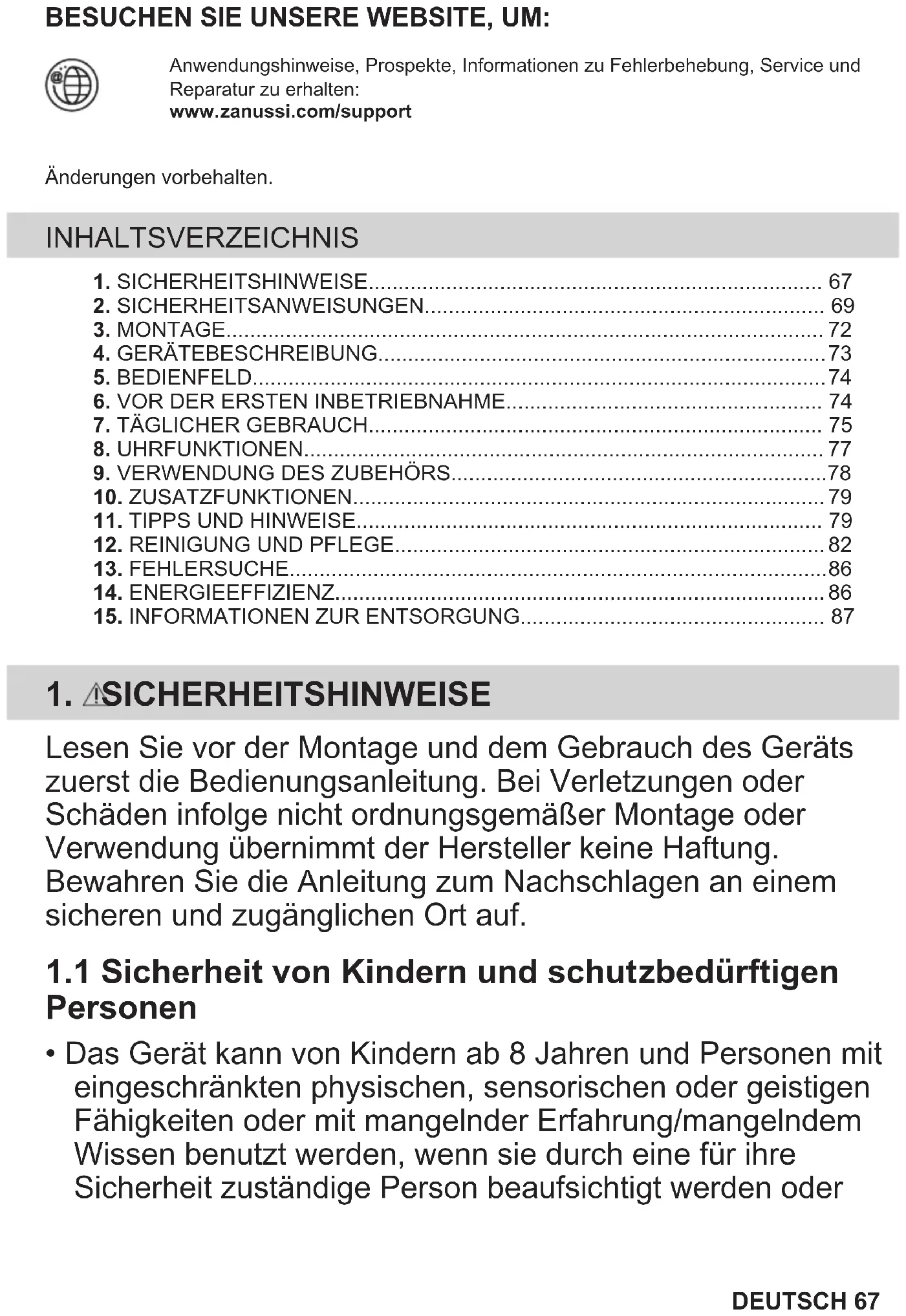 Ihre Pflichten als Endnutzer Dieses Elektro- bzw. Elektronikgerät ist mit einer durchgestrichenen Abfalltonne auf Rädern gekennzeichnet. Das Gerät darf deshalb nur getrennt vom unsortierten Siedlungsabfall gesammelt und zurückgenommen werden, es darf also nicht in den Hausmüll gegeben werden. Das Gerät kann z. B. bei einer kommunalen Sammelstelle oder ggf. bei einem Vertreiber (siehe zu deren Rücknahmepflichten unten) abgegeben werden. Das gilt auch für alle DEUTSCH 87Bauteile, Unterbaugruppen und Verbrauchsmaterialien des zu entsorgenden Altgeräts. Bevor das Altgerät entsorgt werden darf, müssen alle Altbatterien und Altakkumulatoren vom Altgerät getrennt werden, die nicht vom Altgerät umschlossen sind. Das gleiche gilt für Lampen, die zerstörungsfrei aus dem Altgerät entnommen werden können. Der Endnutzer ist zudem selbst dafür verantwortlich, personenbezogene Daten auf dem Altgerät zu löschen. Hinweise zum Recycling Helfen Sie mit, alle Materialien zu recyceln, die mit diesem Symbol gekennzeichnet sind. Entsorgen Sie solche Materialien, insbesondere Verpackungen, nicht im Hausmüll sondern über die bereitgestellten Recyclingbehälter oder die entsprechenden örtlichen Sammelsysteme. Recyceln Sie zum Umwelt- und Gesundheitsschutz auch elektrische und elektronische Geräte. Rücknahmepflichten der Vertreiber in Deutschland Wer auf mindestens 400 m² Verkaufsfläche Elektro- und Elektronikgeräte vertreibt oder sonst geschäftlich an Endnutzer abgibt, ist verpflichtet, bei Abgabe eines neuen Geräts ein Altgerät des Endnutzers der gleichen Geräteart, das im Wesentlichen die gleichen Funktionen wie das neue Gerät erfüllt, am Ort der Abgabe oder in unmittelbarer Nähe hierzu unentgeltlich zurückzunehmen. Das gilt auch für Vertreiber von Lebensmitteln mit einer Gesamtverkaufsfläche von mindestens 800 m², die mehrmals im Kalenderjahr oder dauerhaft Elektro- und Elektronikgeräte anbieten und auf dem Markt bereitstellen. Solche Vertreiber müssen zudem auf Verlangen des Endnutzers Altgeräte, die in keiner äußeren Abmessung größer als 25 cm sind (kleine Elektrogeräte), im Einzelhandelsgeschäft oder in unmittelbarer Nähe hierzu unentgeltlich zurückzunehmen; die Rücknahme darf in diesem Fall nicht an den Kauf eines Elektro- oder Elektronikgerätes geknüpft, kann aber auf drei Altgeräte pro Geräteart beschränkt werden. Ort der Abgabe ist auch der private Haushalt, wenn das neue Elektro- oder Elektronikgerät dorthin geliefert wird; in diesem Fall ist die Abholung des Altgerätes für den Endnutzer kostenlos. Die vorstehenden Pflichten gelten auch für den Vertrieb unter Verwendung von Fernkommunikationsmitteln, wenn die Vertreiber Lager- und Versandflächen für Elektro- und Elektronikgeräte bzw. Gesamtlager- und -versandflächen für Lebensmittel vorhalten, die den oben genannten Verkaufsflächen entsprechen. Die unentgeltliche Abholung von Elektro- und Elektronikgeräten ist dann aber auf Wärmeüberträger (z. B. Kühlschrank), Bildschirme, Monitore und Geräte, die Bildschirme mit einer Oberfläche von mehr als 100 cm² enthalten, und Geräte beschränkt, bei denen mindestens eine der äußeren Abmessungen mehr als 50 cm beträgt. Für alle übrigen Elektro- und Elektronikgeräte muss der Vertreiber geeignete Rückgabemöglichkeiten in zumutbarer Entfernung zum jeweiligen Endnutzer gewährleisten; das gilt auch für kleine Elektrogeräte (s.o.), die der Endnutzer zurückgeben will, ohne ein neues Gerät zu kaufen. Rücknahmepflichten von Vertreibern und andere Möglichkeiten der Entsorgung von Elektro- und Elektronikgeräten in der Region Wallonien Vertreiber, die Elektro- und Elektronikgeräte verkaufen, sind verpflichtet, bei der Lieferung von Neugeräten Altgeräte desselben Typs, die im Wesentlichen die gleichen Funktionen wie die Neugeräte erfüllen, kostenlos vom Endverbraucher zurückzunehmen. Dies gilt auch bei der Lieferung von neuen Elektro- und Elektronikgeräten oder beim Fernabsatz. Darüber hinaus ist jeder, der Elektro- und Elektronikgeräte auf einer Verkaufsfläche von 88 DEUTSCHmindestens 400 m² verkauft, verpflichtet, Altgeräte, die in keiner äußeren Abmessung größer als 25 cm sind (Elektrokleingeräte), im Ladengeschäft oder in unmittelbarer Nähe kostenlos zurückzunehmen; die Rücknahme darf in diesem Fall nicht vom Kauf eines Elektro- oder Elektronikgerätes abhängig gemacht werden. Die Rücknahme von Elektro- und Elektronikgeräten kann auch auf Containerplätzen oder zugelassenen Recyclinghöfen erfolgen. Für weitere Informationen wenden Sie sich bitte an Ihre Gemeindeverwaltung. DEUTSCH 89ΕΠΙΣΚΕΦΘΕΙΤΕ ΤΟΝ ΙΣΤΟΤΟΠΟ ΜΑΣ ΓΙΑ ΝΑ: Βρείτε υποδείξεις χρήσης, φυλλάδια, συμβουλές για την επίλυση προβλημάτων,πληροφορίες σέρβις και επισκευής:www.zanussi.com/supportΥπόκειται αε αλλαγές χωρίς προειδποίηση. ΠΕΡΙΕΧΟΜΕΝΑ