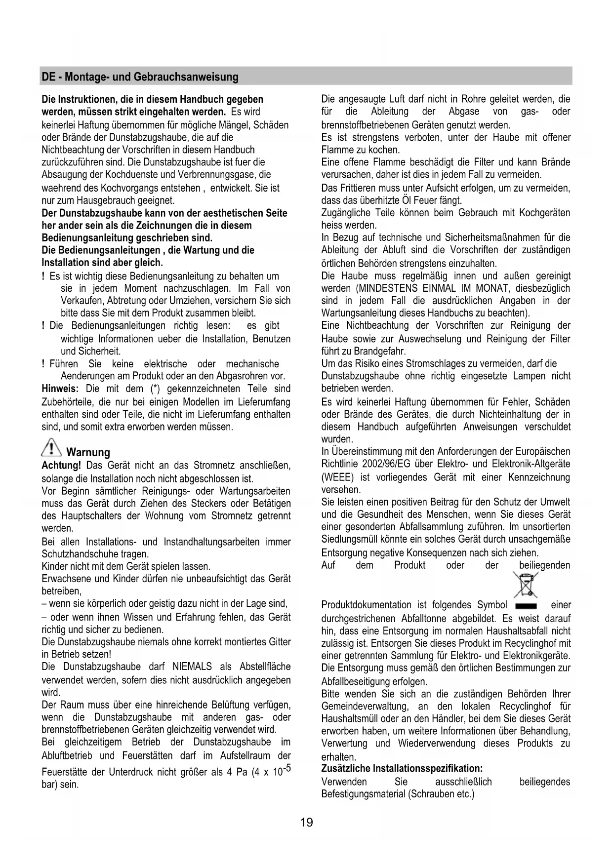 recommendations of the cooker hood and replacement of the filters may cause fire risks. Therefore, we recommend observing these instructions. The manufacturer declines all responsibility for any damage to the motor or any fire damage linked to inappropriate maintenance or failure to observe the above safety recommendations. Grease filter Fig. 19-25 Traps cooking grease particles. This must be cleaned once a month (or when the filter saturation indication system – if envisaged on the model in possession – indicates this necessity) using non aggressive detergents, either by hand or in the dishwasher, which must be set to a low temperature and a short cycle. When washed in a dishwasher, the grease filter may discolour slightly, but this does not affect its filtering capacity. To remove the grease filter, pull the spring release handle. Charcoal filter (filter version only) Fig. 23 It absorbs unpleasant odours caused by cooking. The charcoal filter can be washed every two months (or when the filter saturation signal system - if present on your model - shows such need) in hot water and suitable detergents or in the dishwasher at 65°C (in this case run a complete wash cycle with no dishes inside). Remove excess water without damaging the filter and then put the filter back in the oven for 10 minutes at 100°C to dry it definitively. Replace the pad every 3 years and every time the cloth is damaged. Replacing lamps The hood is equipped with a lighting system based on LED technology. The LEDs guarantee an optimum lighting, a duration up to 10 times as long as the traditional lamps and allow to save 90% electrical energy. For replacement, contact the technical service.19 DE - Montage- und Gebrauchsanweisung Die Instruktionen, die in diesem Handbuch gegeben werden, müssen strikt eingehalten werden. Es wird keinerlei Haftung übernommen für mögliche Mängel, Schäden oder Brände der Dunstabzugshaube, die auf die Nichtbeachtung der Vorschriften in diesem Handbuch zurückzuführen sind. Die Dunstabzugshaube ist fuer die Absaugung der Kochduenste und Verbrennungsgase, die waehrend des Kochvorgangs entstehen , entwickelt. Sie ist nur zum Hausgebrauch geeignet. Der Dunstabzugshaube kann von der aesthetischen Seite her ander sein als die Zeichnungen die in diesem Bedienungsanleitung geschrieben sind. Die Bedienungsanleitungen , die Wartung und die Installation sind aber gleich. ! Es ist wichtig diese Bedienungsanleitung zu behalten um sie in jedem Moment nachzuschlagen. Im Fall von Verkaufen, Abtretung oder Umziehen, versichern Sie sich bitte dass Sie mit dem Produkt zusammen bleibt. ! Die Bedienungsanleitungen richtig lesen: es gibt wichtige Informationen ueber die Installation, Benutzen und Sicherheit. ! Führen Sie keine elektrische oder mechanische Aenderungen am Produkt oder an den Abgasrohren vor. Hinweis: Die mit dem (*) gekennzeichneten Teile sind Zubehörteile, die nur bei einigen Modellen im Lieferumfang enthalten sind oder Teile, die nicht im Lieferumfang enthalten sind, und somit extra erworben werden müssen. Warnung Achtung! Das Gerät nicht an das Stromnetz anschließen, solange die Installation noch nicht abgeschlossen ist. Vor Beginn sämtlicher Reinigungs- oder Wartungsarbeiten muss das Gerät durch Ziehen des Steckers oder Betätigen des Hauptschalters der Wohnung vom Stromnetz getrennt werden. Bei allen Installations- und Instandhaltungsarbeiten immer Schutzhandschuhe tragen. Kinder nicht mit dem Gerät spielen lassen. Erwachsene und Kinder dürfen nie unbeaufsichtigt das Gerät betreiben, – wenn sie körperlich oder geistig dazu nicht in der Lage sind, – oder wenn ihnen Wissen und Erfahrung fehlen, das Gerät richtig und sicher zu bedienen. Die Dunstabzugshaube niemals ohne korrekt montiertes Gitter in Betrieb setzen! Die Dunstabzugshaube darf NIEMALS als Abstellfläche verwendet werden, sofern dies nicht ausdrücklich angegeben wird. Der Raum muss über eine hinreichende Belüftung verfügen, wenn die Dunstabzugshaube mit anderen gas- oder brennstoffbetriebenen Geräten gleichzeitig verwendet wird. Bei gleichzeitigem Betrieb der Dunstabzugshaube im Abluftbetrieb und Feuerstätten darf im Aufstellraum der Feuerstätte der Unterdruck nicht größer als 4 Pa (4 x 10