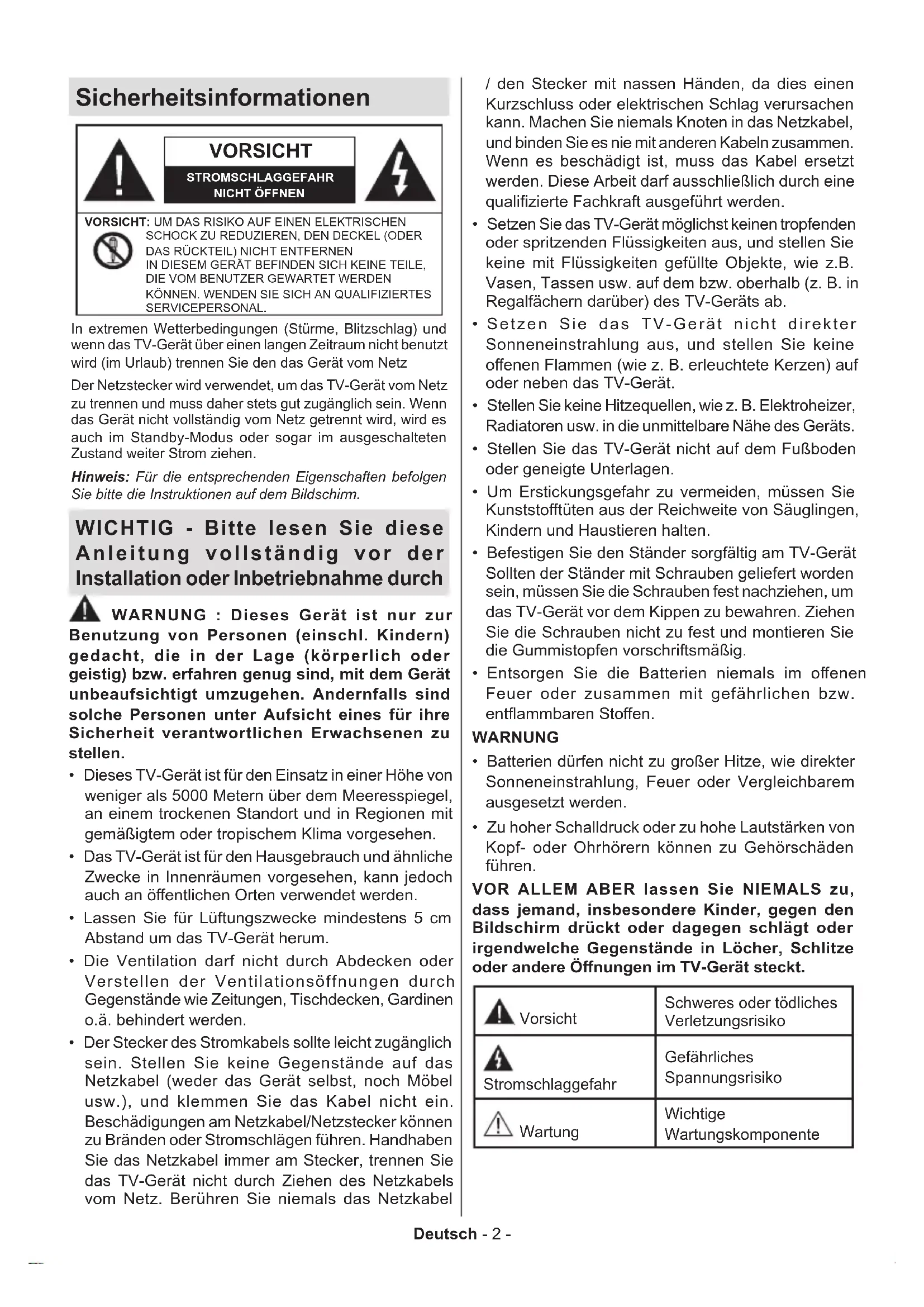 - Zu hoher Schalldruck oder zu hohe Lautstärken von Kopf- oder Ohrhörern können zu Gehörschäden führen. VOR ALLEM ABER lassen Sie NIEMALS zu, dass jemand, insbesondere Kinder, gegen den Bildschirm drückt oder dagegen schlägt oder irgendwelche Gegenstände in Löcher, Schlitze oder andere Önungen im TV-Gerät steckt. Vorsicht Schweres oder tödliches Verletzungsrisiko Stromschlaggefahr Gefährliches Spannungsrisiko Wartung Wichtige WartungskomponenteDeutsch - 3 - Kennzeichnungen auf dem Gerät Die folgenden Symbole werden auf dem Gerät als Kennzeichnungen für Einschränkungen und Vorsichtsmaßnahmen sowie Sicherheitshinweise