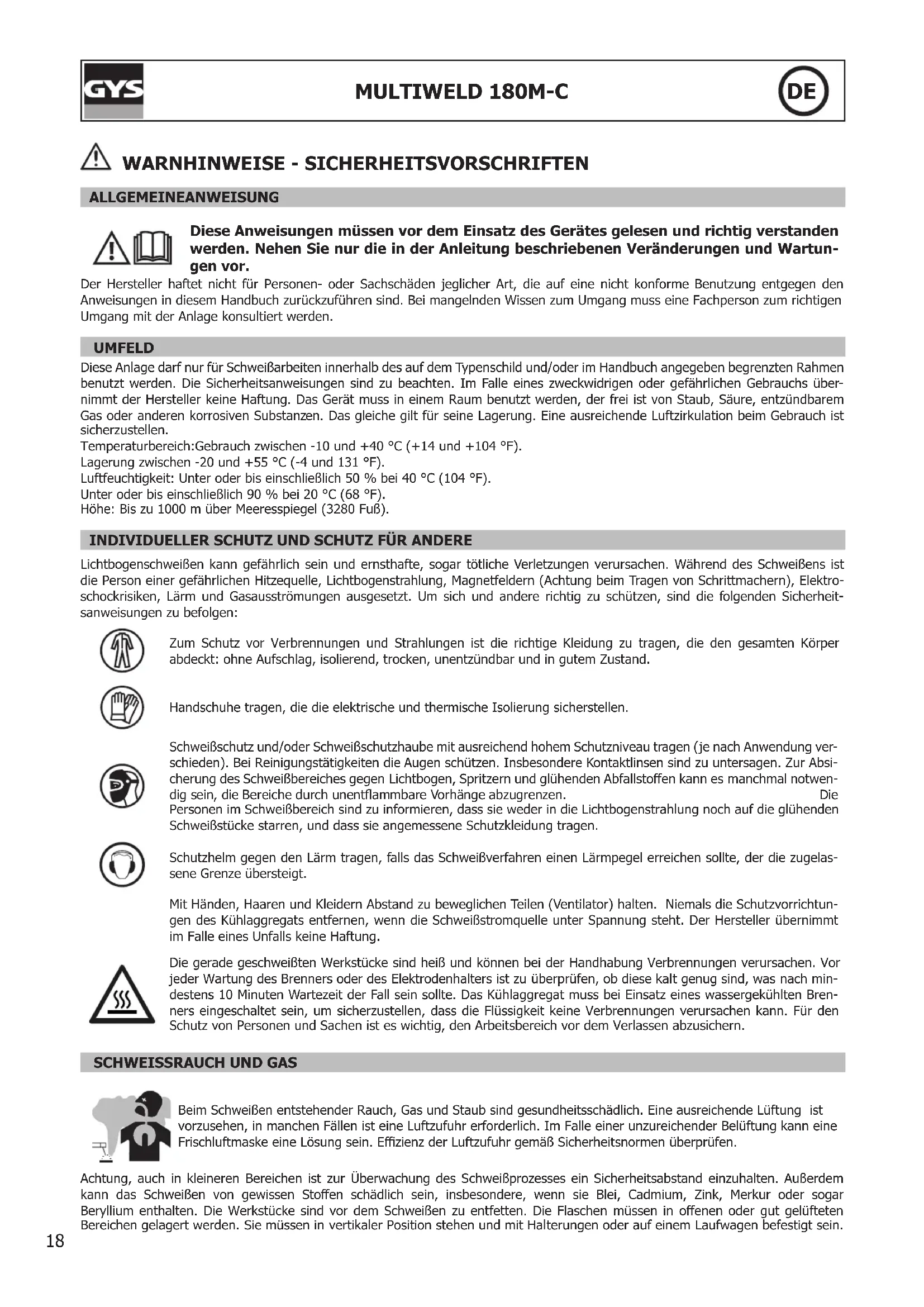 Beim Schweißen entstehender Rauch, Gas und Staub sind gesundheitsschädlich. Eine ausreichende Lüftung ist vorzusehen, in manchen Fällen ist eine Luftzufuhr erforderlich. Im Falle einer unzureichender Belüftung kann eine Frischluftmaske eine Lösung sein. Ezienz der Luftzufuhr gemäß Sicherheitsnormen überprüfen. Achtung, auch in kleineren Bereichen ist zur Überwachung des Schweißprozesses ein Sicherheitsabstand einzuhalten. Außerdem kann das Schweißen von gewissen Stoen schädlich sein, insbesondere, wenn sie Blei, Cadmium, Zink, Merkur oder sogar Beryllium enthalten. Die Werkstücke sind vor dem Schweißen zu entfetten. Die Flaschen müssen in oenen oder gut gelüfteten Bereichen gelagert werden. Sie müssen in vertikaler Position stehen und mit Halterungen oder auf einem Laufwagen befestigt sein.19 MULTIWELD 180M-C