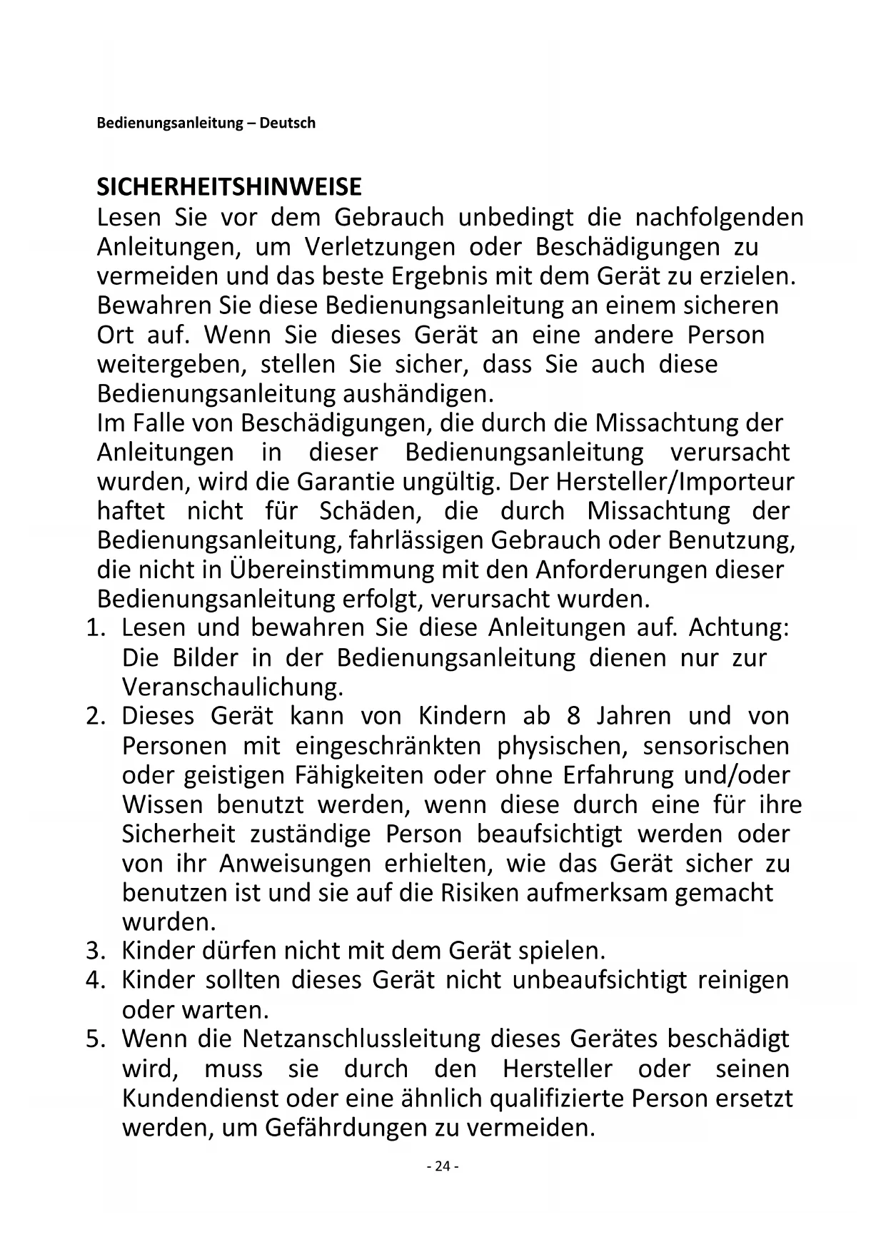 wird, muss sie durch den Hersteller oder seinen Kundendienst oder eine ähnlich qualifizierte Person ersetzt werden, um Gefährdungen zu vermeiden.- 25 -