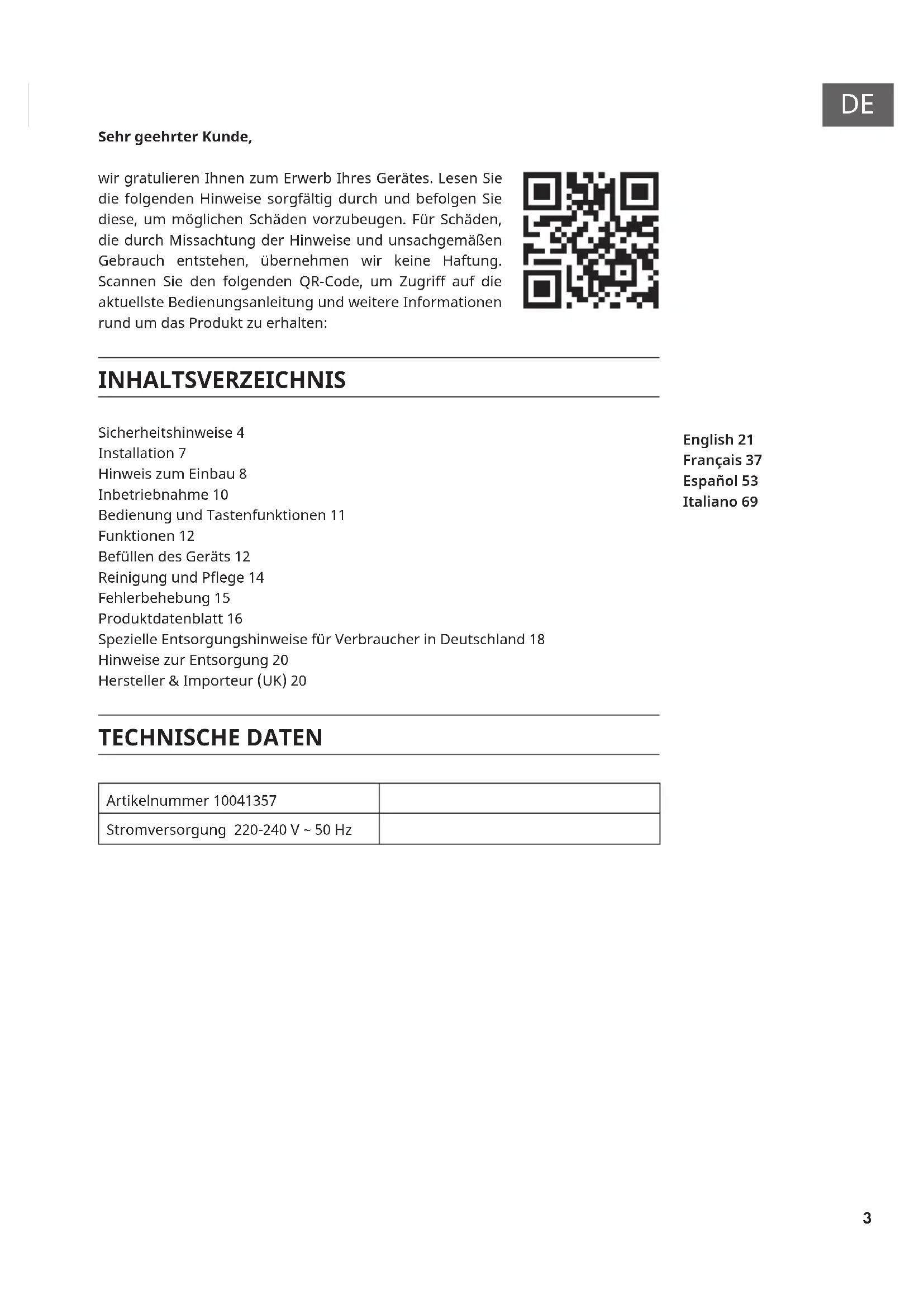 Sehr geehrter Kunde, wir gratulieren Ihnen zum Erwerb Ihres Gerätes. Lesen Sie die folgenden Hinweise sorgfältig durch und befolgen Sie diese, um möglichen Schäden vorzubeugen. Für Schäden, die durch Missachtung der Hinweise und unsachgemäßen Gebrauch entstehen, übernehmen wir keine Haftung. Scannen Sie den folgenden QR-Code, um Zugriff auf die aktuellste Bedienungsanleitung und weitere Informationen rund um das Produkt zu erhalten: INHALTSVERZEICHNIS Sicherheitshinweise 4 Installation 7 Hinweis zum Einbau 8 Inbetriebnahme 10 Bedienung und Tastenfunktionen 11 Funktionen 12 Befüllen des Geräts 12 Reinigung und Pege 14 Fehlerbehebung 15 Produktdatenblatt 16 Spezielle Entsorgungshinweise für Verbraucher in Deutschland 18 Hinweise zur Entsorgung 20 Hersteller & Importeur (UK) 20 TECHNISCHE DATEN Artikelnummer 10041357 Stromversorgung 220-240 V ~ 50 Hz English 21 Français 37 Español 53 Italiano 694