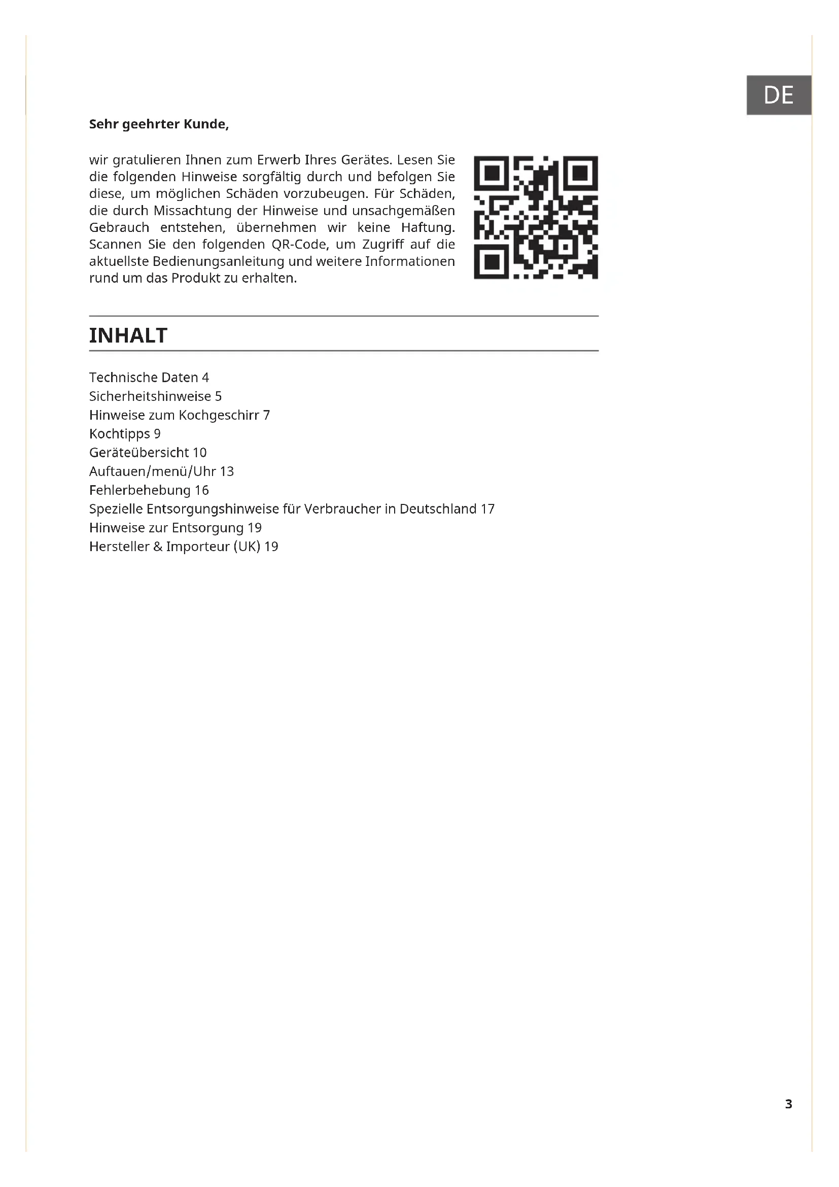 Sehr geehrter Kunde, wir gratulieren Ihnen zum Erwerb Ihres Gerätes. Lesen Sie die folgenden Hinweise sorgfältig durch und befolgen Sie diese, um möglichen Schäden vorzubeugen. Für Schäden, die durch Missachtung der Hinweise und unsachgemäßen Gebrauch entstehen, übernehmen wir keine Haftung. Scannen Sie den folgenden QR-Code, um Zugriff auf die aktuellste Bedienungsanleitung und weitere Informationen rund um das Produkt zu erhalten. Technische Daten 4 Sicherheitshinweise 5 Hinweise zum Kochgeschirr 7 Kochtipps 9 Geräteübersicht 10 Auftauen/menü/Uhr 13 Fehlerbehebung 16 Spezielle Entsorgungshinweise für Verbraucher in Deutschland 17 Hinweise zur Entsorgung 19 Hersteller & Importeur (UK) 19 INHALT4
