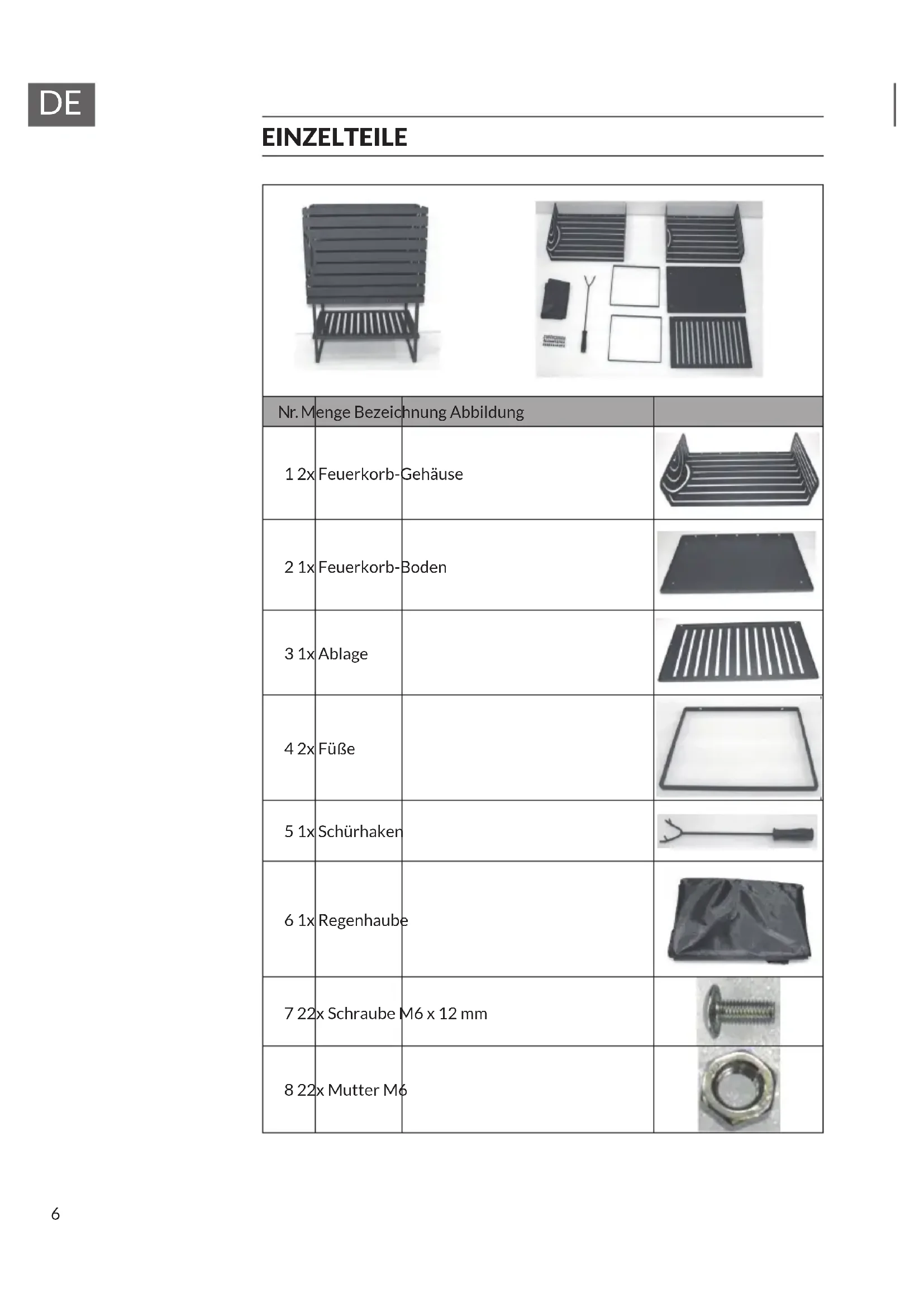 EINZELTEILE Nr. Menge Bezeichnung Abbildung 1 2x Feuerkorb-Gehäuse 2 1x Feuerkorb-Boden 3 1x Ablage 4 2x Füße 5 1x Schürhaken 6 1x Regenhaube 7 22x Schraube M6 x 12 mm 8 22x Mutter M67