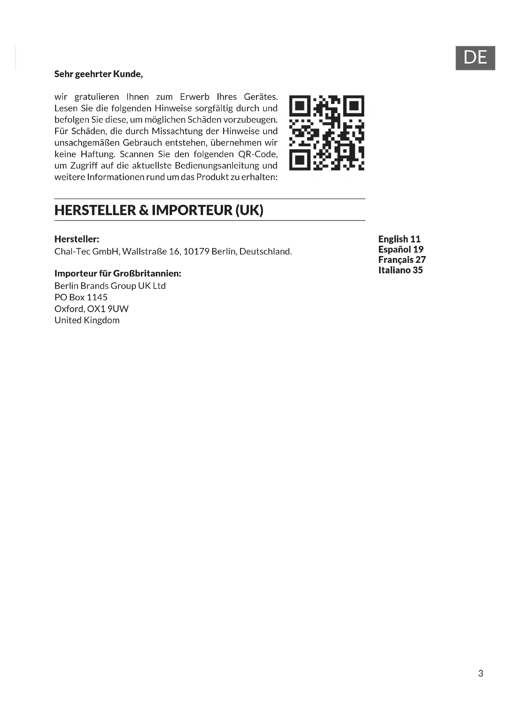 Sehr geehrter Kunde, wir gratulieren Ihnen zum Erwerb Ihres Gerätes. Lesen Sie die folgenden Hinweise sorgfältig durch und befolgen Sie diese, um möglichen Schäden vorzubeugen. Für Schäden, die durch Missachtung der Hinweise und unsachgemäßen Gebrauch entstehen, übernehmen wir keine Haftung. Scannen Sie den folgenden QR-Code, um Zugriff auf die aktuellste Bedienungsanleitung und weitere Informationen rund um das Produkt zu erhalten: HERSTELLER & IMPORTEUR (UK) Hersteller: Chal-Tec GmbH, Wallstraße 16, 10179 Berlin, Deutschland. Importeur für Großbritannien: Berlin Brands Group UK Ltd PO Box 1145 Oxford, OX1 9UW United Kingdom English 11 Español 19 Français 27 Italiano 354