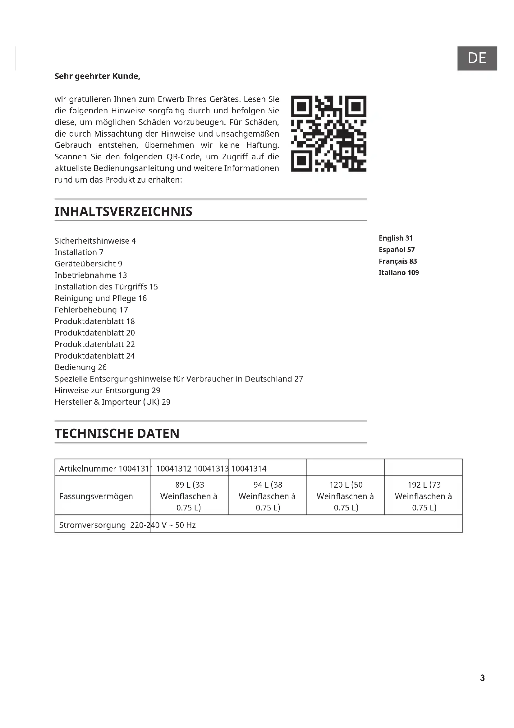 Sehr geehrter Kunde, wir gratulieren Ihnen zum Erwerb Ihres Gerätes. Lesen Sie die folgenden Hinweise sorgfältig durch und befolgen Sie diese, um möglichen Schäden vorzubeugen. Für Schäden, die durch Missachtung der Hinweise und unsachgemäßen Gebrauch entstehen, übernehmen wir keine Haftung. Scannen Sie den folgenden QR-Code, um Zugriff auf die aktuellste Bedienungsanleitung und weitere Informationen rund um das Produkt zu erhalten: INHALTSVERZEICHNIS Sicherheitshinweise 4 Installation 7 Geräteübersicht 9 Inbetriebnahme 13 Installation des Türgriffs 15 Reinigung und Pege 16 Fehlerbehebung 17 Produktdatenblatt 18 Produktdatenblatt 20 Produktdatenblatt 22 Produktdatenblatt 24 Bedienung 26 Spezielle Entsorgungshinweise für Verbraucher in Deutschland 27 Hinweise zur Entsorgung 29 Hersteller & Importeur (UK) 29 TECHNISCHE DATEN Artikelnummer 10041311 10041312 10041313 10041314 Fassungsvermögen 89 L (33 Weinaschen à