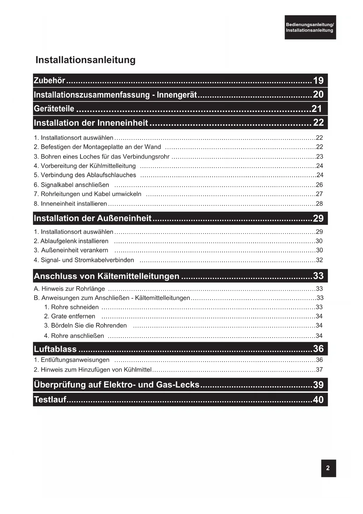 der Inneneinheit“ und „Installation der Außeneinheit“.