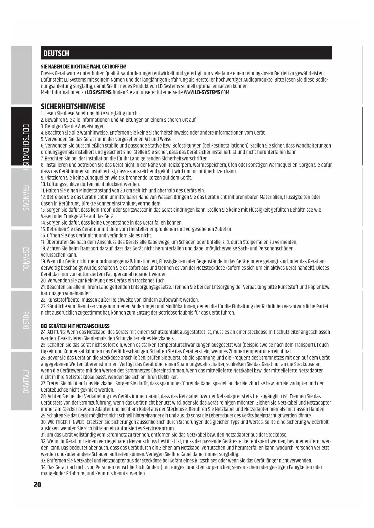 DEUTSCHFRANCAIS ESPAÑOL ENGLISH ITALIANO POLSKIDEUTSCH SIE HABEN DIE RICHTIGE WAHL GETROFFEN! Dieses Gerät wurde unter hohen Qualitätsanforderungen entwickelt und gefertigt, um viele Jahre einen reibungslosen Betrieb zu gewährleisten. Dafür steht LD Systems mit seinem Namen und der langjährigen Erfahrung als Hersteller hochwertiger Audioprodukte. Bitte lesen Sie diese Bedie- nungsanleitung sorgfältig, damit Sie Ihr neues Produkt von LD Systems schnell optimal einsetzen können. Mehr Informationen zu LD SYSTEMS nden Sie auf unserer Internetseite WWW.LD-SYSTEMS.COM SICHERHEITSHINWEISE