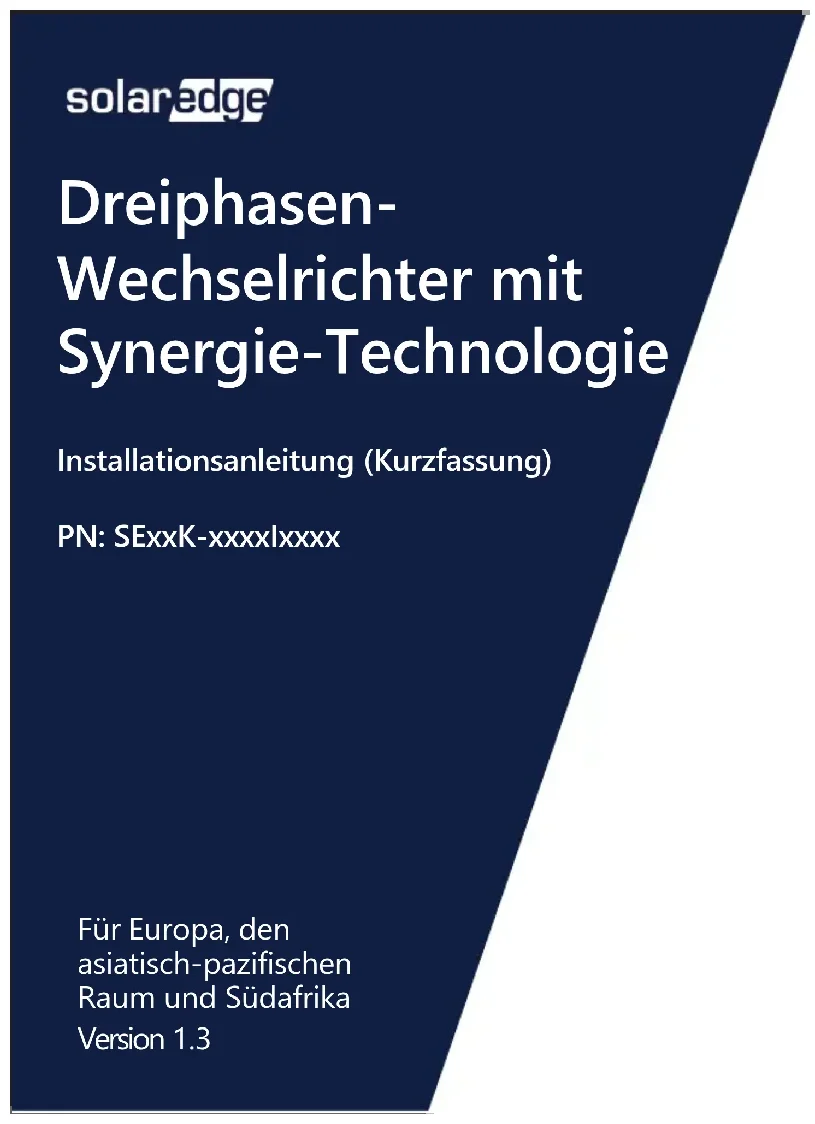 LED Indications 18Support Contact Information If you have technical problems concerning SolarEdge products, please contact us: https://www.solaredge.com/service/support Subject to change without notice. Copyright © SolarEdge Inc. All rights reserved. March 2021.Dreiphasen- Wechselrichter mit Synergie-Technologie Installationsanleitung (Kurzfassung) PN: SExxK-xxxxIxxxx Für Europa, den asiatisch-pazifischen Raum und Südafrika Version 1.3HINWEIS Dieses Symbol weist auf Informationen hin, die den Nutzer bei der optimalen Nutzung des Produkts unterstützen sollen. Das Symbol kennzeichnet Erdungspunkte in den Anleitungen und den Geräten von SolarEdge. ACHTUNG! Signalisiert eine Gefahr. Dieses Symbol warnt Sie bei Vorgängen, bei denen möglicherweise das Gerät beschädigt wird, wenn sie nicht korrekt oder ungenau ausgeführt werden. Arbeiten Sie bei einem Warnhinweis nicht weiter, bevor Sie den erläuterten Sachverhalt genau verstanden und die entsprechenden Maßnahmen ergriffen haben. Schalten Sie den AC-Schalter am Hauptverteiler EIN/AUS und warten Sie 5 Minuten. WARNUNG! Signalisiert eine Gefahr. Dieses Symbol warnt Sie bei Vorgängen, bei denen Verletzungs- oder Lebensgefahr besteht, wenn sie nicht korrekt oder ungenau ausgeführt werden. Arbeiten Sie bei einem Gefahrenhinweis nicht weiter, bevor Sie den erläuterten Sachverhalt genau verstanden und die entsprechenden Maßnahmen ergriffen haben. Schalten Sie den DC-Sicherheitsschalter EIN/AUS und warten Sie 5 Minuten. (Gilt nur für Modelle mit DC- Sicherheitsschalter) Steckverbinder nicht abschneiden.