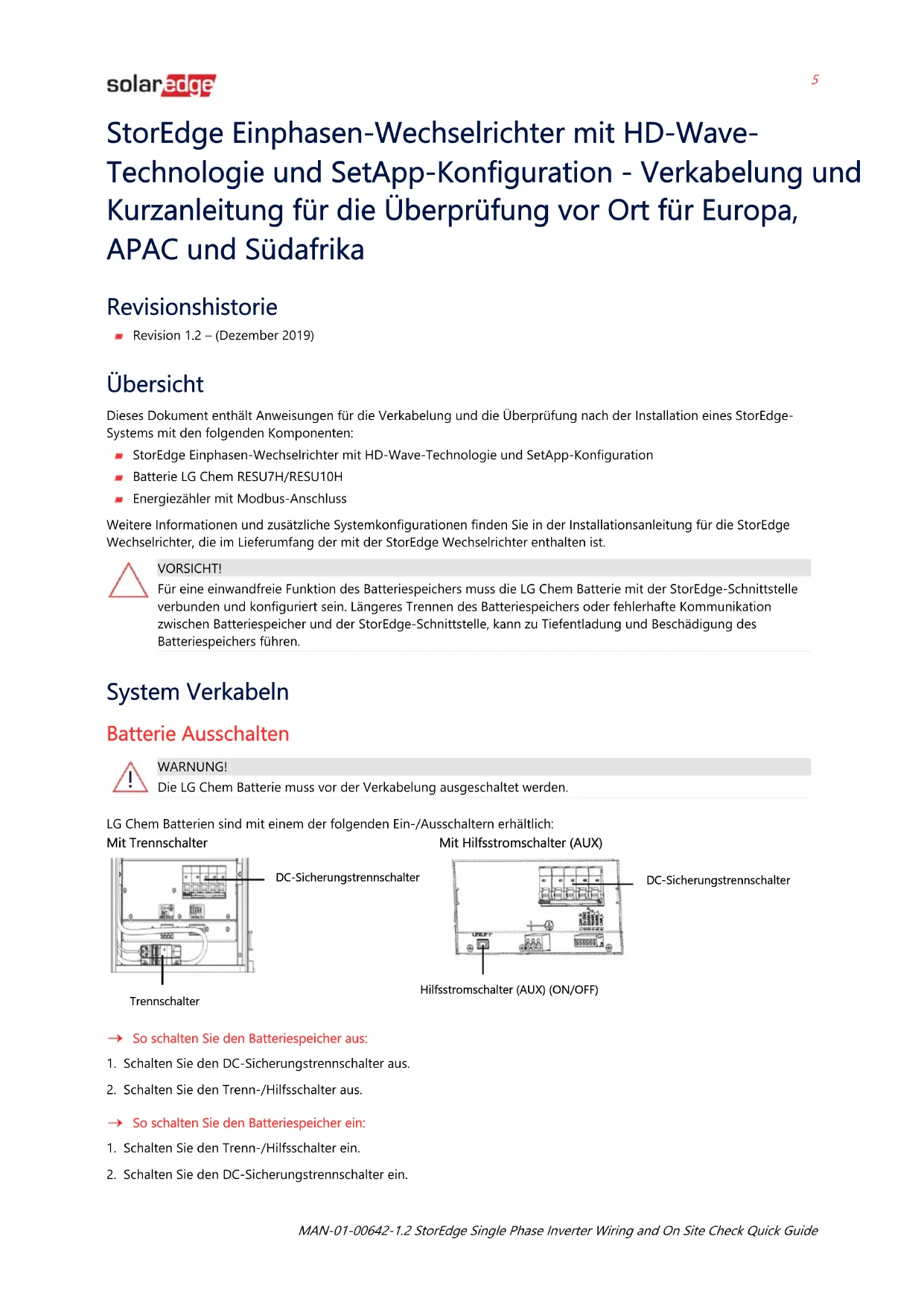 Support Contact Information If you have technical queries concerning our products, please contact us: http://https://www.solaredge.com/service/support Before contact, make sure to have the following information at hand: Model and serial number of the product in question. The error indicated on the product mobile application LCD screen or on the monitoring platform or by the LEDs, if there is such an indication. System configuration information, including the type and number of modules connected and the number and length of strings. The communication method to the server, if the site is connected. The product's software version as it appears in the ID status screen.5 MAN-01-00642-1.2 StorEdge Single Phase Inverter Wiring and On Site Check Quick Guide StorEdge Einphasen-Wechselrichter mit HD-Wave- Technologie und SetApp-Konfiguration - Verkabelung und Kurzanleitung für die Überprüfung vor Ort für Europa, APAC und Südafrika Revisionshistorie Revision 1.2 – (Dezember 2019) Übersicht Dieses Dokument enthält Anweisungen für die Verkabelung und die Überprüfung nach der Installation eines StorEdge-Systems mit den folgenden Komponenten: StorEdge Einphasen-Wechselrichter mit HD-Wave-Technologie und SetApp-Konfiguration Batterie LG Chem RESU7H/RESU10H Energiezähler mit Modbus-Anschluss Weitere Informationen und zusätzliche Systemkonfigurationen finden Sie in der Installationsanleitung für die StorEdge Wechselrichter, die im Lieferumfang der mit der StorEdge Wechselrichter enthalten ist.