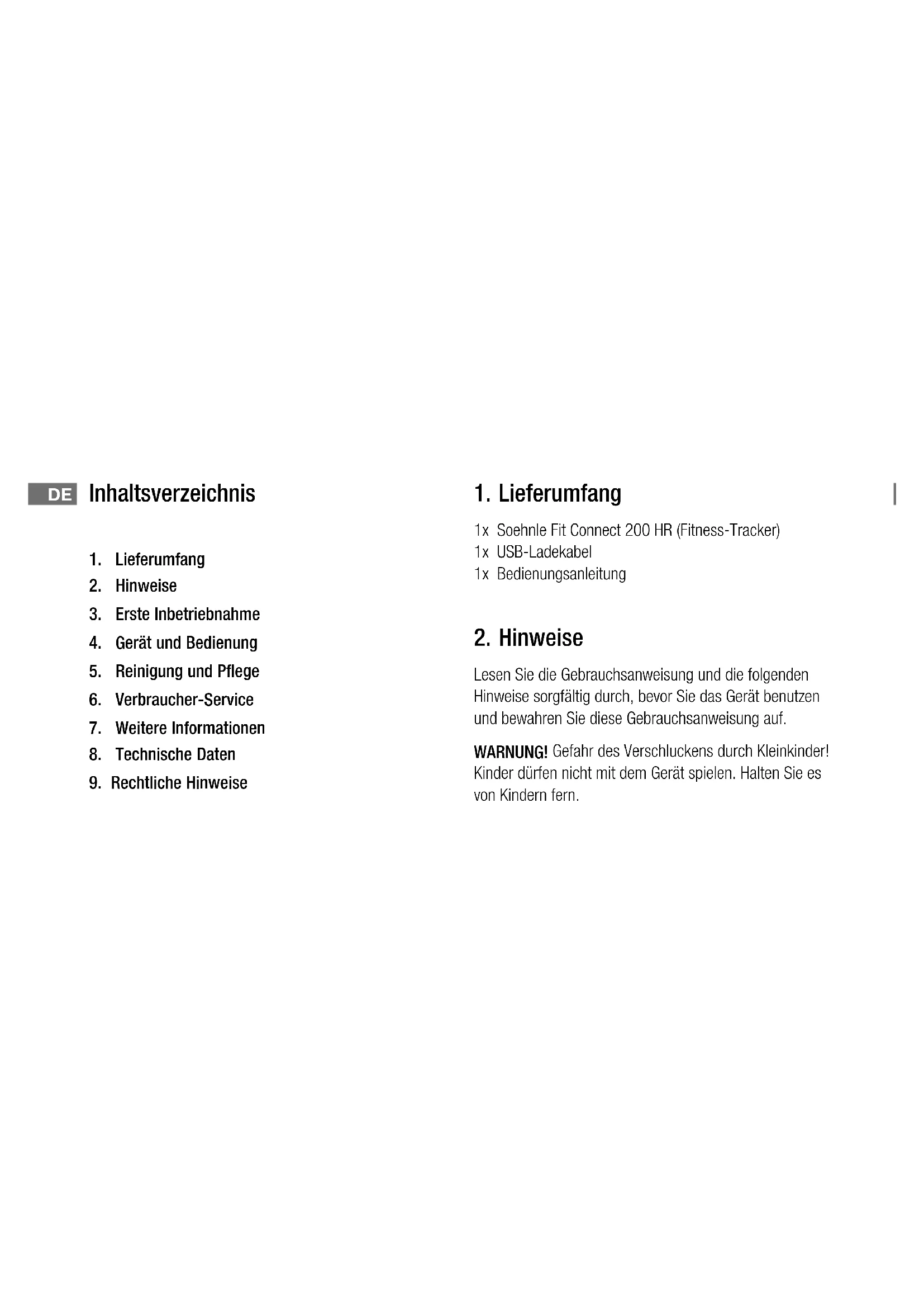 WARNUNG! Gefahr von Brand/Exposion oder Verätzun- gen! Der Artikel enthält einen Lithium-Polymer-Akku. Dieser darf nicht ausgebaut, auseinandergenommen, in Feuer geworfen oder kurzgeschlossen werden. ACHTUNG! Mögliche Sachschäden! Das Gerät ist spritzwassergeschützt, jedoch nicht wasserdicht. Halten Sie das Gerät nicht unter Wasser. ACHTUNG! Mögliche Sachschäden! Lassen Sie das Gerät nicht fallen und schützen Sie es vor Stößen. Setzen Sie das Gerät keinen extremen Temperaturen oder starken Temperaturschwankungen aus. Schützen Sie das Gerät auch vor direkter Sonneneinstrahlung und Staub. Verwenden Sie zum Reinigen keine scharfen Chemikalien, aggressive oder scheuernde Reinigungsmittel. Schützen Sie das Display vor harten und kratzenden Gegenständen. HINWEIS! Bestimmungsmäßiger Gebrauch: Das Produkt ist für den privaten, nicht-gewerblichen Haushaltsge- brauch vorgesehen. Es ist kein medizinisches Gerät. HINWEIS! Sollten Sie das Gerät über einen längeren Zeitraum nicht verwenden, laden Sie den Akku dennoch alle 3-6 Monate einmal komplett auf, um die Funktionsfä- higkeit des Akkus zu gewährleisten. Batterie-Entsorgung EG-Richtlinie 2008/12/EC Batterien und Akkus gehören nicht in den Hausmüll. Sie müssen Ihre alten Batterien oder Akkus bei den öffentlichen Sammel stellen in Ihrer Gemeinde oder überall dort abgeben, wo Batterien der betreffenden Art verkauft werden.Entsorgung von elektrischen und elektro- nischen Geräten EG-Richtlinie 2002/96/EC Dieses Produkt ist nicht als normaler Haus haltsabfall zu behandeln, sondern an einer Annahmestelle für das Recycling von elektrischen und elektronischen Geräten abzugeben. Weitere Informationen erhalten Sie über Ihre Gemeinde, die kommunalen Entsorgungsbetriebe oder das Geschäft, in dem Sie das Produkt gekauft haben. Hiermit erklärt Soehnle, dass sich dieses Gerät in Übereinstimmung mit den grundlegenden Anforderungen und den übrigen einschlägigen Bestimmungen der Richtlinien 2014/53/EU befindet. Die EU-Konformitätserklärung finden Sie unter www.soehnle.com.