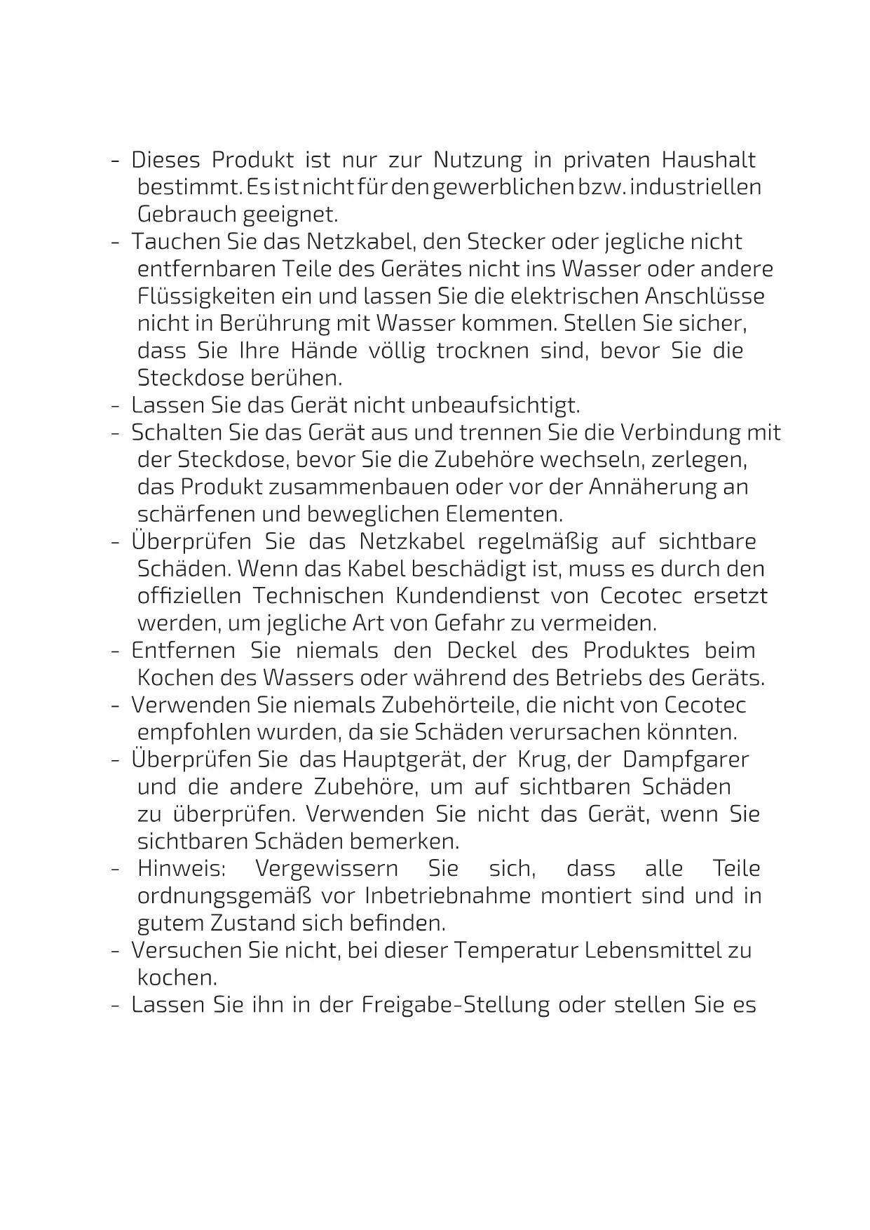 Dieses Produkt hat eine Garantie von 2 Jahren ab Kaufdatum. Solange die Kaufrechnung aufbewahrt und versandt wird, bendet sich das Produkt in einwandfreiem Zustand und wird ordnungsgemäß verwendet, wie in dieser Bedienungsanleitung angegeben. Die Garantie deckt keine Schäden wenn: - Wenn das Produkt über seine Kapazität oder Brauchbarkeit hinaus benutzt, falsch behandelt, geschlagen, Feuchtigkeit ausgesetzt, in eine Flüssigkeit oder korrosive Mittel getaucht wurde, sowie bei jedem anderen Fehler, der dem Verbraucher zuzuschreiben ist. - Das Produkt von Personen demontiert, repariert oder modiziert wurde, die nicht vom ofziellen Technischen Kundendienst durch Cecotec autorisiert worden sind. - Der Grund hierfür durch die normale Abnutzung und Verschleiß der Teile und des Zubehörs entstanden ist. Die Garantieleistung deckt alle Herstellungsbedingten Schäden und Fehler Ihres Produktes für die Dauer von 2 Jahren, nach geltendem Recht. Im Falle einer falsche Benutzung ist der Garantieservice nicht für die Reparatur verantwortlich. Sollte unerwartet eine Störung auftreten oder haben Sie Fragen über Ihrem Produkt, können Sie sich mit dem Kundendienst in Verbindung setzen über die Telefonnummer: +34 963210728.86 ITALIANO
