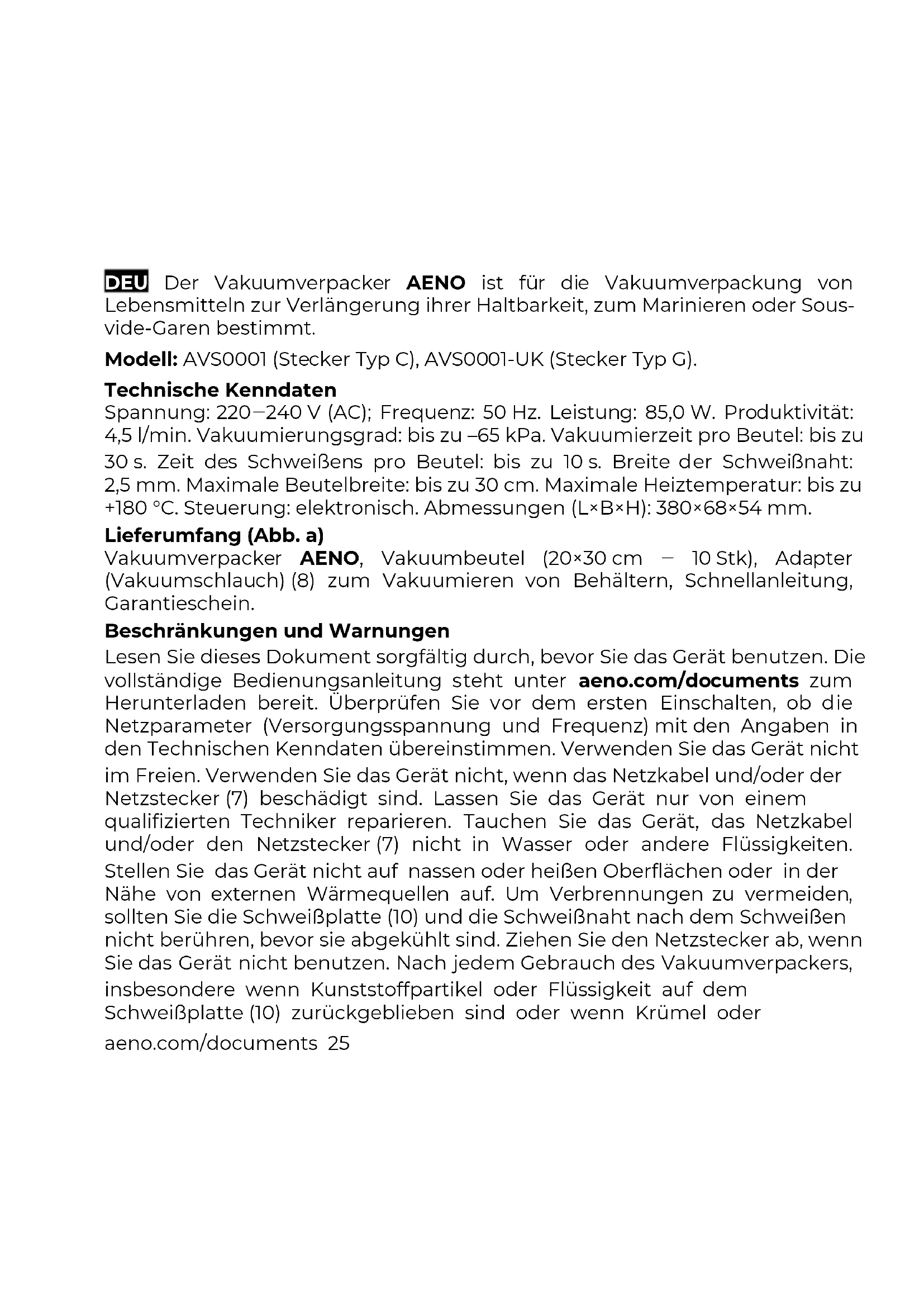 Společnost ASBISc si vyhrazuje právo upravovat zařízení a provádět změny a úpravy tohoto dokumentu bez předchozího upozornění uživatelů. Záruční doba a životnost je 2 roky od data zakoupení výrobku. Údaje o výrobci: ASBISc Enterprises PLC, Iapetou, 1, Agios Athanasios, 4101, Limassol, Cyprus (Kypr). Vyrobeno v Číně. Aktuální informace a podrobné popisy zařízení, stejně jako návody k připojení, certifikáty, informace o reklamaci kvality a záruce jsou k dispozici ke stažení na adrese aeno.com/documents. Všechny uvedené ochranné známky a názvy značek jsou majetkem příslušných vlastníků.aeno.com/documents 25 DEU Der Vakuumverpacker AENO ist für die Vakuumverpackung von Lebensmitteln zur Verlängerung ihrer Haltbarkeit, zum Marinieren oder Sous- vide-Garen bestimmt. Modell: AVS0001 (Stecker Typ C), AVS0001-UK (Stecker Typ G). Technische Kenndaten Spannung: 220‒240 V (AC); Frequenz: 50 Hz. Leistung: 85,0 W. Produktivität: 4,5 l/min. Vakuumierungsgrad: bis zu –65 kPa. Vakuumierzeit pro Beutel: bis zu 30 s. Zeit des Schweißens pro Beutel: bis zu 10 s. Breite der Schweißnaht: 2,5 mm. Maximale Beutelbreite: bis zu 30 cm. Maximale Heiztemperatur: bis zu +180 °C. Steuerung: elektronisch. Abmessungen (L×B×H): 380×68×54 mm. Lieferumfang (Abb. a) Vakuumverpacker AENO, Vakuumbeutel (20×30 cm ‒ 10 Stk), Adapter (Vakuumschlauch) (8) zum Vakuumieren von Behältern, Schnellanleitung, Garantieschein. Beschränkungen und Warnungen Lesen Sie dieses Dokument sorgfältig durch, bevor Sie das Gerät benutzen. Die vollständige Bedienungsanleitung steht unter aeno.com/documents zum Herunterladen bereit. Überprüfen Sie vor dem ersten Einschalten, ob die Netzparameter (Versorgungsspannung und Frequenz) mit den Angaben in den Technischen Kenndaten übereinstimmen. Verwenden Sie das Gerät nicht im Freien. Verwenden Sie das Gerät nicht, wenn das Netzkabel und/oder der Netzstecker (7) beschädigt sind. Lassen Sie das Gerät nur von einem qualifizierten Techniker reparieren. Tauchen Sie das Gerät, das Netzkabel und/oder den Netzstecker (7) nicht in Wasser oder andere Flüssigkeiten. Stellen Sie das Gerät nicht auf nassen oder heißen Oberflächen oder in der Nähe von externen Wärmequellen auf. Um Verbrennungen zu vermeiden, sollten Sie die Schweißplatte (10) und die Schweißnaht nach dem Schweißen nicht berühren, bevor sie abgekühlt sind. Ziehen Sie den Netzstecker ab, wenn Sie das Gerät nicht benutzen. Nach jedem Gebrauch des Vakuumverpackers, insbesondere wenn Kunststoffpartikel oder Flüssigkeit auf dem Schweißplatte (10) zurückgeblieben sind oder wenn Krümel oder26 aeno.com/documents Lebensmittelteilen in den Vakuumkammer (11) gefallen sind, ist eine Reinigung erforderlich. Ziehen Sie den Netzstecker (7) aus der Steckdose und lassen Sie das Gerät abkühlen. Wischen Sie die Oberfläche mit einem weichen, mit warmem Wasser oder einer milden Seifenlösung getränkten Tuch ab. Wischen Sie dann sie mit einem weichen, mit klarem Wasser angefeuchteten Tuch nach und wischen Sie trocken. Verwenden Sie keine scharfen Reinigungsmittel, Scheuerpasten, Poliermittel oder säure- oder lösungsmittelhaltige Reinigungsmittel. Verwenden Sie einen Vakuumverpacker, um nur trockene Produkte zu vakuumieren und/oder zu verschweißen. Das Gerät ist nicht für die Verpackung von nassen oder flüssigen Lebensmitteln geeignet. Verwenden Sie nur spezielle Beutel und Behälter für Vakuumverpacker. Der mit dem Vakuumpacker gelieferte Adapter (Vakuumschlauch) (8) dient nur zum Vakuumieren von Luft aus speziellen Vakuumbehältern. Bevor Sie in einem Beutel oder Behälter verpackte Lebensmittel in die Mikrowelle stellen, machen Sie ein Loch in den Beutel oder öffnen Sie das Auslassventil (13) des Behälters, damit der Dampf entweichen kann. Verwenden Sie nur vom Hersteller empfohlenes Zubehör, Verbrauchsmaterial und/oder Ersatzteile. Detaillierte Informationen finden Sie in der vollständigen Bedienungsanleitung, die Sie unter aeno.com/documents herunterladen können. Lassen Sie das Gerät nicht unbeaufsichtigt eingeschaltet. Lassen Sie das Gerät nach dem Gebrauch abkühlen. Das Gerät darf von Personen mit eingeschränkter Mobilität nur unter direkter Aufsicht und Kontrolle verwendet werden. Um eine Verformung der Dichtung (9) und eine Verschlechterung der Produktivität des Geräts zu vermeiden, wird empfohlen, bei Nichtgebrauch des Geräts eine Papiereinlage in den Vakuumverpacker zu legen und den Deckel locker zu schließen, ohne die Deckelverschlüsse (12) zu verriegeln. Erlauben Sie Kindern nicht, das Gerät zu benutzen und/oder damit zu spielen. Geräteverwaltung Bevor Sie den Vakuumverpacker zum ersten Mal einschalten, vergewissern Sie sich, dass das gesamte Verpackungsmaterial aus dem Gerät entfernt worden ist.aeno.com/documents 27 Schweißen der Beutel