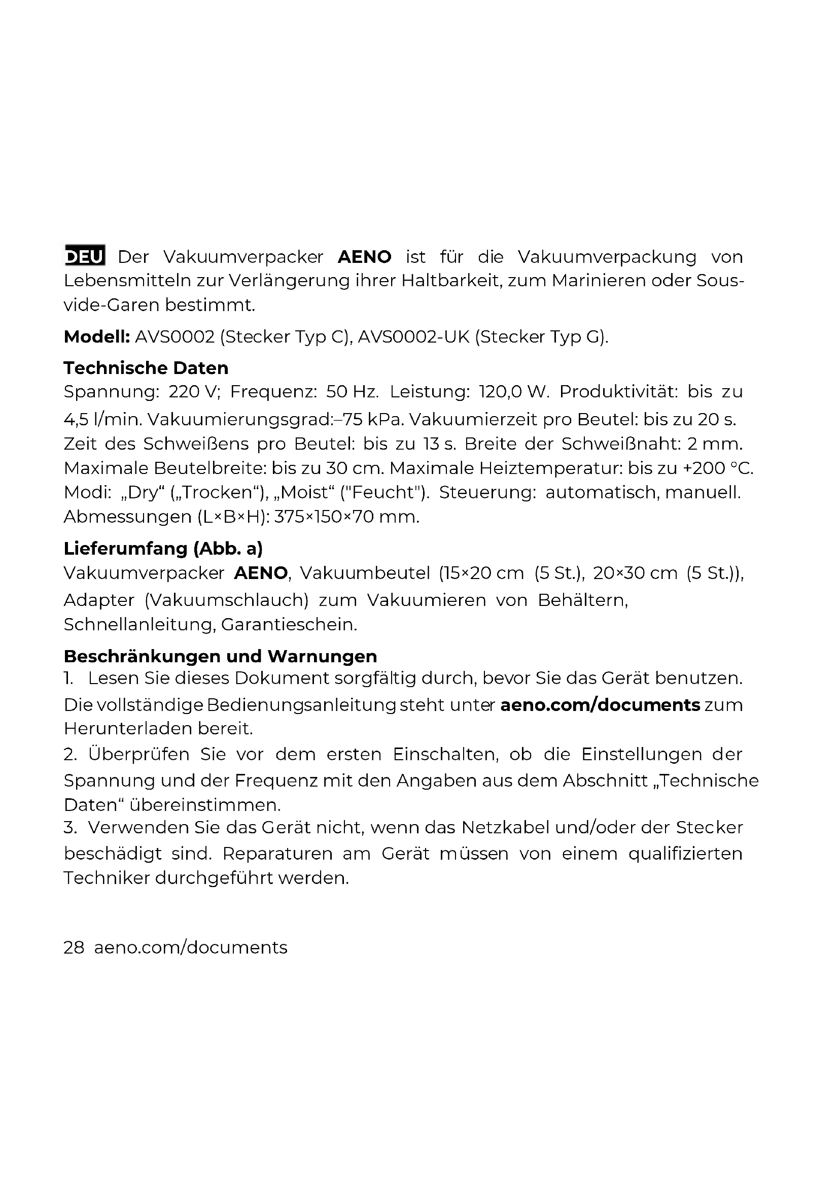 Diese Symbole weisen darauf hin, dass Sie bei der Entsorgung des Geräts, seiner Batterien und Akkus sowie seines elektrischen und elektronischen Zubehörs Elektro- und Elektronikgeräte-Abfall (WEEE) und Entsorgungsvorschriften für Batterien und Akkumulatoren befolgen müssen. Gemäß den Vorschriften müssen diese Geräte am Ende ihrer Nutzungsdauer getrennt entsorgt werden. Entsorgen Sie das Gerät, seine Batterien und Akkus sowie sein elektrisches und elektronisches Zubehör nie zusammen mit unsortiertem Siedlungsabfall, da dies umweltschädlich ist. Um dieses Gerät zu entsorgen, muss es im Geschäft zurückgegeben oder bei einem örtlichen Recyclingzentrum abgegeben werden. Nähere Informationen zum örtlichen Müllentsorgungssystem erhalten Sie auch direkt beim zuständigen Gemeindeamt. ASBISc behält sich das Recht vor, das Gerät zu modifizieren und Änderungen an diesem Dokument ohne vorherige Ankündigung. Die Garantiezeit und Lebensdauer beträgt 2 Jahre ab dem Kaufdatum des Produkts. Herstellerangaben: ASBISc Enterprises PLC, Iapetou, 1, Agios Athanasios, 4101, Limassol, Cyprus (Zypern). Hergestellt in China. Aktuelle Informationen und detaillierte Gerätebeschreibungen sowie Anschlussanleitungen, Zertifikate, Qualitätsansprüche und Garantieinformationen stehen unter aeno.com/documents zum Download bereit. Alle genannten Warenzeichen und Markennamen sind Eigentum der jeweiligen Inhaber.34 aeno.com/documents EST AENO vaakumpakendaja on mõeldud toiduainete vaakumpakendamiseks, et pikendada nende säilivusaega, marineerimiseks või sous vide toiduvalmistamiseks. Mudel: AVS0002 (pistik tüüp C), AVS0002-UK (pistik tüüp G). Tehnilised andmed Toitepinge: 220 V; sagedus: 50 Hz. Võimsus: 120,0 W. Tulemused: kuni 4,5 L/min. Vaakumkoguse aste:–75 kPa. Tolmuimeerimisaeg koti kohta: kuni 20 sekundit. Sulgemisaeg koti kohta: kuni 13 sekundit. Keevisõmbluse laius: 2 mm. Pakendi maksimaalne laius: kuni 30 sentimeetrit. Maksimaalne kuumutustemperatuur: kuni +200 °C. Režiimid: "Dry", "Moist". Juhtimine: automaatne, impulssidega (käsitsi). Mõõtmed (P×L×K): 375×150×70 mm. Tarnekomplekt (joonis a) Vaakumpakendaja AENO, vaakumkotid (15×20 cm (5 tk), 20×30 cm (5 tk)), adapter (vaakumvoolik) konteinerite vaakumpakendamiseks, kiirjuhend, garantiikaart. Piirangud ja hoiatused