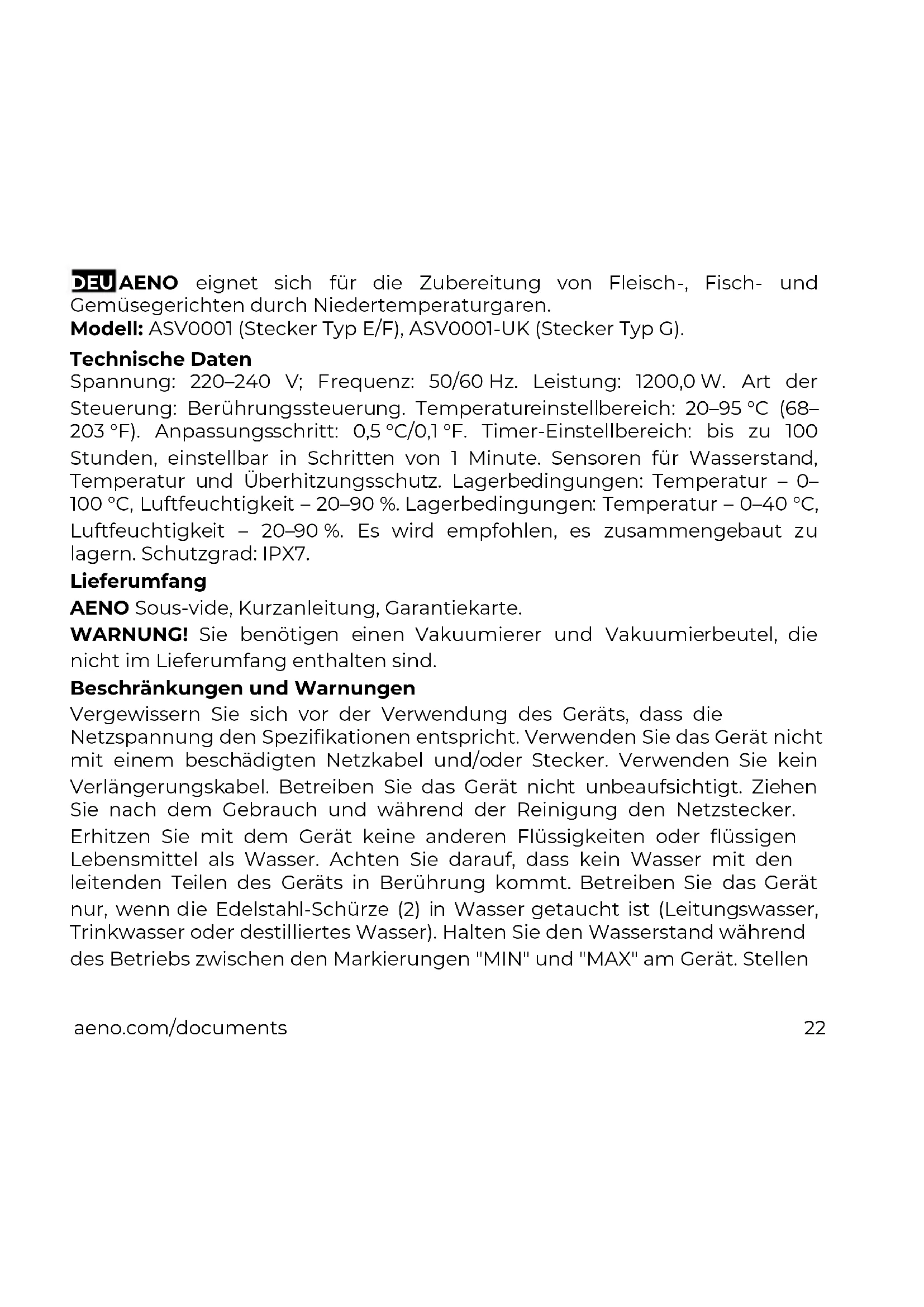 DEU AENO eignet sich für die Zubereitung von Fleisch-, Fisch- und Gemüsegerichten durch Niedertemperaturgaren. Modell: ASV0001 (Stecker Typ E/F), ASV0001-UK (Stecker Typ G). Technische Daten Spannung: 220–240 V; Frequenz: 50/60 Hz. Leistung: 1200,0 W. Art der Steuerung: Berührungssteuerung. Temperatureinstellbereich: 20–95 °C (68– 203 °F). Anpassungsschritt: 0,5 °C/0,1 °F. Timer-Einstellbereich: bis zu 100 Stunden, einstellbar in Schritten von 1 Minute. Sensoren für Wasserstand, Temperatur und Überhitzungsschutz. Lagerbedingungen: Temperatur – 0– 100 °C, Luftfeuchtigkeit – 20–90 %. Lagerbedingungen: Temperatur – 0–40 °C, Luftfeuchtigkeit – 20–90 %. Es wird empfohlen, es zusammengebaut zu lagern. Schutzgrad: IPX7. Lieferumfang AENO Sous-vide, Kurzanleitung, Garantiekarte. WARNUNG! Sie benötigen einen Vakuumierer und Vakuumierbeutel, die nicht im Lieferumfang enthalten sind. Beschränkungen und Warnungen Vergewissern Sie sich vor der Verwendung des Geräts, dass die Netzspannung den Spezifikationen entspricht. Verwenden Sie das Gerät nicht mit einem beschädigten Netzkabel und/oder Stecker. Verwenden Sie kein Verlängerungskabel. Betreiben Sie das Gerät nicht unbeaufsichtigt. Ziehen Sie nach dem Gebrauch und während der Reinigung den Netzstecker. Erhitzen Sie mit dem Gerät keine anderen Flüssigkeiten oder flüssigen Lebensmittel als Wasser. Achten Sie darauf, dass kein Wasser mit den leitenden Teilen des Geräts in Berührung kommt. Betreiben Sie das Gerät nur, wenn die Edelstahl-Schürze (2) in Wasser getaucht ist (Leitungswasser, Trinkwasser oder destilliertes Wasser). Halten Sie den Wasserstand während des Betriebs zwischen den Markierungen "MIN" und "MAX" am Gerät. Stellen23 aeno.com/documents.