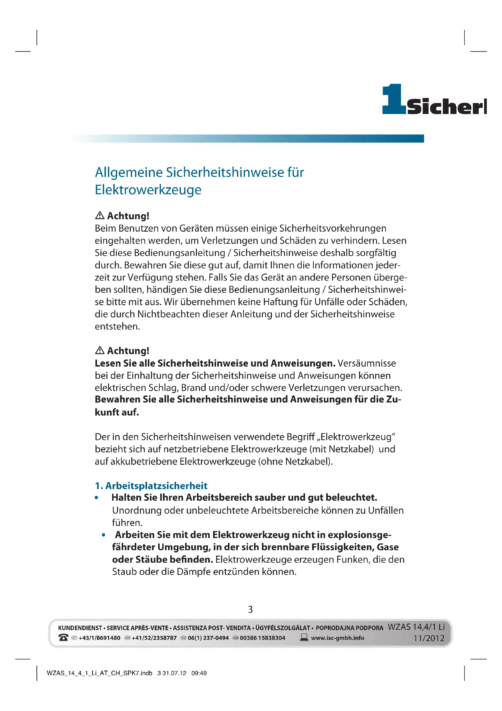 +43/1/8691480 +41/52/2358787 06(1) 237-0494 00386 15838304KUNDENDIENST • SERVICE APRÈS-VENTE • ASSISTENZA POST- VENDITA • ÜGYFÉLSZOLGÁLAT • POPRODAJNA PODPORAwww.isc-gmbh.info WZAS 14,4/1 Li 11/2012 Allgemeine Sicherheitshinweise für Elektrowerkzeuge m Achtung! Beim Benutzen von Geräten müssen einige Sicherheitsvorkehrungen eingehalten werden, um Verletzungen und Schäden zu verhindern. Lesen Sie diese Bedienungsanleitung / Sicherheitshinweise deshalb sorgfältig durch. Bewahren Sie diese gut auf, damit Ihnen die Informationen jeder- zeit zur Verfügung stehen. Falls Sie das Gerät an andere Personen überge- ben sollten, händigen Sie diese Bedienungsanleitung / Sicherheitshinwei- se bitte mit aus. Wir übernehmen keine Haftung für Unfälle oder Schäden, die durch Nichtbeachten dieser Anleitung und der Sicherheitshinweise entstehen. m Achtung! Lesen Sie alle Sicherheitshinweise und Anweisungen. Versäumnisse bei der Einhaltung der Sicherheitshinweise und Anweisungen können elektrischen Schlag, Brand und/oder schwere Verletzungen verursachen. Bewahren Sie alle Sicherheitshinweise und Anweisungen für die Zu- kunft auf. Der in den Sicherheitshinweisen verwendete Begriff „Elektrowerkzeug“ bezieht sich auf netzbetriebene Elektrowerkzeuge (mit Netzkabel) und auf akkubetriebene Elektrowerkzeuge (ohne Netzkabel).