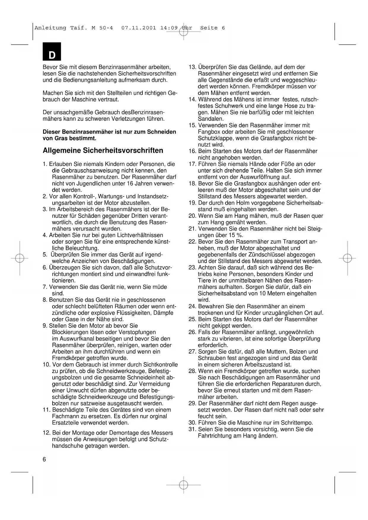 1 1 Lea el manual de instrucciones 2 Atención cuchillas girando a velocidad 3 Observe la distancia de seguridad 4 No corte nunca el césped estando la bolsa de recogida o el chasis trasero abierto. 5 Atención, las cuchillas siguen girando después de haber parado el motor 6 Antes de hacer cualquier trabajo de cuidado o mantenimiento, de limpieza o de ajuste es imprescindible para el motor, retirar la llave de encendido y leer el manual de instrucciones. Anleitung Taif. M 50-4 07.11.2001 14:09 Uhr Seite 56 Bevor Sie mit diesem Benzinrasenmäher arbeiten, lesen Sie die nachstehenden Sicherheitsvorschriften und die Bedienungsanleitung aufmerksam durch. Machen Sie sich mit den Stellteilen und richtigen Ge- brauch der Maschine vertraut. Der unsachgemäße Gebrauch desBenzinrasen- mähers kann zu schweren Verletzungen führen. Dieser Benzinrasenmäher ist nur zum Schneiden von Gras bestimmt. Allgemeine Sicherheitsvorschriften