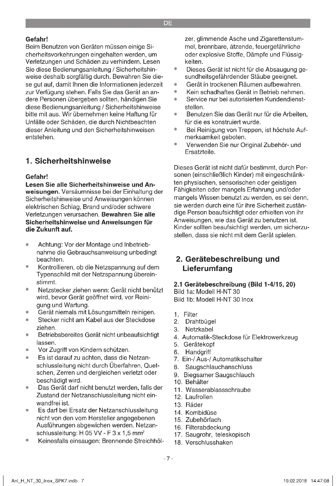 H-NT 30 Netzspannung:........................220-240 V ~ 50 Hz Leistungsaufnahme: ................................... 850 W Max. Leistungsaufnahme Automatik-Steckdose: .............................. 2600 W Max. Leistungsaufnahme Gesamt: ........... 3450 W Behältervolumen: ............................................ 30 l Gewicht: ................................................ ca. 9,3 kg Anl_H_NT_30_Inox_SPK7.indb 8Anl_H_NT_30_Inox_SPK7.indb 8 19.02.2018 14:47:0819.02.2018 14:47:08DE
