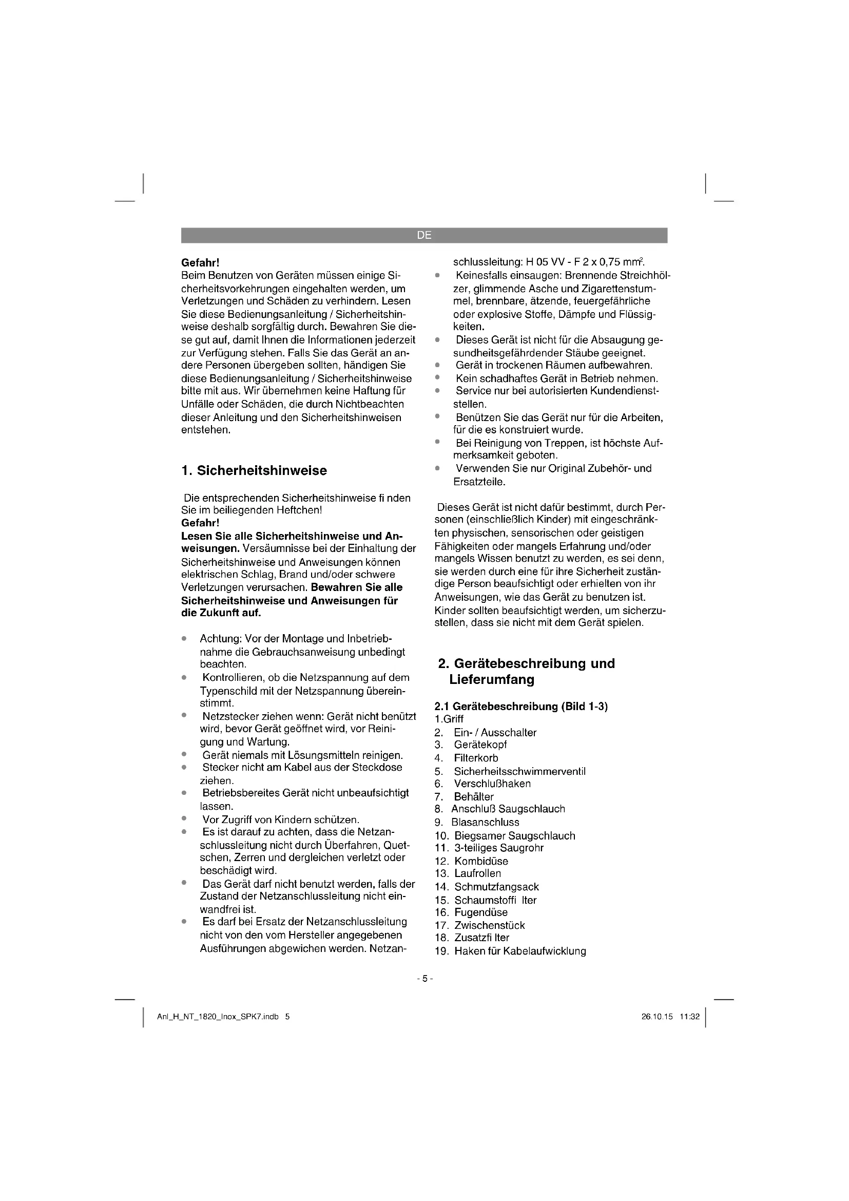 Verwenden Sie zum Trockensaugen den Schmutzfangsack (14) und den Zusatzfi lter (18) (siehe Punkt 5.2). Achten Sie stets auf festen Sitz der Filter! Anl_H_NT_1820_Inox_SPK7.indb 7Anl_H_NT_1820_Inox_SPK7.indb 7 26.10.15 11:3226.10.15 11:32DE