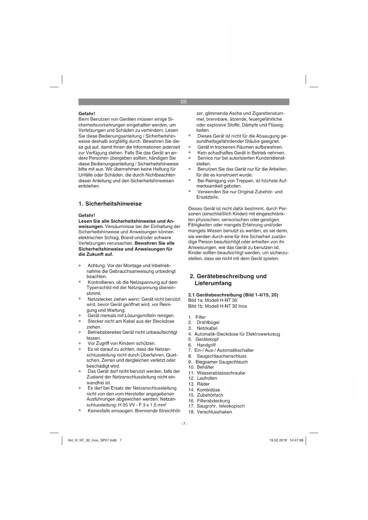 Netzanschlussleitung Gefahr! Wenn die Netzanschlussleitung dieses Gerätes beschädigt wird, muss sie durch den Hersteller oder seinen Kundendienst oder eine ähnlich qua- lifi zierte Person ersetzt werden, um Gefährdun- gen zu vermeiden. Anl_H_NT_30_Inox_SPK7.indb 10Anl_H_NT_30_Inox_SPK7.indb 10 19.02.2018 14:47:0819.02.2018 14:47:08DE