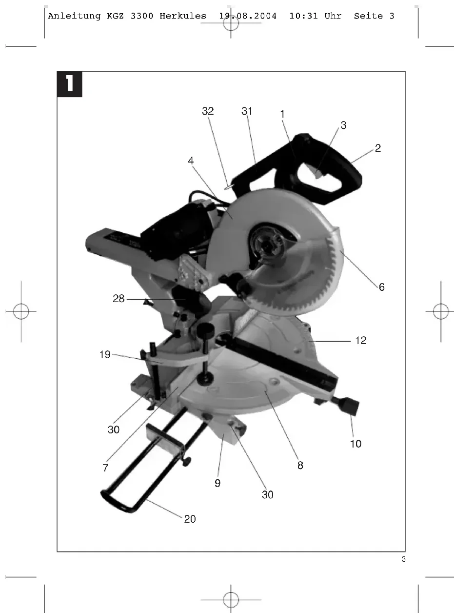 Kapp,- und Gehrungssäge Spannvorrichtung (19) Verlängerungsstützen Hartmetallbestücktes Sägeblatt (4) Spänefangsack (24) Werkzeug für Sägeblattwechsel (32)