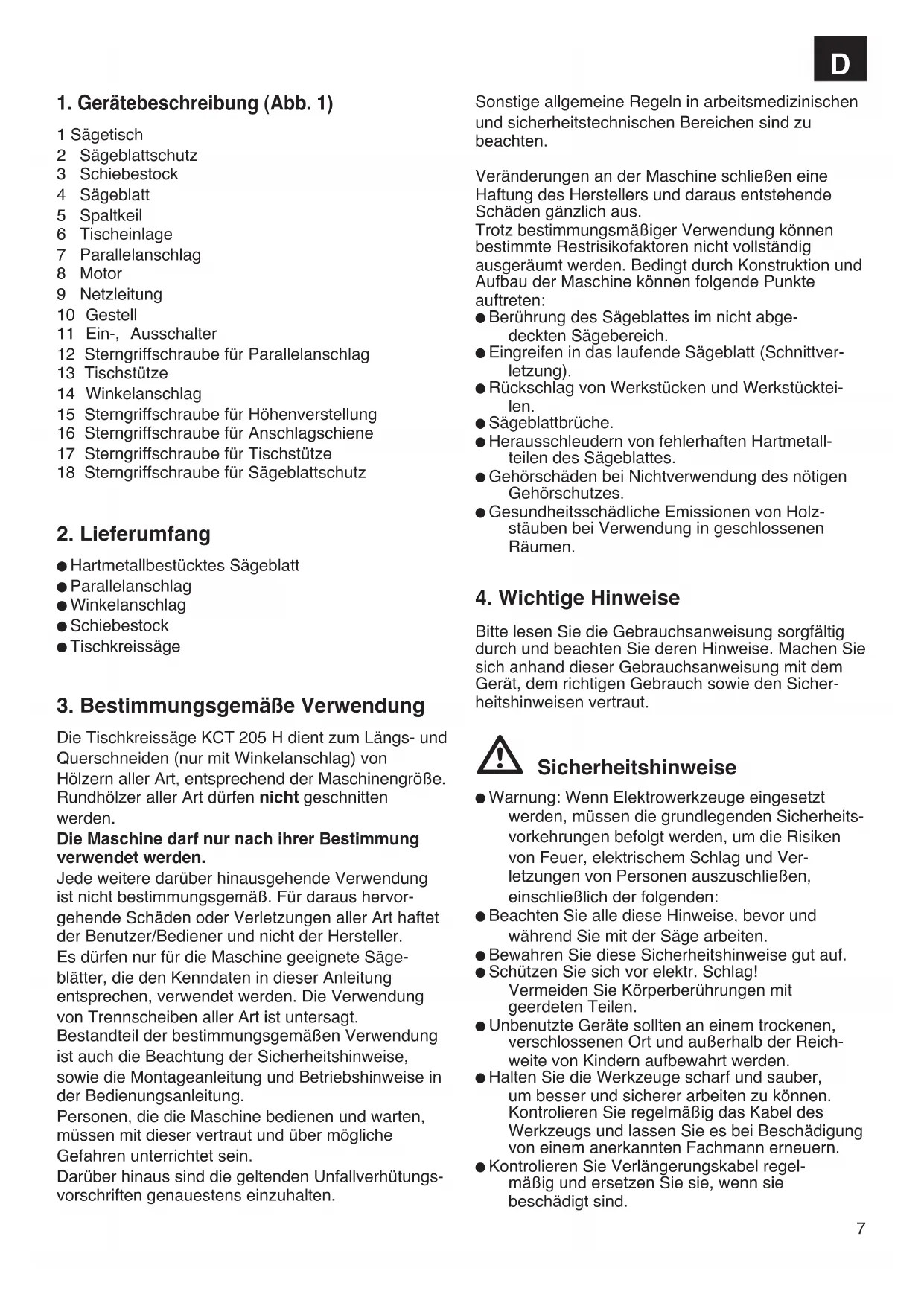 Die Tischkreissäge KCT 205 H dient zum Längs- und Querschneiden (nur mit Winkelanschlag) von Hölzern aller Art, entsprechend der Maschinengröße. Rundhölzer aller Art dürfen nicht geschnitten werden. Die Maschine darf nur nach ihrer Bestimmung verwendet werden. Jede weitere darüber hinausgehende Verwendung ist nicht bestimmungsgemäß. Für daraus hervor- gehende Schäden oder Verletzungen aller Art haftet der Benutzer/Bediener und nicht der Hersteller. Es dürfen nur für die Maschine geeignete Säge- blätter, die den Kenndaten in dieser Anleitung entsprechen, verwendet werden. Die Verwendung von Trennscheiben aller Art ist untersagt. Bestandteil der bestimmungsgemäßen Verwendung ist auch die Beachtung der Sicherheitshinweise, sowie die Montageanleitung und Betriebshinweise in der Bedienungsanleitung. Personen, die die Maschine bedienen und warten, müssen mit dieser vertraut und über mögliche Gefahren unterrichtet sein. Darüber hinaus sind die geltenden Unfallverhütungs- vorschriften genauestens einzuhalten. Sonstige allgemeine Regeln in arbeitsmedizinischen und sicherheitstechnischen Bereichen sind zu beachten. Veränderungen an der Maschine schließen eine Haftung des Herstellers und daraus entstehende Schäden gänzlich aus. Trotz bestimmungsmäßiger Verwendung können bestimmte Restrisikofaktoren nicht vollständig ausgeräumt werden. Bedingt durch Konstruktion und Aufbau der Maschine können folgende Punkte auftreten: Berührung des Sägeblattes im nicht abge- deckten Sägebereich. Eingreifen in das laufende Sägeblatt (Schnittver- letzung). Rückschlag von Werkstücken und Werkstücktei- len. Sägeblattbrüche. Herausschleudern von fehlerhaften Hartmetall- teilen des Sägeblattes. Gehörschäden bei Nichtverwendung des nötigen Gehörschutzes. Gesundheitsschädliche Emissionen von Holz- stäuben bei Verwendung in geschlossenen Räumen.