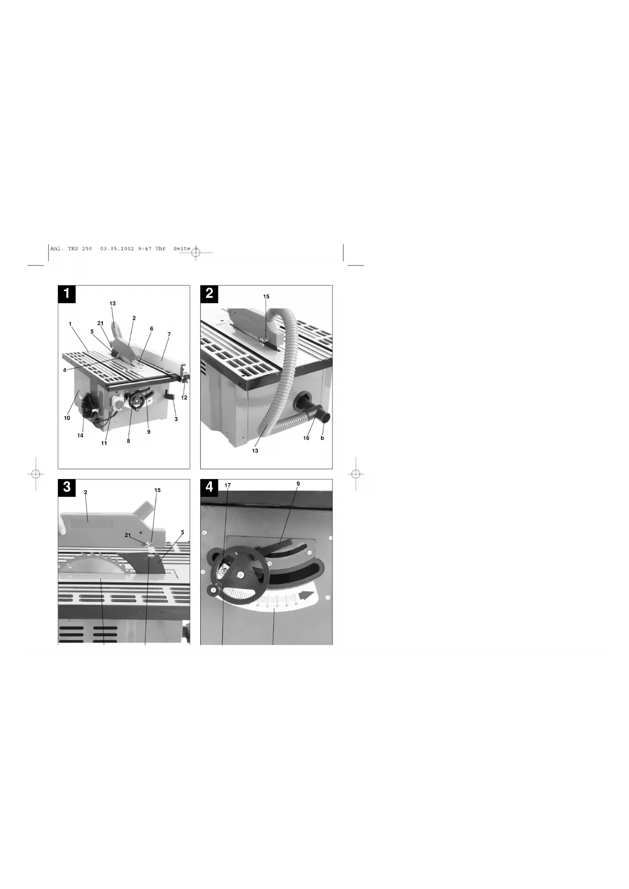 1 Sägetisch 2 Sägeblattschutz 3 Schiebestock 4 Sägeblatt 5 Spaltkeil 6 Tischeinlage 7 Parallelanschlag 8 Handrad 9 Feststellgriff 10 Gestell 11 Ein-, Ausschalter 12 Sterngriffschraube 13 Absaugschlauch 14 Queranschlag 15 Flügelmutter 16 Absaugadapter 21 Schraube