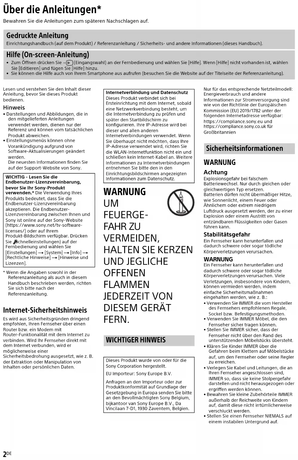 FERN. Nur für das entsprechende Netzteilmodell:Energieverbrauch und andere Informationen zur Stromversorgung sind wie von der Richtlinie der Europäischen Kommission (EU) 2019/1782 unter der folgenden Internetadresse verfügbar:https://compliance.sony.eu undhttps://compliance.sony.co.uk für Großbritannien WARNUNG Achtung Explosionsgefahr bei falschem Batteriewechsel. Nur durch gleichen oder gleichwertigen Typ ersetzen.Batterien dürfen nicht übermäßiger Hitze, wie Sonnenlicht, einem Feuer oder Ähnlichem oder extrem niedrigem Luftdruck ausgesetzt werden, der zu einer Explosion oder einem Austritt von entzündbaren Flüssigkeiten oder Gasen führen kann. Stabilitätsgefahr Ein Fernseher kann herunterfallen und dadurch schwere oder sogar tödliche Körperverletzungen verursachen. WARNUNG Ein Fernseher kann herunterfallen und dadurch schwere oder sogar tödliche Körperverletzungen verursachen. Viele Verletzungen, insbesondere von Kindern, können vermieden werden, indem einfache Sicherheitsmaßnahmen eingehalten werden, wie z. B.:• Verwenden Sie IMMER die vom Hersteller des Fernsehers empfohlenen Regale, Sockel bzw. Befestigungsmethoden.• Verwenden Sie IMMER Möbel, die den Fernseher sicher tragen können.• Stellen Sie IMMER sicher, dass der Fernseher nicht über den Rand des unterstützenden Möbelstücks übersteht.• Klären Sie Kinder IMMER über die Gefahren beim Klettern auf Möbelstücke auf, um den Fernseher oder seine Regler zu erreichen.• Verlegen Sie Kabel und Leitungen, die an Ihren Fernseher angeschlossen sind, IMMER so, dass sie keine Stolpergefahr darstellen und nicht herausgezogen oder ergriffen werden können.• Bewahren Sie kleine Zubehörteile IMMER außerhalb der Reichweite von Kindern auf, damit diese nicht irrtümlicherweise verschluckt werden.• Stellen Sie einen Fernseher NIEMALS auf einem instabilen Untergrund auf. Über die Anleitungen* Bewahren Sie die Anleitungen zum späteren Nachschlagen auf. Gedruckte Anleitung Einrichtungshandbuch (auf dem Produkt) / Referenzanleitung / Sicherheits- und andere Informationen (dieses Handbuch). Hilfe (On-screen-Anleitung)