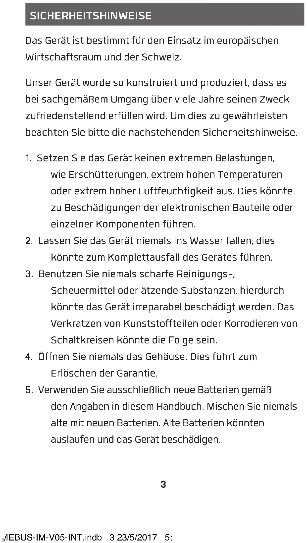 den Angaben in diesem Handbuch. Mischen Sie niemals alte mit neuen Batterien. Alte Batterien könnten auslaufen und das Gerät beschädigen. 42435-MEBUS-IM-V05-INT.indb 3 23/5/2017 5:15 PM4 SICHERHEITSHINWEISE