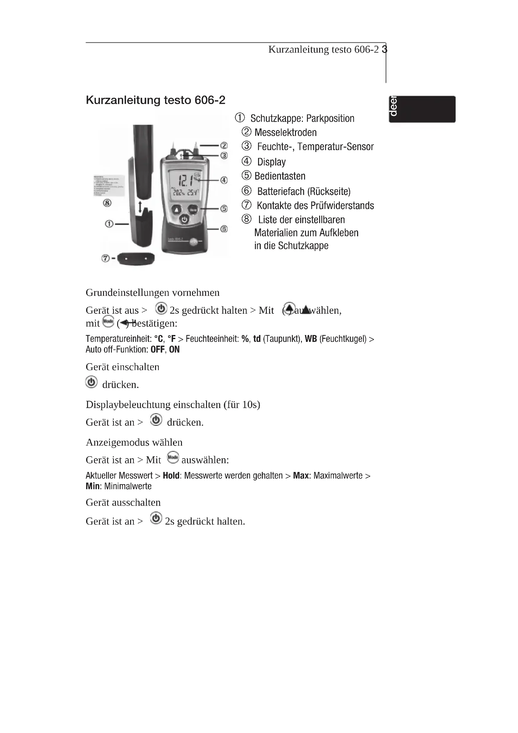 - Bedienungsanleitung de Instruction manual en Mode d’emploi fr Manual de instrucciones es Manuale di istruzioni it Manual de instruções pt Ðóêîâîäñòâî ïîëüçîâàòåëÿ ru testo 606-22 Bedienungsanleitung de p. 3