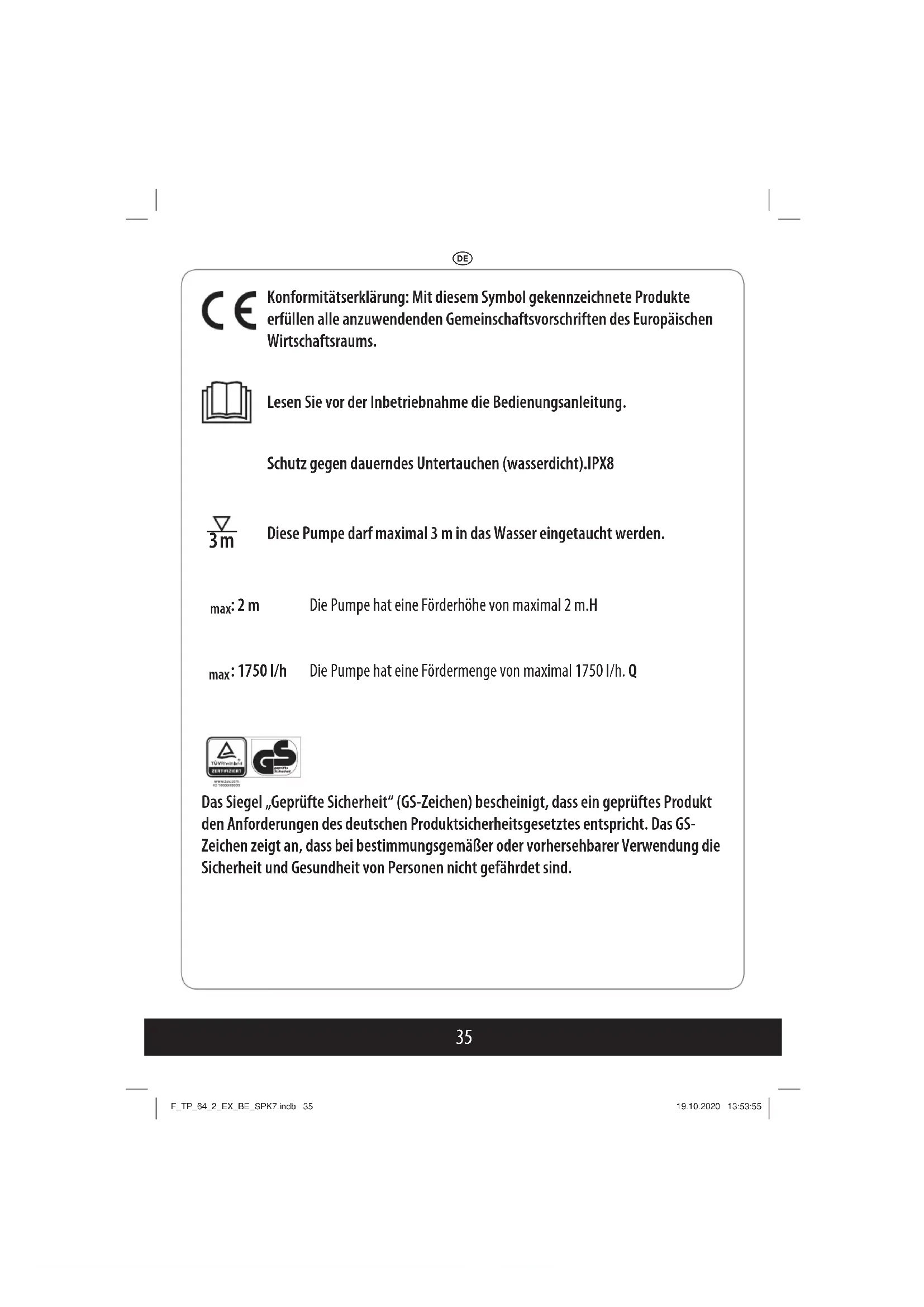 Lesen Sie vor der Inbetriebnahme die Bedienungsanleitung. Konformitätserklärung: Mit diesem Symbol gekennzeichnete Produkte erfüllen alle anzuwendenden Gemeinschaftsvorschriften des Europäischen Wirtschaftsraums. Das Siegel „Geprüfte Sicherheit“ (GS-Zeichen) bescheinigt, dass ein geprüftes Produkt den Anforderungen des deutschen Produktsicherheitsgesetztes entspricht. Das GS- Zeichen zeigt an, dass bei bestimmungsgemäßer oder vorhersehbarer Verwendung die Sicherheit und Gesundheit von Personen nicht gefährdet sind. Schutz gegen dauerndes Untertauchen (wasserdicht).IPX8 3 m Diese Pumpe darf maximal 3 m in das Wasser eingetaucht werden. Die Pumpe hat eine Förderhöhe von maximal 2 m.H max : 2 m Die Pumpe hat eine Fördermenge von maximal 1750 l/h. Q max : 1750 l/h F_TP_64_2_EX_BE_SPK7.indb 35F_TP_64_2_EX_BE_SPK7.indb 35 19.10.2020 13:53:5519.10.2020 13:53:55(