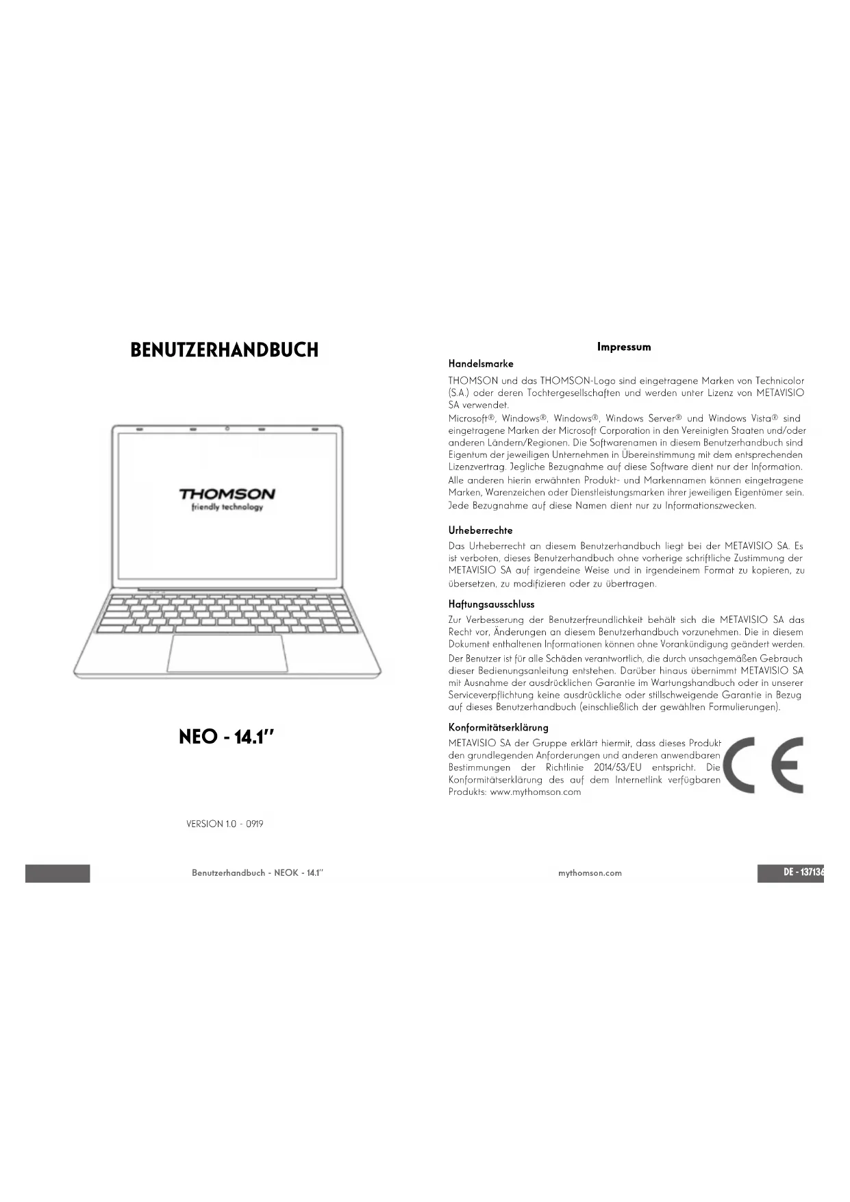Wij raden u aan een back-up te maken van de volledige map op een extern opslagmedium (externe harde schijf, USB-sticks, CD-R) om een kopie van deze stuurprogramma’s te bewaren.DE - 137136 - DE Benutzerhandbuch - NEOK - 14.1’’ mythomson.com BENUTZERHANDBUCH NEO - 14.1’’ VERSION 1.0 - 0919 Impressum Handelsmarke THOMSON und das THOMSON-Logo sind eingetragene Marken von Technicolor (S.A.) oder deren Tochtergesellschaften und werden unter Lizenz von METAVISIO SA verwendet. Microsoft®, Windows®, Windows®, Windows Server® und Windows Vista® sind eingetragene Marken der Microsoft Corporation in den Vereinigten Staaten und/oder anderen Ländern/Regionen. Die Softwarenamen in diesem Benutzerhandbuch sind Eigentum der jeweiligen Unternehmen in Übereinstimmung mit dem entsprechenden Lizenzvertrag. Jegliche Bezugnahme auf diese Software dient nur der Information. Alle anderen hierin erwähnten Produkt- und Markennamen können eingetragene Marken, Warenzeichen oder Dienstleistungsmarken ihrer jeweiligen Eigentümer sein. Jede Bezugnahme auf diese Namen dient nur zu Informationszwecken. Urheberrechte Das Urheberrecht an diesem Benutzerhandbuch liegt bei der METAVISIO SA. Es ist verboten, dieses Benutzerhandbuch ohne vorherige schriftliche Zustimmung der METAVISIO SA auf irgendeine Weise und in irgendeinem Format zu kopieren, zu übersetzen, zu modizieren oder zu übertragen. Haftungsausschluss Zur Verbesserung der Benutzerfreundlichkeit behält sich die METAVISIO SA das Recht vor, Änderungen an diesem Benutzerhandbuch vorzunehmen. Die in diesem Dokument enthaltenen Informationen können ohne Vorankündigung geändert werden. Der Benutzer ist für alle Schäden verantwortlich, die durch unsachgemäßen Gebrauch dieser Bedienungsanleitung entstehen. Darüber hinaus übernimmt METAVISIO SA mit Ausnahme der ausdrücklichen Garantie im Wartungshandbuch oder in unserer Serviceverpichtung keine ausdrückliche oder stillschweigende Garantie in Bezug auf dieses Benutzerhandbuch (einschließlich der gewählten Formulierungen). Konformitätserklärung METAVISIO SA der Gruppe erklärt hiermit, dass dieses Produkt den grundlegenden Anforderungen und anderen anwendbaren Bestimmungen der Richtlinie 2014/53/EU entspricht. Die Konformitätserklärung des auf dem Internetlink verfügbaren Produkts: www.mythomson.comDE - 139138 - DE Benutzerhandbuch - NEOK - 14.1’’ mythomson.com - Wichtige Sicherheitshinweise - Dieses Gerät sollte in einer Umgebung mit einer Umgebungstemperatur zwischen 5°C (41°F) und 35°C (95°F) eingesetzt werden. Setzen Sie das Gerät weder Regen noch Feuchtigkeit aus und halten Sie es von Flüssigkeiten fern. Wenn Wasser oder andere Flüssigkeiten auf das Gerät spritzen, schalten Sie das Gerät sofort aus und warten Sie, bis es vollständig trocken ist, bevor Sie es wieder einschalten. Setzen Sie das Gerät nicht direkt der Sonneneinstrahlung aus. Verwenden Sie keine starken Lösungsmittel, üssigen Reinigungsmittel oder andere Chemikalien auf oder in der Nähe der Oberäche des Geräts, um Korrosion oder Beschädigung der Oberäche des Geräts zu vermeiden. Setzen Sie die Kamera nicht einer staubigen Umgebung aus. Verwenden Sie das Gerät nicht während eines Gaslecks. Setzen Sie das Gerät keinen starken magnetischen oder elektrischen Feldern aus. Sie können das Gerät über Flughafen-Röntgendetektoren betreiben. Es wird jedoch empfohlen, Ihr Gerät nicht durch die Magnetdetektionsportale zu führen oder es tragbaren Detektoren auszusetzen. Stellen Sie keine Gegenstände auf das Gerät. Stellen Sie das Gerät nicht auf eine unebene oder instabile Fläche. Achten Sie darauf, das Gerät vor Stürzen oder anderen Stößen zu schützen, die es beschädigen könnten. Lassen Sie das Gerät nicht auf Ihrem Schoß oder einem anderen Körperteil liegen oder auf ihn geladen, um die Gefahr von hitzebedingten Verletzungen zu vermeiden. Schalten Sie das Gerät vor dem Transport aus oder bedecken Sie es mit einem Material, das keine optimale Luftzirkulation zulässt. Verwenden Sie keine beschädigten Netzkabel, Zubehör oder andere Geräte mit Ihrem Gerät. Wir empfehlen die ausschließliche Verwendung des mitgelieferten Zubehörs (Netzteil, Kabel usw.). Verwenden Sie nur Originalbatterien. Das Ersetzen der Batterie durch eine falsche Batterie kann zu einer Explosion führen. Demontieren, modizieren oder reparieren Sie das Gerät nicht selbst, da dies zum Erlöschen der Garantie führen kann. Bitte sichern Sie Ihre wichtigen Inhalte regelmäßig, um Datenverlust zu vermeiden. Unser Unternehmen übernimmt keine Verantwortung für den Verlust oder die Entfernung von Gegenständen, die im Gerät enthalten sind, aufgrund von unsachgemäßem Gebrauch der Hard- oder Software, mangelnder Wartung oder eines anderen zufälligen Ereignisses. Demontieren, modizieren oder reparieren Sie das Gerät nicht selbst, da dies zum Erlöschen der Garantie führen kann. Bitte sichern Sie Ihre wichtigen Inhalte regelmäßig, um Datenverlust zu vermeiden. Unser Unternehmen übernimmt keine Verantwortung für den Verlust oder die Entfernung von Gegenständen, die im Gerät enthalten sind, aufgrund von unsachgemäßem Gebrauch der Hard- oder Software, mangelnder Wartung oder eines anderen zufälligen Ereignisses. Bei voller Lautstärke kann ein längeres Hören des tragbaren Audiogeräts das Gehör des Benutzers beeinträchtigen. Dieses Produkt wurde entwickelt, um ein ordnungsgemäßes Recycling von Teilen und Komponenten zu ermöglichen. Das Symbol für einen durchgestrichenen Müllbehälter auf Rädern zeigt an, dass das Gerät nicht über den Hausmüll entsorgt werden darf. Beachten Sie die örtlichen Vorschriften für die Entsorgung von elektronischen Geräten. Das Symbol für einen durchgestrichenen Müllcontainer zeigt an, dass die Batterie nicht über den Hausmüll entsorgt werden darf. Beachten Sie die örtlichen Vorschriften für die Entsorgung von Batterien.DE - 141140 - DE Benutzerhandbuch - NEOK 