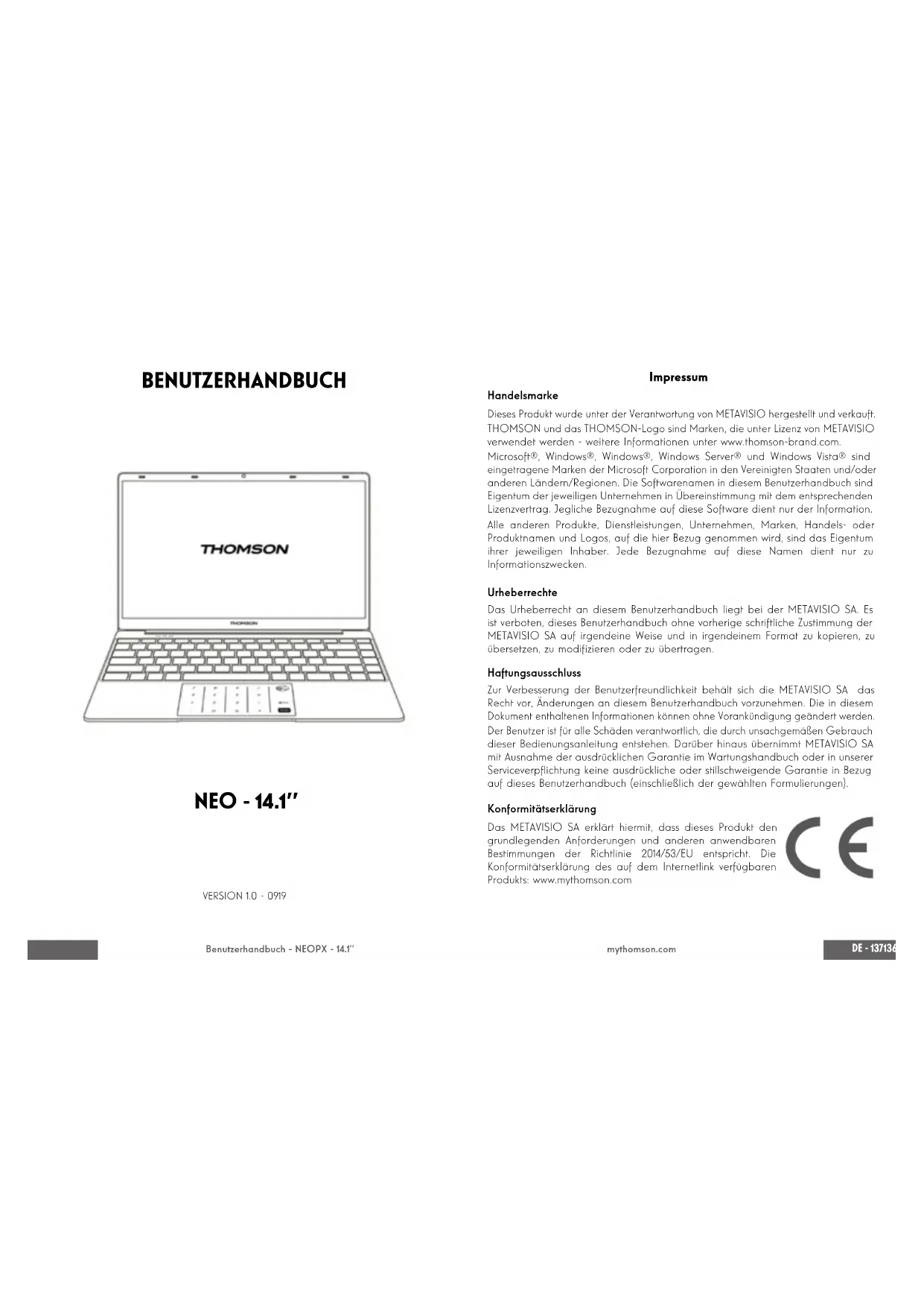 Wij raden u aan een back-up te maken van de volledige map op een extern opslagmedium (externe harde schijf, USB-sticks, CD-R) om een kopie van deze stuurprogramma’s te bewaren.DE - 137136 - DE Benutzerhandbuch - NEOPX - 14.1’’ mythomson.com BENUTZERHANDBUCH NEO - 14.1’’ VERSION 1.0 - 0919 Impressum Handelsmarke Dieses Produkt wurde unter der Verantwortung von METAVISIO hergestellt und verkauft. THOMSON und das THOMSON-Logo sind Marken, die unter Lizenz von METAVISIO verwendet werden - weitere Informationen unter www.thomson-brand.com. Microsoft®, Windows®, Windows®, Windows Server® und Windows Vista® sind eingetragene Marken der Microsoft Corporation in den Vereinigten Staaten und/oder anderen Ländern/Regionen. Die Softwarenamen in diesem Benutzerhandbuch sind Eigentum der jeweiligen Unternehmen in Übereinstimmung mit dem entsprechenden Lizenzvertrag. Jegliche Bezugnahme auf diese Software dient nur der Information. Alle anderen Produkte, Dienstleistungen, Unternehmen, Marken, Handels- oder Produktnamen und Logos, auf die hier Bezug genommen wird, sind das Eigentum ihrer jeweiligen Inhaber. Jede Bezugnahme auf diese Namen dient nur zu Informationszwecken. Urheberrechte Das Urheberrecht an diesem Benutzerhandbuch liegt bei der METAVISIO SA. Es ist verboten, dieses Benutzerhandbuch ohne vorherige schriftliche Zustimmung der METAVISIO SA auf irgendeine Weise und in irgendeinem Format zu kopieren, zu übersetzen, zu modizieren oder zu übertragen. Haftungsausschluss Zur Verbesserung der Benutzerfreundlichkeit behält sich die METAVISIO SA das Recht vor, Änderungen an diesem Benutzerhandbuch vorzunehmen. Die in diesem Dokument enthaltenen Informationen können ohne Vorankündigung geändert werden. Der Benutzer ist für alle Schäden verantwortlich, die durch unsachgemäßen Gebrauch dieser Bedienungsanleitung entstehen. Darüber hinaus übernimmt METAVISIO SA mit Ausnahme der ausdrücklichen Garantie im Wartungshandbuch oder in unserer Serviceverpichtung keine ausdrückliche oder stillschweigende Garantie in Bezug auf dieses Benutzerhandbuch (einschließlich der gewählten Formulierungen). Konformitätserklärung Das METAVISIO SA erklärt hiermit, dass dieses Produkt den grundlegenden Anforderungen und anderen anwendbaren Bestimmungen der Richtlinie 2014/53/EU entspricht. Die Konformitätserklärung des auf dem Internetlink verfügbaren Produkts: www.mythomson.comDE - 139138 - DE Benutzerhandbuch - NEOPX - 14.1’’ mythomson.com - Wichtige Sicherheitshinweise - Dieses Gerät sollte in einer Umgebung mit einer Umgebungstemperatur zwischen 5°C (41°F) und 35°C (95°F) eingesetzt werden. Setzen Sie das Gerät weder Regen noch Feuchtigkeit aus und halten Sie es von Flüssigkeiten fern. Wenn Wasser oder andere Flüssigkeiten auf das Gerät spritzen, schalten Sie das Gerät sofort aus und warten Sie, bis es vollständig trocken ist, bevor Sie es wieder einschalten. Setzen Sie das Gerät nicht direkt der Sonneneinstrahlung aus. Verwenden Sie keine starken Lösungsmittel, üssigen Reinigungsmittel oder andere Chemikalien auf oder in der Nähe der Oberäche des Geräts, um Korrosion oder Beschädigung der Oberäche des Geräts zu vermeiden. Setzen Sie die Kamera nicht einer staubigen Umgebung aus. Verwenden Sie das Gerät nicht während eines Gaslecks. Setzen Sie das Gerät keinen starken magnetischen oder elektrischen Feldern aus. Sie können das Gerät über Flughafen-Röntgendetektoren betreiben. Es wird jedoch empfohlen, Ihr Gerät nicht durch die Magnetdetektionsportale zu führen oder es tragbaren Detektoren auszusetzen. Stellen Sie keine Gegenstände auf das Gerät. Stellen Sie das Gerät nicht auf eine unebene oder instabile Fläche. Achten Sie darauf, das Gerät vor Stürzen oder anderen Stößen zu schützen, die es beschädigen könnten. Lassen Sie das Gerät nicht auf Ihrem Schoß oder einem anderen Körperteil liegen oder auf ihn geladen, um die Gefahr von hitzebedingten Verletzungen zu vermeiden. Schalten Sie das Gerät vor dem Transport aus oder bedecken Sie es mit einem Material, das keine optimale Luftzirkulation zulässt. Verwenden Sie keine beschädigten Netzkabel, Zubehör oder andere Geräte mit Ihrem Gerät. Wir empfehlen die ausschließliche Verwendung des mitgelieferten Zubehörs (Netzteil, Kabel usw.). Verwenden Sie nur Originalbatterien. Das Ersetzen der Batterie durch eine falsche Batterie kann zu einer Explosion führen. Demontieren, modizieren oder reparieren Sie das Gerät nicht selbst, da dies zum Erlöschen der Garantie führen kann. Bitte sichern Sie Ihre wichtigen Inhalte regelmäßig, um Datenverlust zu vermeiden. Unser Unternehmen übernimmt keine Verantwortung für den Verlust oder die Entfernung von Gegenständen, die im Gerät enthalten sind, aufgrund von unsachgemäßem Gebrauch der Hard- oder Software, mangelnder Wartung oder eines anderen zufälligen Ereignisses. Demontieren, modizieren oder reparieren Sie das Gerät nicht selbst, da dies zum Erlöschen der Garantie führen kann. Bitte sichern Sie Ihre wichtigen Inhalte regelmäßig, um Datenverlust zu vermeiden. Unser Unternehmen übernimmt keine Verantwortung für den Verlust oder die Entfernung von Gegenständen, die im Gerät enthalten sind, aufgrund von unsachgemäßem Gebrauch der Hard- oder Software, mangelnder Wartung oder eines anderen zufälligen Ereignisses. Dieses Produkt wurde entwickelt, um ein ordnungsgemäßes Recycling von Teilen und Komponenten zu ermöglichen. Das Symbol für einen durchgestrichenen Müllbehälter auf Rädern zeigt an, dass das Gerät nicht über den Hausmüll entsorgt werden darf. Beachten Sie die örtlichen Vorschriften für die Entsorgung von elektronischen Geräten. Das Symbol für einen durchgestrichenen Müllcontainer zeigt an, dass die Batterie nicht über den Hausmüll entsorgt werden darf. Beachten Sie die örtlichen Vorschriften für die Entsorgung von Batterien. Um mögliche Gehörschäden zu vermeiden, sollten Sie nicht über einen längere