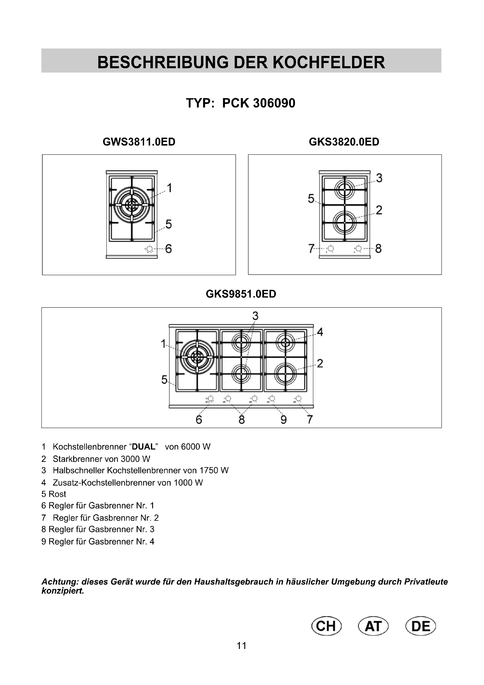 TYP: PCK 306090 1 Kochstellenbrenner “DUAL” von 6000 W 2 Starkbrenner von 3000 W 3 Halbschneller Kochstellenbrenner von 1750 W 4 Zusatz-Kochstellenbrenner von 1000 W 5 Rost 6 Regler für Gasbrenner Nr. 1 7 Regler für Gasbrenner Nr. 2 8 Regler für Gasbrenner Nr. 3 9 Regler für Gasbrenner Nr. 4 Achtung: dieses Gerät wurde für den Haushaltsgebrauch in häuslicher Umgebung durch Privatleute konzipiert. GWS3811.0ED GKS9851.0ED GKS3820.0ED