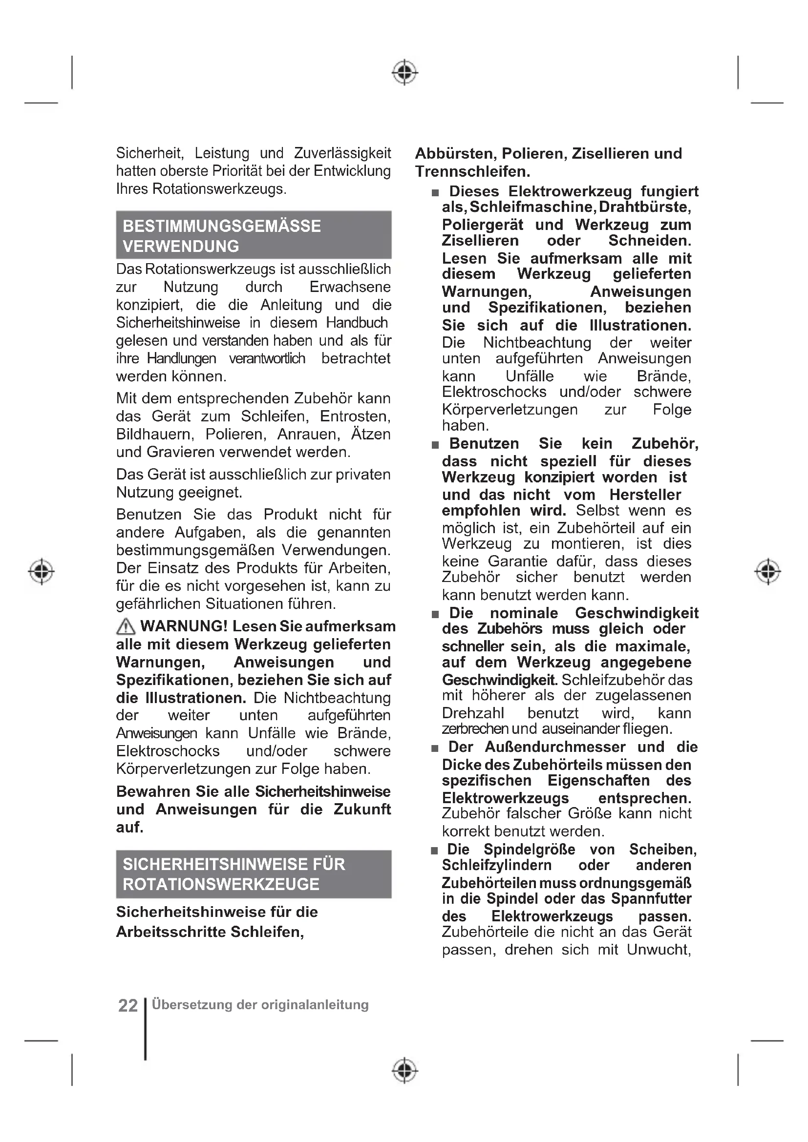 Übersetzung der originalanleitung■ Bringen Sie keine gezahnten Sägeblätter an. Solche Einsatzwerkzeuge verursachen häufig einen Rückschlag oder den Verlust der Kontrolle über das Elektrowerkzeug. ■ Führen Sie die Schneide immer in der Richtung in das Material, in der die Schnittkante aus dem Material austritt (dies ist auch die Richtung, in der die Späne fliegen). Wenn das Werkzeug in der falschen Richtung geführt wird, steigt die Schnittkante aus dem Arbeitsstück und zieht das Werkzeug in die Richtung dieser Führung. ■ Klemmen Sie bei der Nutzung von Rotationsfeilen , Trennscheiben, Hochgeschwindigkeitstrennscheiben und Wolframkarbid-Fräser das Werkstück immer sicher ein. Diese Scheiben können festlaufen, wenn sie in der Führung leicht verkantet sind, und können einen Rückstoß auslösen. Wenn Trennscheiben festlaufen, brechen sie normalerweise. Wenn Rotationsfeilen, Hochgeschwindigkeitstrennscheiben oder Wolframkarbid-Fräser festlaufen, können sie aus der Führung springen, und Sie können die Kontrolle über das Werkzeug verlieren. Besondere Sicherheitshinweise für Schleif- und Trennschleifarbeiten ■ Benutzen Sie nur Scheibentypen die zur Benutzung mit Ihrem Elektrowerkzeug empfohlen sind und nur für die empfohlene Anwendung. Schleifen Sie zum Beispiel nicht mit der Seite einer Trennscheibe. Trennschleifscheiben sind zum Umfangsschleifen vorgesehen, seitlich auf die solche Scheiben wirkende Kräfte können zum Zerbrechen der Scheibe führen. ■ Benutzen Sie für Schleifkegel und Stopfen mit Gewinde nur unbeschädigte Aufspanndorne mit Flanschunterseite Korrekte Aufspanndorne verringern die Bruchgefahr. ■ Vermeiden Sie ein Blockieren der Trennscheibe oder zu hohen Anpressdruck. Führen Sie keine übermäsig tiefen Schnitte aus. Das übermäßige Belasten der Scheibe verstärkt die Last und die Anfälligkeit der Scheibe, sich im Schnitt zu verdrehen oder zu blockieren, und die Möglichkeit eines Rückstoßes oder eines Scheibenbruchs. ■ Legen Sie Ihre Hand nicht in die Schnittlinie oder hinter die Scheibe. Wenn sich die Scheibe zu einem bestimmten Zeitpunkt des Betriebs von Ihrer Hand fortbewegt, kann der mögliche Rückstoß die sich drehende Scheibe vorwärtstreiben und das Elektrowerkzeug direkt auf Sie richten. ■ Wenn die Scheibe eingeklemmt, verhakt oder ein Schnitt aus irgendeinem Grund unterbrochen wird, schalten Sie das Elektrowerkzeug aus und halten das Elektrowerkzeug still, bis die Scheibe vollständig gestoppt ist. Versuchen Sie nie, die noch drehende Trennscheibe aus dem Schnitt zu ziehen, sonst kann ein Rückschlag erfolgen. Untersuchen Sie das Zubehörteil oder das Werkstück, um die Gründe für ein Verklemmen oder Verhaken der Scheibe zu beseitigen. ■ Schalten Sie das Elektrowerkzeug nicht wieder ein, solange es sich im Werkstück befindet. Lassen Sie die Trennscheibe erst Ihre voll Drehzahl erreichen, bevor Sie den Schnitt vorsichtig fortsetzen. Anderenfalls kann die Scheibe verhaken, aus dem Werkstück springen oder einen Rückschlag verursachen. ■ Stützen Sie Platten und große Werkstücke ab, um das Risiko eines Rückschlags durch eine eingeklemmte Trennscheibe zu vermindern. Große Werkstücke