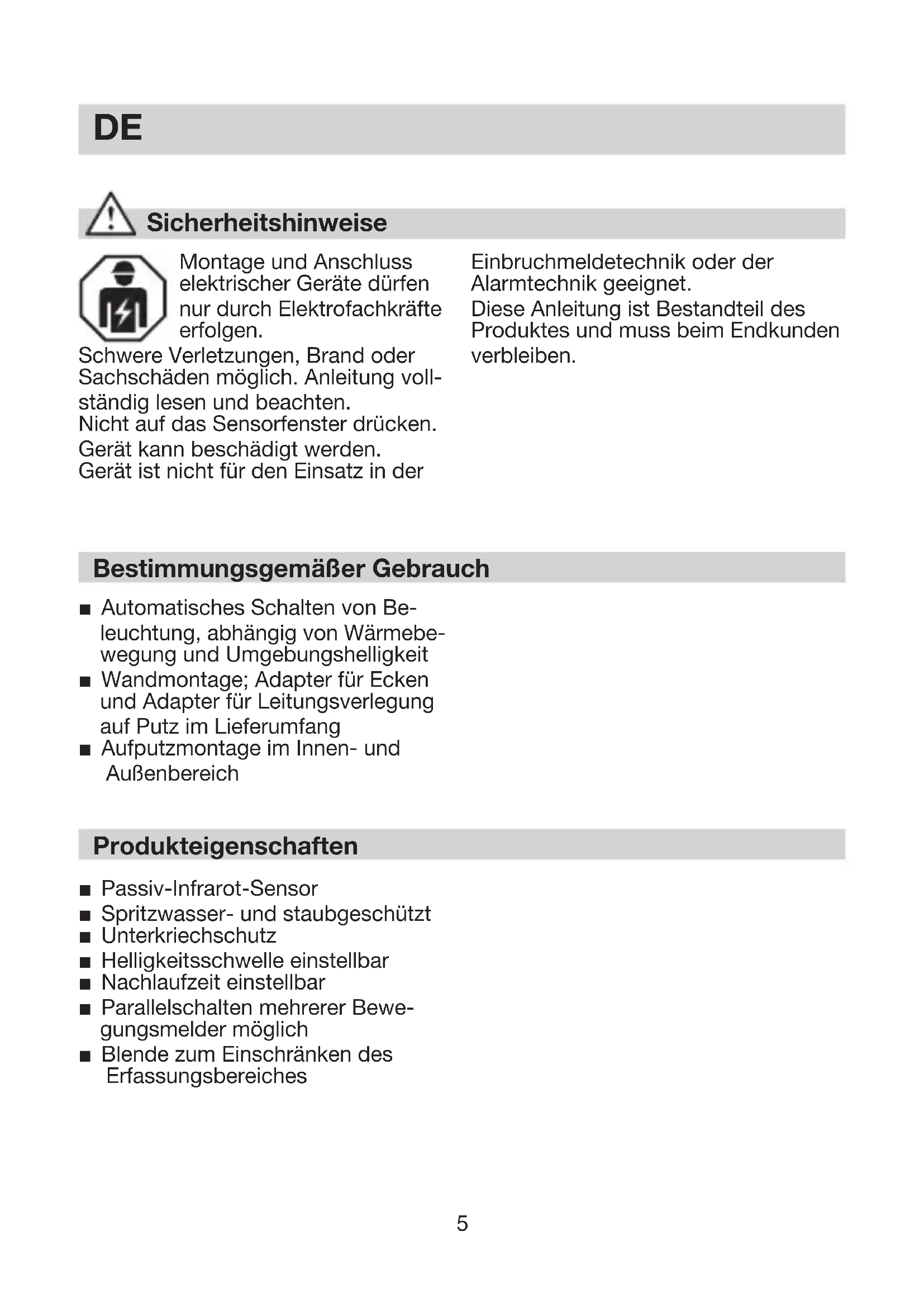 Montage und Anschluss elektrischer Geräte dürfen nur durch Elektrofachkräfte erfolgen. Schwere Verletzungen, Brand oder Sachschäden möglich. Anleitung voll- ständig lesen und beachten. Nicht auf das Sensorfenster drücken. Gerät kann beschädigt werden. Gerät ist nicht für den Einsatz in der Einbruchmeldetechnik oder der Alarmtechnik geeignet. Diese Anleitung ist Bestandteil des Produktes und muss beim Endkunden verbleiben. Sicherheitshinweise Bestimmungsgemäßer Gebrauch Automatisches Schalten von Be- leuchtung, abhängig von Wärmebe- wegung und Umgebungshelligkeit Wandmontage; Adapter für Ecken und Adapter für Leitungsverlegung auf Putz im Lieferumfang Aufputzmontage im Innen- und Außenbereich