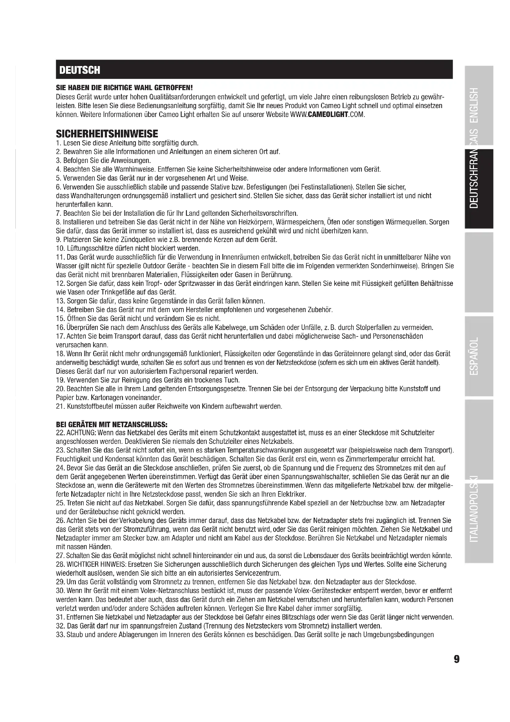 (Gültig in der Europäischen Union und anderen europäischen Ländern mit Mülltrennung) Dieses Symbol auf dem Produkt oder dazugehörigen Dokumenten weist darauf hin, dass das Gerät am Ende der Produktlebenszeit nicht zusammen mit dem normalen Hausmüll entsorgt werden darf, um Umwelt- oder Personenschäden durch unkontrollierte Abfallentsorgung zu vermeiden. Bitte entsorgen Sie dieses Produkt getrennt von anderen Abfällen und führen es zur Förderung nachhaltiger Wirtschaftskreisläufe dem Recycling zu. Als Privatkunde erhalten Sie Informationen zu umweltfreundlichen Entsorgungsmöglichkeiten über den Händler, bei dem das Produkt erworben wurde, oder über die entsprechenden regionalen Behörden. Als gewerblicher Nutzer kontaktieren Sie bitte Ihren Lieferanten und prüfen die ggf. vertraglich vereinbarten Konditionen zur Entsorgung der Geräte. Dieses Produkt darf nicht zusammen mit anderen gewerblichen Abfällen entsorgt werden. CE-Konformität Hiermit erklärt die Adam Hall GmbH, dass dieses Produkt folgenden Richtlinien entspricht (soweit zutreffend): R&TTE (1999/5/EG) bzw. RED (2014/53/EU) ab Juni 2017 Niederspannungsrichtlinie (2014/35/EU) EMV-Richtlinie (2014/30/EU) RoHS (2011/65/EU) Die vollständige Konformitätserklärung finden Sie unter www.adamhall.com. Des Weiteren können Sie diese auch unter info@adamhall.com anfragen.15 DEUTSCHFRANCAIS ESPAÑOL ENGLISH ITALIANO POLSKI FRANCAIS Vous avez fait le bon choix! Cet appareil a été développé et fabriqué en appliquant des exigences de qualité très élevées: il garantit des années de fonctionnement sans problème.Veuillez lire attentivement ce Manuel Utilisateur : vous apprendrez rapidement à utiliser votre appareil Cameo Light de façon optimale. Vous trouverez davantage d‘informations à propos de Cameo Light sur notre site Web: WWW.CAMEOLIGHT.COM.