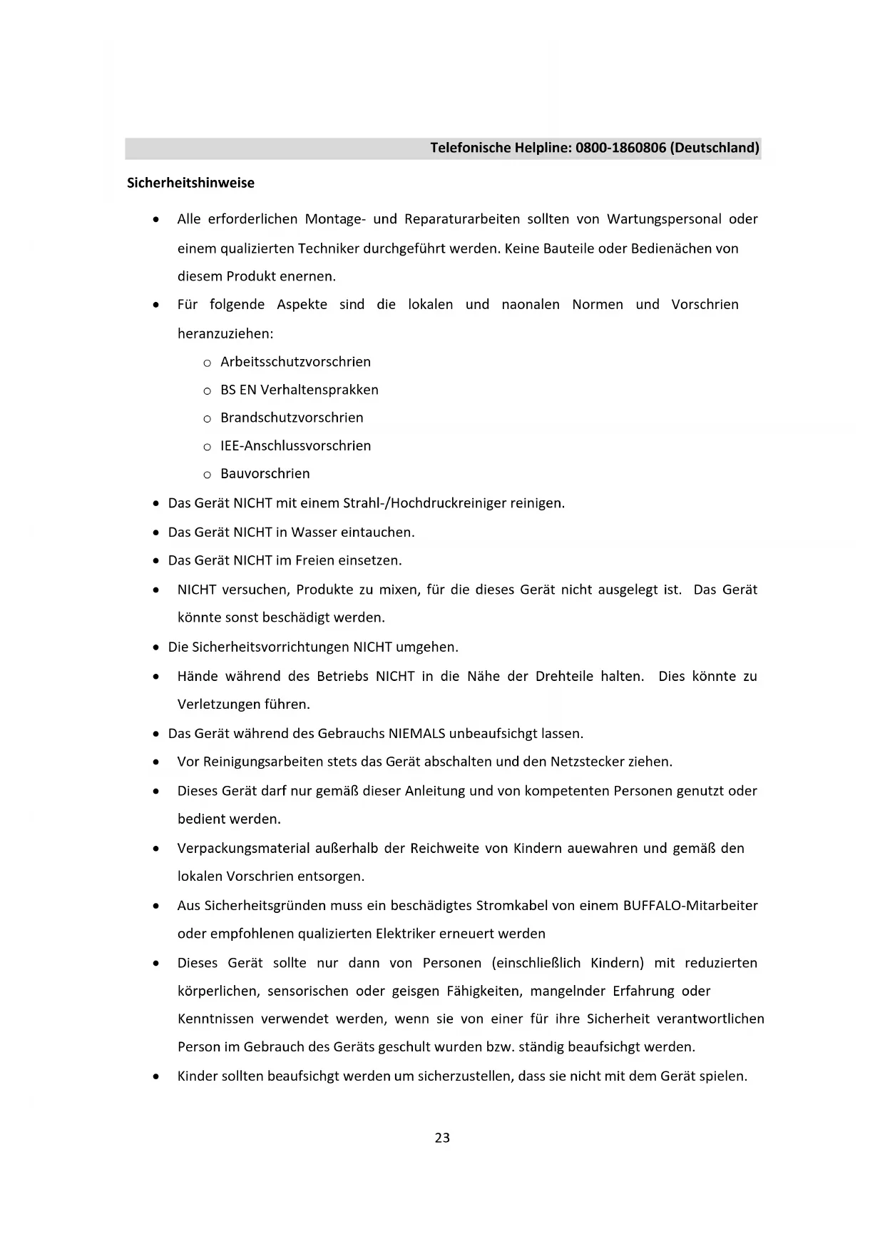 Storungssuche Problem Vermutliche Ursache Maßnahme Gerät läuft nicht. Gerät ist nicht eingeschaltet. Prüfen, ob der Netzstecker eingesteckt und das Gerät eingeschaltet ist. Stecker bzw. Kabel sind beschädigt. BUFFALO-Mitarbeiter oder qualifizierten Techniker anrufen. Sicherung im Stecker ist durchgebrannt. Sicherung auswechseln. Sicherung des Geräts (hinten am Gerät) ist durchgebrannt. Sicherung auswechseln. Kein Strom Netzstrom überprüfen. Schüssel lässt sich nicht wieder aufsetzen. Stifte der Schüssel oder umgebender Bereich sind durch Zutaten verstopft. Gerät reinigen. Das Gerät überhitzt sich. Die Schüssel ist zu voll. Gerät ausschalten und einen Teil des Inhalts herausnehmen. Das Gerät ist bereits zu lange in Betrieb. Das Gerät ausschalten und 30 Minuten lang abkühlen lassen. Das Gerät läuft laut. Schüssel oder Aufsatz sind nicht korrekt eingesetzt. Schüssel bzw. Aufsatz entfernen und erneut einsetzen. Lager/Zahnräder abgenutzt oder beschädigt. BUFFALO-Mitarbeiter oder qualifizierten Techniker anrufen. Der Mixaufsatz dreht sich nicht korrekt. Der Riemen hat sich gelockert. BUFFALO-Mitarbeiter oder qualifizierten Techniker anrufen.