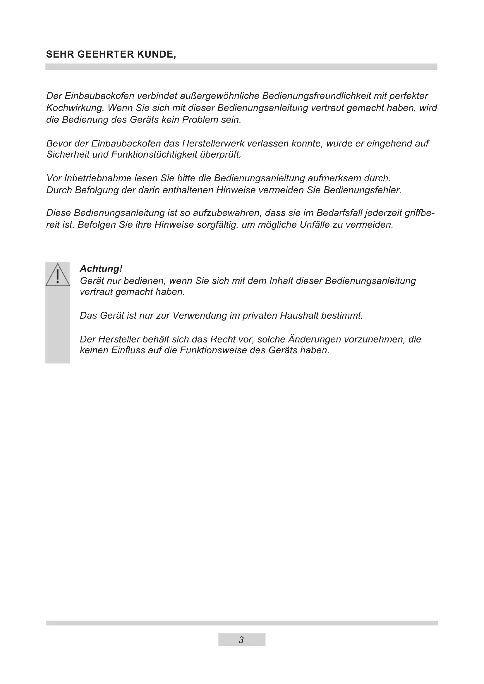 TECHNISCHE GEGEVENS 1323 SEHR GEEHRTER KUNDE, Der Einbaubackofen verbindet außergewöhnliche Bedienungsfreundlichkeit mit perfekter Kochwirkung. Wenn Sie sich mit dieser Bedienungsanleitung vertraut gemacht haben, wird die Bedienung des Geräts kein Problem sein. Bevor der Einbaubackofen das Herstellerwerk verlassen konnte, wurde er eingehend auf Sicherheit und Funktionstüchtigkeit überprüft. Vor Inbetriebnahme lesen Sie bitte die Bedienungsanleitung aufmerksam durch. Durch Befolgung der darin enthaltenen Hinweise vermeiden Sie Bedienungsfehler. Diese Bedienungsanleitung ist so aufzubewahren, dass sie im Bedarfsfall jederzeit gribe- reit ist. Befolgen Sie ihre Hinweise sorgfältig, um mögliche Unfälle zu vermeiden. Achtung! Gerät nur bedienen, wenn Sie sich mit dem Inhalt dieser Bedienungsanleitung vertraut gemacht haben. Das Gerät ist nur zur Verwendung im privaten Haushalt bestimmt. Der Hersteller behält sich das Recht vor, solche Änderungen vorzunehmen, die keinen Einuss auf die Funktionsweise des Geräts haben. DE4 SICHERHEITSHINWEISE Achtung. Das Gerät und seine zugänglichen Teile werden während der Benutzung heiß. Seien Sie beim Berühren sehr vorsichtig. Kinder unter 8 Jahren sollten sich nicht in der Nähe des Geräts aufhalten. Das Gerät darf von Kindern nur unter Aufsicht benutzt werden. Das Gerät darf von Kindern (ab einem Alter von 8 Jahren) sowie von Personen, die nicht im vollen Besitz ihrer körperli- chen, sensorischen oder geistigen Fähigkeiten sind nur unter Aufsicht und gebrauchsanweisungsgemäß benutzt werden. Kinder dürfen nicht mit dem Gerät spielen. Kinder dürfen Reinigungsarbeiten nur unter Aufsicht durchführen. Kinder dürfen das Gerät nur unter Aufsicht bedienen. Starke Erhitzung des Geräts während des Betriebs. Seien Sie vorsichtig und vermeiden Sie das Berühren der heißen Innenteile des Geräts. Zugängliche Teile können bei Be nut zung heiß werden. Kin- der fern halten. Achtung. Verwenden Sie zur Reinigung der Kochäche keine aggressiven Putzmittel oder scharfen Metallgegen- stände, die die Oberäche beschädigen könnten (Entstehung von Sprüngen oder Brüchen). Achtung.Um Stromschläge zu vermeiden, muss man sich vor dem Wechsel die Glühlampe vergewissern, dass das Gerät abgeschaltet ist. Zur Reinigung des Geräts keine Dampfreiniger verwen- den.5 SICHERHEITSHINWEISE ● Andere Haushaltsgeräte samt ihren Anschlusskabeln dürfen den Backofen nicht berühren auiegen, da deren Isolierung nicht hitzebeständig ist. ● Beim Braten den Herd nicht ohne Aufsicht lassen! Öl und Fett können sich durch Überhitzen oder Überlaufen selbst entzünden. ● Kochgeschirr mit einem Gewicht über 15 kg darf nicht auf die geönete Backofen- tür. ● In nicht betriebsfähigem Zustand darf der Gerät nicht benutzt werden. Sämtliche Mängel dürfen nur von einer autorisierten Fachkraft beseitigt werden. ● Bei Betriebsstörungen, die durch technische Mängel verursacht sind, muss unbe- dingt die Stromzufuhr unterbrochen und eine Reparatur veranlasst werden. ● Die Grundsätze und Bestimmungen dieser Bedienungsanleitung sind unbedingt zu beachten. Personen, die mit dem Inhalt der Bedienungsanleitung nicht vertraut sind, dürfen den Gerät nicht bedienen. ● Das Gerät ist ausschließlich zum Kochen im haushaltsüblichen Rahmen ausgelegt. Ein anderweitiger Gebrauch jeder Art (z.B. zur Raumbeheizung) ist nicht bestim- mungsgemäß und kann gefährlich sein. Während der Pyrolyse kann der Kochherd sehr hohe Tem- peraturen erreichen. Aus diesem Grunde können die Außen- ächen des Kochherdes heißer als gewöhnlich werden und daher ist es dafür zu sorgen, dass die Kinder sich dann in der Nähe des Kochherdes nicht aufhalten. Verbrühungsgefahr! Heißer Dampf kann beim Önen der Gerätetür entweichen. Während oder nach dem Garbetrieb die Gerätetür vorsichtig önen. Beim Önen nicht über die Gerätetür beugen. Beachten Sie, dass Dampf je nach Tem- peratur nicht sichtbar ist.6 UNSERE ENERGIESPARTIPPS Wer Energie verantwort- lich verbraucht, der schont nicht nur die Haushaltskas- se, sondern handelt auch umweltbewusst. Seien Sie dabei! Sparen Sie Elektro- energie! Folgendes können Sie tun: Unnötiges „Topfgucken” vermeiden. Auch die Backofentür nicht unnötig oft ö- nen. Backofen nur bei größeren Mengen einsetzen. Fleisch mit einem Gewicht bis zu 1 kg lässt sich sparsamer im Topf auf dem Herd ga- ren. Nachwärme des Backofens nutzen. Bei Garzeiten von mehr als 40 Minuten den Backofen unbedingt 10 Minuten vor dem Ende der Garzeit ausschalten. Wichtig!Bei Betrieb mit Zeitschal- tuhr entsprechend kürzere Garze- iten einstellen. Backofentür gut geschlossen halten. Durch Verschmutzungen an den Türdich- tungen geht Wärme verloren. Deshalb: Am besten sofort beseitigen! Herd nicht direkt neben Kühl- oder Ge- frieranlagen einbauen. Deren Stromverbrauch steigt dadurch un- nötig.7 AUSPACKEN Für den Transport haben wir das Gerät durch die Verpackung gegen Beschädigung gesichert. Nach dem Auspacken entsor- gen Sie bitte umweltfreundlich die Verpackungsteile. Alle Verpackungsmaterialien sind umweltver- träglich, hundertprozentig wieder zu verwer- ten und wurden mit einem entsprechenden Symbol gekennzeichnet. Achtung! Die Verpackungsmaterialien (Polyäthylenbeutel, Polystyrolstücke etc.) sind beim Auspacken von Kindern fern zu halten. AUSSERBETRIEBNAHME Nach Beendigung der Be- nutzung des Geräts darf es nicht zusammen mit dem ge- wöhnlichen Hausmüll entsorgt werden, sondern ist an eine Sammel- und Recyclingstelle für Elektro- und elektronische Geräte abzugeben. Darüber werden Sie durch ein Symbol auf dem Ge- rät, auf der Bedienungsanleitung oder der Verpackung informiert. Die bei der Herstellung dieses Geräts ein- gesetzten Materialien sind ihrer Kennzeich- nung entsprechend zur Wiederverwendung geeignet. Dank der Wiederverwendung, der Verwertung von Wertstoen oder anderer Formen der Verwertung von gebrauchten Ge- räten leis