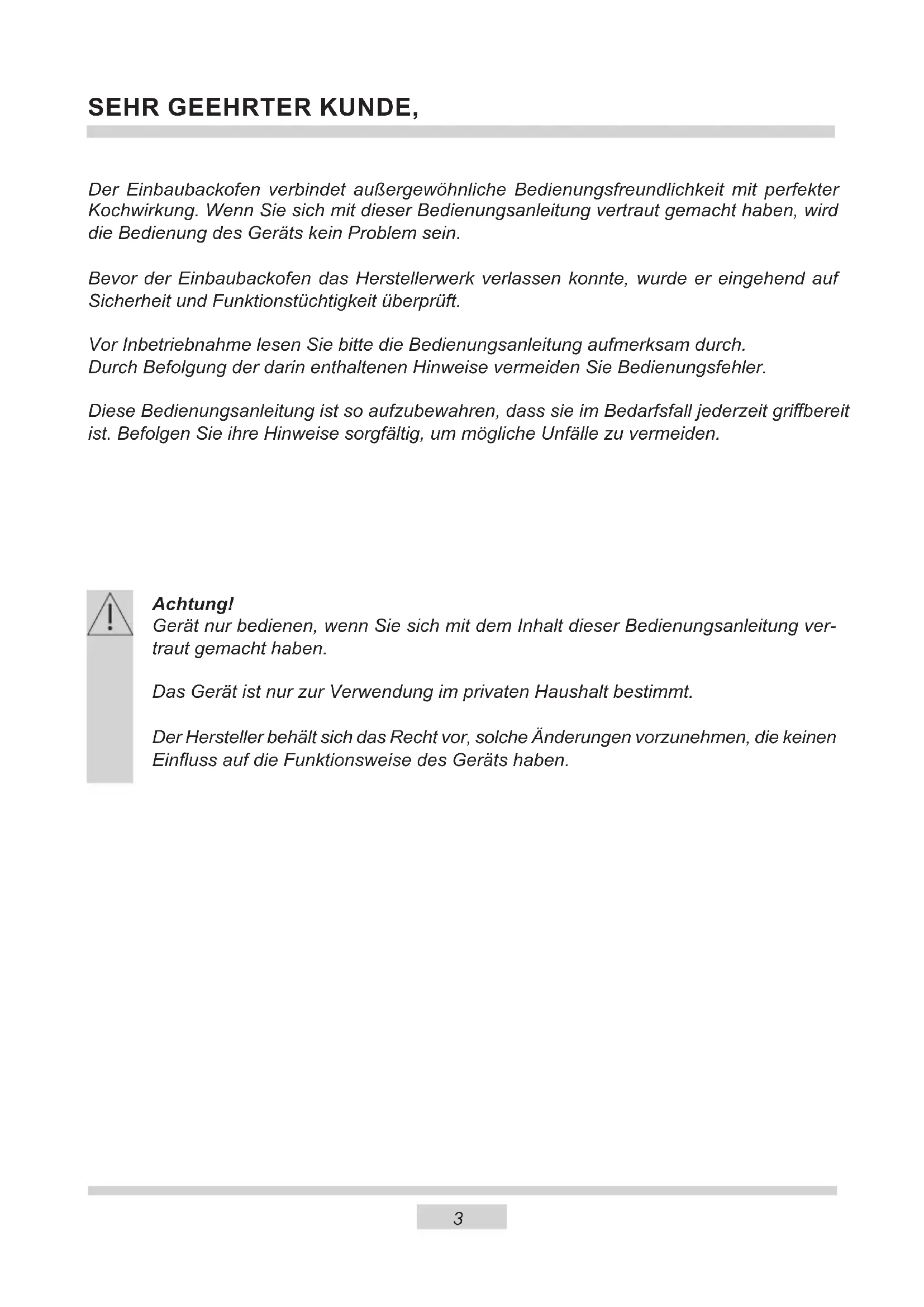 TECHNISCHE GEGEVENS 1323 SEHR GEEHRTER KUNDE, Der Einbaubackofen verbindet außergewöhnliche Bedienungsfreundlichkeit mit perfekter Kochwirkung. Wenn Sie sich mit dieser Bedienungsanleitung vertraut gemacht haben, wird die Bedienung des Geräts kein Problem sein. Bevor der Einbaubackofen das Herstellerwerk verlassen konnte, wurde er eingehend auf Sicherheit und Funktionstüchtigkeit überprüft. Vor Inbetriebnahme lesen Sie bitte die Bedienungsanleitung aufmerksam durch. Durch Befolgung der darin enthaltenen Hinweise vermeiden Sie Bedienungsfehler. Diese Bedienungsanleitung ist so aufzubewahren, dass sie im Bedarfsfall jederzeit gribereit ist. Befolgen Sie ihre Hinweise sorgfältig, um mögliche Unfälle zu vermeiden. Achtung! Gerät nur bedienen, wenn Sie sich mit dem Inhalt dieser Bedienungsanleitung ver- traut gemacht haben. Das Gerät ist nur zur Verwendung im privaten Haushalt bestimmt. Der Hersteller behält sich das Recht vor, solche Änderungen vorzunehmen, die keinen Einuss auf die Funktionsweise des Geräts haben. DE4 SICHERHEITSHINWEISE Achtung. Das Gerät und seine zugänglichen Teile werden während der Benutzung heiß. Seien Sie beim Berühren sehr vorsichtig. Kinder unter 8 Jahren sollten sich nicht in der Nähe des Geräts aufhalten. Das Gerät darf von Kindern nur unter Aufsicht benutzt werden. Das Gerät darf von Kindern (ab einem Alter von 8 Jahren) sowie von Personen, die nicht im vollen Besitz ihrer körperli- chen, sensorischen oder geistigen Fähigkeiten sind nur unter Aufsicht und gebrauchsanweisungsgemäß benutzt werden. Kinder dürfen nicht mit dem Gerät spielen. Kinder dürfen Reinigungsarbeiten nur unter Aufsicht durchführen. Kinder dürfen das Gerät nur unter Aufsicht bedienen. Starke Erhitzung des Geräts während des Betriebs. Seien Sie vorsichtig und vermeiden Sie das Berühren der heißen Innenteile des Geräts. Zugängliche Teile können bei Be nut zung heiß werden. Kin- der fern halten. Achtung. Verwenden Sie zur Reinigung der Kochäche keine aggressiven Putzmittel oder scharfen Metallgegen- stände, die die Oberäche beschädigen könnten (Entstehung von Sprüngen oder Brüchen). Achtung.Um Stromschläge zu vermeiden, muss man sich vor dem Wechsel die Glühlampe vergewissern, dass das Gerät abgeschaltet ist.5 SICHERHEITSHINWEISE ● Andere Haushaltsgeräte samt ihren Anschlusskabeln dürfen den Backofen nicht berühren auiegen, da deren Isolierung nicht hitzebeständig ist. ● Beim Braten den Herd nicht ohne Aufsicht lassen! Öl und Fett können sich durch Überhitzen oder Überlaufen selbst entzünden. ● Kochgeschirr mit einem Gewicht über 15 kg darf nicht auf die geönete Backofen- tür. ● In nicht betriebsfähigem Zustand darf der Gerät nicht benutzt werden. Sämtliche Mängel dürfen nur von einer autorisierten Fachkraft beseitigt werden. ● Bei Betriebsstörungen, die durch technische Mängel verursacht sind, muss unbe- dingt die Stromzufuhr unterbrochen und eine Reparatur veranlasst werden. ● Die Grundsätze und Bestimmungen dieser Bedienungsanleitung sind unbedingt zu beachten. Personen, die mit dem Inhalt der Bedienungsanleitung nicht vertraut sind, dürfen den Gerät nicht bedienen. ● Das Gerät ist ausschließlich zum Kochen im haushaltsüblichen Rahmen ausgelegt. Ein anderweitiger Gebrauch jeder Art (z.B. zur Raumbeheizung) ist nicht bestim- mungsgemäß und kann gefährlich sein. Zur Reinigung des Geräts keine Dampfreiniger verwenden. Verbrühungsgefahr! Heißer Dampf kann beim Önen der Gerätetür entweichen. Während oder nach dem Garbetrieb die Gerätetür vorsichtig önen. Beim Önen nicht über die Gerätetür beugen. Beachten Sie, dass Dampf je nach Tem- peratur nicht sichtbar ist.6 UNSERE ENERGIESPARTIPPS Wer Energie verantwort- lich verbraucht, der schont nicht nur die Haushaltskas- se, sondern handelt auch umweltbewusst. Seien Sie dabei! Sparen Sie Elektro- energie! Folgendes können Sie tun: ● Unnötiges „Topfgucken” vermeiden. Auch die Backofentür nicht unnötig oft ö- nen. ● Backofen nur bei größeren Mengen einsetzen. Fleisch mit einem Gewicht bis zu 1 kg lässt sich sparsamer im Topf auf dem Herd ga- ren. ● Nachwärme des Backofens nutzen. Bei Garzeiten von mehr als 40 Minuten den Backofen unbedingt 10 Minuten vor dem Ende der Garzeit ausschalten. Wichtig!Bei Betrieb mit Zeitschalt- uhr entsprechend kürzere Garzeiten einstellen. ● Backofentür gut geschlossen halten. Durch Verschmutzungen an den Türdich- tungen geht Wärme verloren. Deshalb: Am besten sofort beseitigen! ● Herd nicht direkt neben Kühl- oder Ge- frieranlagen einbauen. Deren Stromverbrauch steigt dadurch un- nötig.7 AUSPACKEN Für den Transport haben wir das Gerät durch die Verpak- kung gegen Beschädigung gesichert. Nach dem Aus- packen entsorgen Sie bitte umweltfreundlich die Verpak- kungsteile. Alle Verpackungsmaterialien sind umweltver- träglich, hundertprozentig wieder zu verwer- ten und wurden mit einem entsprechenden Symbol gekennzeichnet. Achtung! Die Verpackungsmaterialien (Polyäthylenbeutel, Polystyrolstücke etc.) sind beim Auspacken von Kindern fern zu halten. AUSSERBETRIEBNAHME Nach Beendigung der Benut- zung des Geräts darf es nicht zusammen mit dem gewöhnli- chen Hausmüll entsorgt werden, sondern ist an eine Sammel- und Recyclingstelle für Elektro- und elektronische Geräte abzuge- ben. Darüber werden Sie durch ein Symbol auf dem Gerät, auf der Bedienungsanleitung oder der Verpackung informiert. Die bei der Herstellung dieses Geräts ein- gesetzten Materialien sind ihrer Kennzeich- nung entsprechend zur Wiederverwendung geeignet. Dank der Wiederverwendung, der Verwertung von Wertstoen oder anderer Formen der Verwertung von gebrauchten Geräten leisten Sie einen wesentlichen Bei- trag zum Umweltschutz. Über die zuständige Recyclingstelle für die gebrauchten Geräte werden Sie von Ihrer Gemeindeverwaltung informiert.8 BEDIENELEMENTE