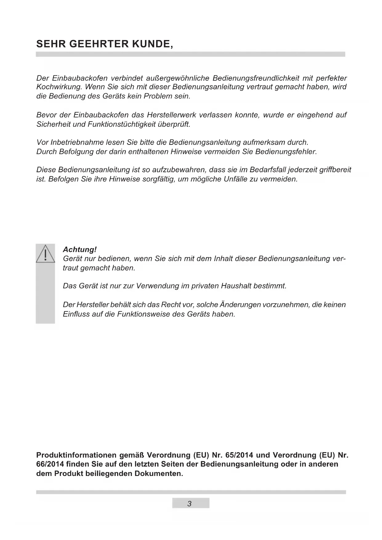 TECHNISCHE GEGEVENS 1063 SEHR GEEHRTER KUNDE, Der Einbaubackofen verbindet außergewöhnliche Bedienungsfreundlichkeit mit perfekter Kochwirkung. Wenn Sie sich mit dieser Bedienungsanleitung vertraut gemacht haben, wird die Bedienung des Geräts kein Problem sein. Bevor der Einbaubackofen das Herstellerwerk verlassen konnte, wurde er eingehend auf Sicherheit und Funktionstüchtigkeit überprüft. Vor Inbetriebnahme lesen Sie bitte die Bedienungsanleitung aufmerksam durch. Durch Befolgung der darin enthaltenen Hinweise vermeiden Sie Bedienungsfehler. Diese Bedienungsanleitung ist so aufzubewahren, dass sie im Bedarfsfall jederzeit gribereit ist. Befolgen Sie ihre Hinweise sorgfältig, um mögliche Unfälle zu vermeiden. Achtung! Gerät nur bedienen, wenn Sie sich mit dem Inhalt dieser Bedienungsanleitung ver- traut gemacht haben. Das Gerät ist nur zur Verwendung im privaten Haushalt bestimmt. Der Hersteller behält sich das Recht vor, solche Änderungen vorzunehmen, die keinen Einuss auf die Funktionsweise des Geräts haben. Produktinformationen gemäß Verordnung (EU) Nr. 65/2014 und Verordnung (EU) Nr. 66/2014 nden Sie auf den letzten Seiten der Bedienungsanleitung oder in anderen dem Produkt beiliegenden Dokumenten. DE4 SICHERHEITSHINWEISE Achtung. Das Gerät und seine zugänglichen Teile werden während der Benutzung heiß. Seien Sie beim Berühren sehr vorsichtig. Kinder unter 8 Jahren sollten sich nicht in der Nähe des Geräts aufhalten. Das Gerät darf von Kindern nur unter Aufsicht benutzt werden. Das Gerät darf von Kindern (ab einem Alter von 8 Jahren) sowie von Personen, die nicht im vollen Besitz ihrer körperli- chen, sensorischen oder geistigen Fähigkeiten sind nur unter Aufsicht und gebrauchsanweisungsgemäß benutzt werden. Kinder dürfen nicht mit dem Gerät spielen. Kinder dürfen Reinigungsarbeiten nur unter Aufsicht durchführen. Kinder dürfen das Gerät nur unter Aufsicht bedienen. Starke Erhitzung des Geräts während des Betriebs. Seien Sie vorsichtig und vermeiden Sie das Berühren der heißen Innenteile des Geräts. Zugängliche Teile können bei Be nut zung heiß werden. Kin- der fern halten. Achtung. Verwenden Sie zur Reinigung der Kochäche keine aggressiven Putzmittel oder scharfen Metallgegen- stände, die die Oberäche beschädigen könnten (Entstehung von Sprüngen oder Brüchen). Achtung.Um Stromschläge zu vermeiden, muss man sich vor dem Wechsel die Glühlampe vergewissern, dass das Gerät abgeschaltet ist.5 SICHERHEITSHINWEISE ● Andere Haushaltsgeräte samt ihren Anschlusskabeln dürfen den Backofen nicht berühren auiegen, da deren Isolierung nicht hitzebeständig ist. ● Beim Braten den Herd nicht ohne Aufsicht lassen! Öl und Fett können sich durch Überhitzen oder Überlaufen selbst entzünden. ● Kochgeschirr mit einem Gewicht über 15 kg darf nicht auf die geönete Backofen- tür. ● In nicht betriebsfähigem Zustand darf der Gerät nicht benutzt werden. Sämtliche Mängel dürfen nur von einer autorisierten Fachkraft beseitigt werden. ● Bei Betriebsstörungen, die durch technische Mängel verursacht sind, muss unbe- dingt die Stromzufuhr unterbrochen und eine Reparatur veranlasst werden. ● Die Grundsätze und Bestimmungen dieser Bedienungsanleitung sind unbedingt zu beachten. Personen, die mit dem Inhalt der Bedienungsanleitung nicht vertraut sind, dürfen den Gerät nicht bedienen. ● Das Gerät ist ausschließlich zum Kochen im haushaltsüblichen Rahmen ausgelegt. Ein anderweitiger Gebrauch jeder Art (z.B. zur Raumbeheizung) ist nicht bestim- mungsgemäß und kann gefährlich sein. Zur Reinigung des Geräts keine Dampfreiniger verwenden. Verbrühungsgefahr! Heißer Dampf kann beim Önen der Gerätetür entweichen. Während oder nach dem Garbetrieb die Gerätetür vorsichtig önen. Beim Önen nicht über die Gerätetür beugen. Beachten Sie, dass Dampf je nach Tem- peratur nicht sichtbar ist.6 UNSERE ENERGIESPARTIPPS Wer Energie verantwort- lich verbraucht, der schont nicht nur die Haushaltskas- se, sondern handelt auch umweltbewusst. Seien Sie dabei! Sparen Sie Elektro- energie! Folgendes können Sie tun: ● Unnötiges „Topfgucken” vermeiden. Auch die Backofentür nicht unnötig oft ö- nen. ● Backofen nur bei größeren Mengen einsetzen. Fleisch mit einem Gewicht bis zu 1 kg lässt sich sparsamer im Topf auf dem Herd ga- ren. ● Nachwärme des Backofens nutzen. Bei Garzeiten von mehr als 40 Minuten den Backofen unbedingt 10 Minuten vor dem Ende der Garzeit ausschalten. Wichtig!Bei Betrieb mit Zeitschalt- uhr entsprechend kürzere Garzeiten einstellen. ● Backofentür gut geschlossen halten. Durch Verschmutzungen an den Türdich- tungen geht Wärme verloren. Deshalb: Am besten sofort beseitigen! ● Herd nicht direkt neben Kühl- oder Ge- frieranlagen einbauen. Deren Stromverbrauch steigt dadurch un- nötig.7 AUSPACKEN Für den Transport haben wir das Gerät durch die Verpak- kung gegen Beschädigung gesichert. Nach dem Aus- packen entsorgen Sie bitte umweltfreundlich die Verpak- kungsteile. Alle Verpackungsmaterialien sind umweltver- träglich, hundertprozentig wieder zu verwer- ten und wurden mit einem entsprechenden Symbol gekennzeichnet. Achtung! Die Verpackungsmaterialien (Polyäthylenbeutel, Polystyrolstücke etc.) sind beim Auspacken von Kindern fern zu halten. AUSSERBETRIEBNAHME Nach Beendigung der Benut- zung des Geräts darf es nicht zusammen mit dem gewöhnli- chen Hausmüll entsorgt werden, sondern ist an eine Sammel- und Recyclingstelle für Elektro- und elektronische Geräte abzuge- ben. Darüber werden Sie durch ein Symbol auf dem Gerät, auf der Bedienungsanleitung oder der Verpackung informiert. Die bei der Herstellung dieses Geräts ein- gesetzten Materialien sind ihrer Kennzeich- nung entsprechend zur Wiederverwendung geeignet. Dank der Wiederverwendung, der Verwertung von Wertstoen oder anderer Formen der Verwertung von gebrauchten Geräten leisten Sie einen wesentlichen Bei- trag zum Umweltschutz. Ü