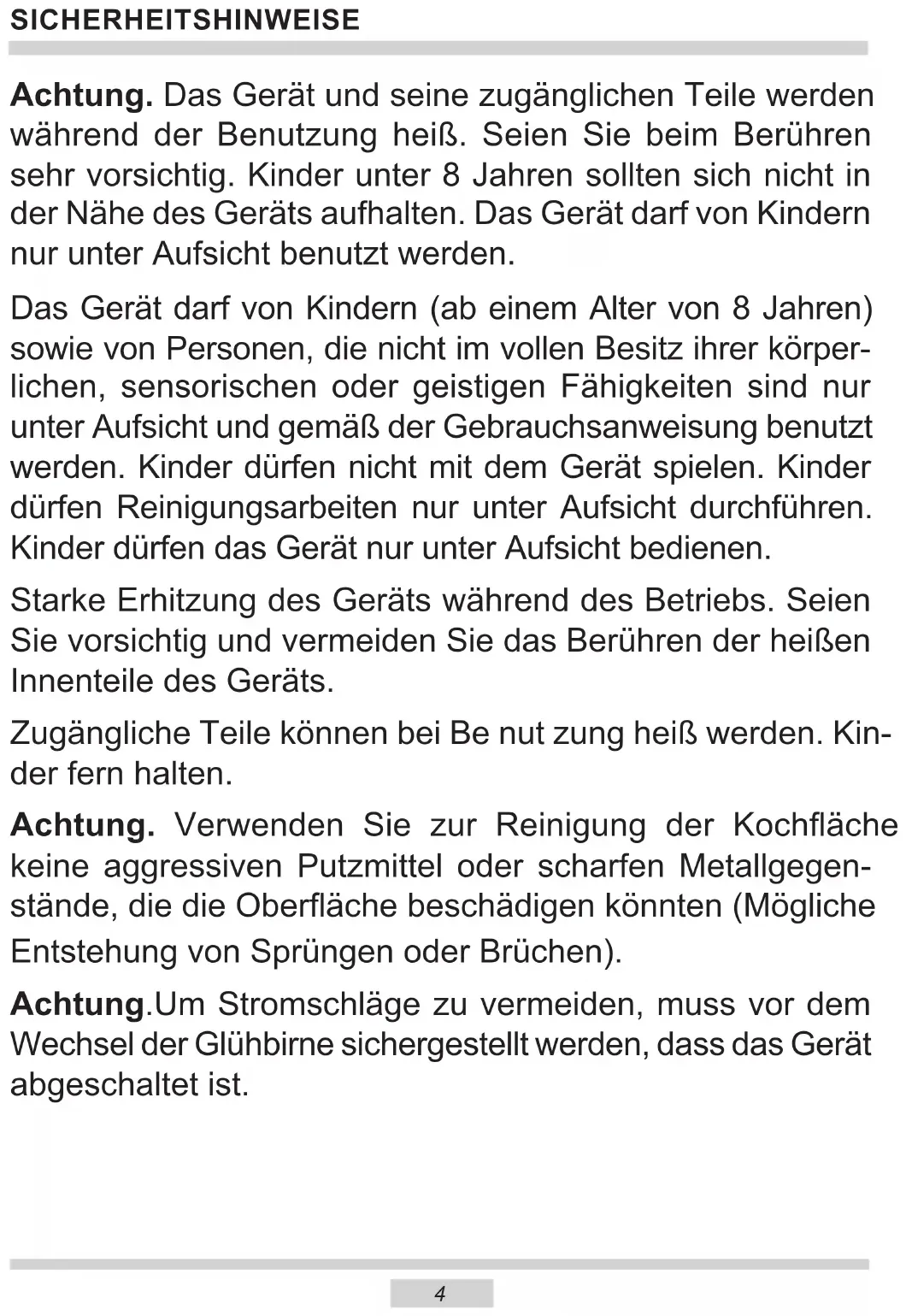 - Technische Daten SICHERHEITSHINWEISE Achtung. Das Gerät und seine zugänglichen Teile werden während der Benutzung heiß. Seien Sie beim Berühren sehr vorsichtig. Kinder unter 8 Jahren sollten sich nicht in der Nähe des Geräts aufhalten. Das Gerät darf von Kindern nur unter Aufsicht benutzt werden. Das Gerät darf von Kindern (ab einem Alter von 8 Jahren) sowie von Personen, die nicht im vollen Besitz ihrer körper- lichen, sensorischen oder geistigen Fähigkeiten sind nur unter Aufsicht und gemäß der Gebrauchsanweisung benutzt werden. Kinder dürfen nicht mit dem Gerät spielen. Kinder dürfen Reinigungsarbeiten nur unter Aufsicht durchführen. Kinder dürfen das Gerät nur unter Aufsicht bedienen. Starke Erhitzung des Geräts während des Betriebs. Seien Sie vorsichtig und vermeiden Sie das Berühren der heißen Innenteile des Geräts. Zugängliche Teile können bei Be nut zung heiß werden. Kin- der fern halten. Achtung. Verwenden Sie zur Reinigung der Kochäche keine aggressiven Putzmittel oder scharfen Metallgegen- stände, die die Oberäche beschädigen könnten (Mögliche Entstehung von Sprüngen oder Brüchen). Achtung.Um Stromschläge zu vermeiden, muss vor dem Wechsel der Glühbirne sichergestellt werden, dass das Gerät abgeschaltet ist.5 SICHERHEITSHINWEISE ● Andere Haushaltsgeräte samt ihren Anschlusskabeln dürfen den Backofen nicht berühren oder auiegen, da deren Isolierung unter Umständen nicht hitzebeständig ist. ● Beim Braten den Herd nicht ohne Aufsicht lassen! Öl und Fett können sich durch Über- hitzen oder Überlaufen selbst entzünden. ● Kochgeschirr mit einem Gewicht über 15 kg darf nicht auf die geönete Backofentür gestellt werden. ● In nicht betriebsfähigem Zustand darf das Gerät nicht benutzt werden. Sämtliche Mängel dürfen nur von einer autorisierten Fachkraft beseitigt werden. ● Bei Betriebsstörungen, die durch technische Mängel verursacht werden, muss unbedingt die Stromzufuhr unterbrochen und eine Reparatur veranlasst werden. ● Die Grundsätze und Bestimmungen dieser Bedienungsanleitung sind unbedingt zu be- achten. Personen, die mit dem Inhalt der Bedienungsanleitung nicht vertraut sind, dürfen das Gerät nicht bedienen. ● Das Gerät ist ausschließlich zum Kochen im haushaltsüblichen Rahmen ausgelegt. Ein anderweitiger Gebrauch jeder Art (z.B. zur Raumbeheizung) ist nicht bestimmungsgemäß und kann gefährlich sein. Zur Reinigung des Geräts keine Dampfreiniger verwenden. Während der Pyrolyse kann der Backofen sehr hohe Tem- peraturen erreichen. Aus diesem Grunde können die Außen- ächen des Backofens heißer als gewöhnlich werden, daher ist dafür zu sorgen, dass sich Kinder nicht in der Nähe des Backofens aufhalten. Verbrühungsgefahr! Heißer Dampf kann beim Önen der Gerätetür entweichen. Während oder nach dem Garbetrieb die Gerätetür vorsichtig önen. Beim Önen nicht über die Gerätetür beugen. Beachten Sie, dass Dampf je nach Tem- peratur nicht sichtbar ist.6 UNSERE ENERGIESPARTIPPS Wer Energie verantwortlich verbraucht, der schont nicht nur die Haushaltskasse, sondern handelt auch um- weltbewusst. Seien Sie da- bei! Folgendes können Sie tun, um Energie zu sparen: ● Unnötiges „Topfgucken” vermeiden. Die Backofentür nicht unnötig oft önen. ● Backofen nur bei größeren Mengen einsetzen. Fleisch mit einem Gewicht bis zu 1 kg lässt sich energiesparender im Topf auf dem Herd garen. ● Nachwärme des Backofens nutzen. Bei Garzeiten von mehr als 40 Minuten den Backofen 10 Minuten vor dem Ende der Garzeit ausschalten. Wichtig!Bei Betrieb mit Zeitschalt- uhr entsprechend kürzere Garzeiten einstellen. ● Backofentür gut geschlossen halten. Durch Verschmutzungen an den Türdich- tungen geht Wärme verloren. Deshalb: Am besten sofort beseitigen! ● Herd nicht direkt neben Kühl- oder Ge- frieranlagen einbauen. Deren Stromverbrauch steigt dadurch un- nötig. Relevante Informationen zur Verringerung der Umweltauswirkungen nach (EU) Nr. 66/20147 AUSPACKEN Für den Transport haben wir das Gerät durch die Verpackung ge- gen Beschädigung gesichert. Nach dem Auspacken entsor- gen Sie die Verpackungsteile umweltfreundlich und gemäß den geltenden Bestimmungen. Alle Verpackungsmaterialien sind umweltver- träglich, hundertprozentig wieder zu verwer- ten und wurden mit einem entsprechenden Symbol gekennzeichnet. Achtung! Die Verpackungsmaterialien (Polyäthylenbeutel, Polystyrolstücke etc.) sind beim Auspacken von Kindern fern zu halten.8 p. 314