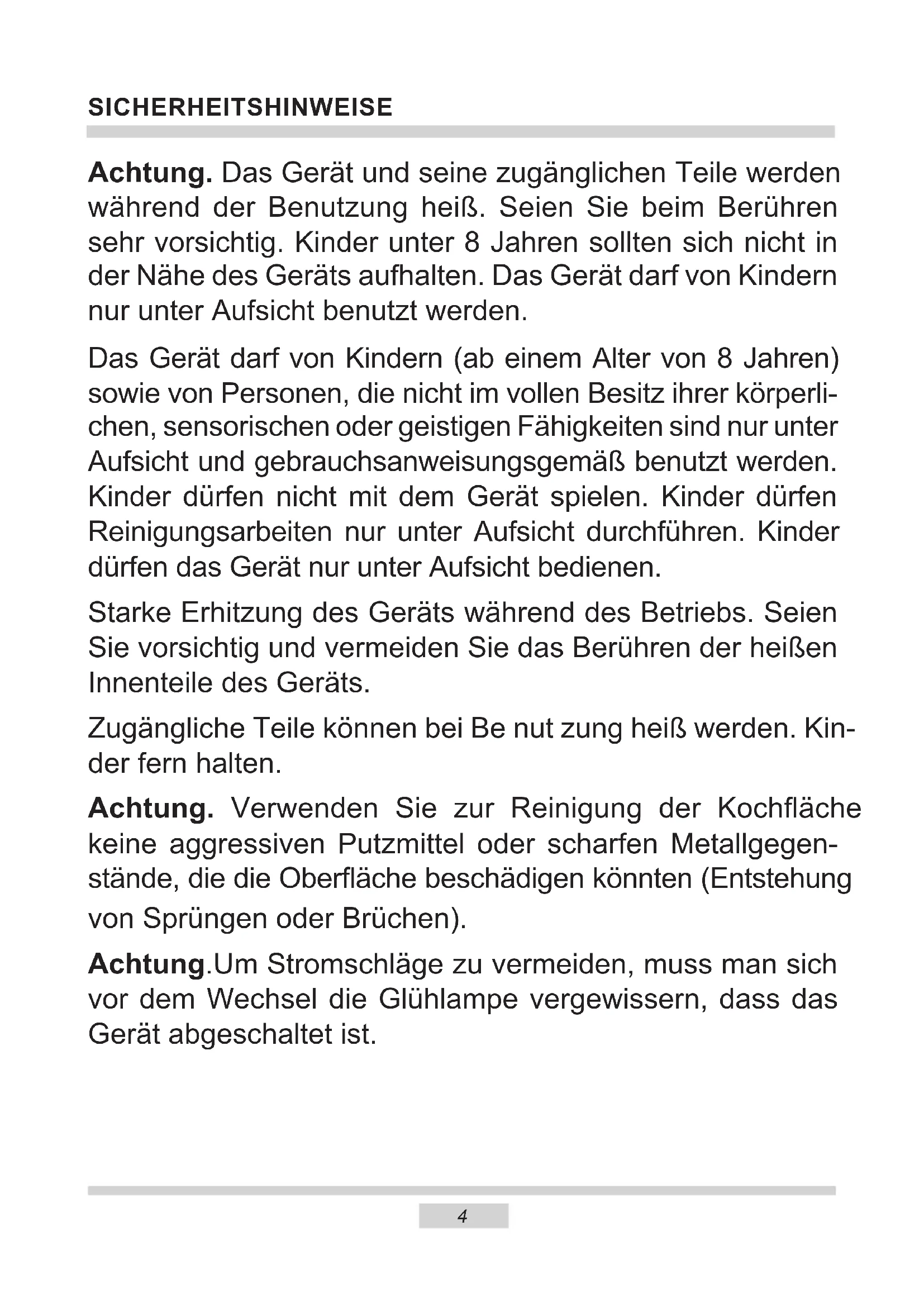 - Technische Daten SICHERHEITSHINWEISE Achtung. Das Gerät und seine zugänglichen Teile werden während der Benutzung heiß. Seien Sie beim Berühren sehr vorsichtig. Kinder unter 8 Jahren sollten sich nicht in der Nähe des Geräts aufhalten. Das Gerät darf von Kindern nur unter Aufsicht benutzt werden. Das Gerät darf von Kindern (ab einem Alter von 8 Jahren) sowie von Personen, die nicht im vollen Besitz ihrer körperli- chen, sensorischen oder geistigen Fähigkeiten sind nur unter Aufsicht und gebrauchsanweisungsgemäß benutzt werden. Kinder dürfen nicht mit dem Gerät spielen. Kinder dürfen Reinigungsarbeiten nur unter Aufsicht durchführen. Kinder dürfen das Gerät nur unter Aufsicht bedienen. Starke Erhitzung des Geräts während des Betriebs. Seien Sie vorsichtig und vermeiden Sie das Berühren der heißen Innenteile des Geräts. Zugängliche Teile können bei Be nut zung heiß werden. Kin- der fern halten. Achtung. Verwenden Sie zur Reinigung der Kochäche keine aggressiven Putzmittel oder scharfen Metallgegen- stände, die die Oberäche beschädigen könnten (Entstehung von Sprüngen oder Brüchen). Achtung.Um Stromschläge zu vermeiden, muss man sich vor dem Wechsel die Glühlampe vergewissern, dass das Gerät abgeschaltet ist.5 SICHERHEITSHINWEISE ● Andere Haushaltsgeräte samt ihren Anschlusskabeln dürfen den Backofen nicht berühren oder auiegen, da deren Isolierung unter Umständen nicht hitzebeständig ist. ● Beim Braten den Herd nicht ohne Aufsicht lassen! Öl und Fett können sich durch Über- hitzen oder Überlaufen selbst entzünden. ● Kochgeschirr mit einem Gewicht über 15 kg darf nicht auf die geönete Backofentür gestellt werden. ● In nicht betriebsfähigem Zustand darf der Gerät nicht benutzt werden. Sämtliche Mängel dürfen nur von einer autorisierten Fachkraft beseitigt werden. ● Bei Betriebsstörungen, die durch technische Mängel verursacht werden, muss unbedingt die Stromzufuhr unterbrochen und eine Reparatur veranlasst werden. ● Die Grundsätze und Bestimmungen dieser Bedienungsanleitung sind unbedingt zu be- achten. Personen, die mit dem Inhalt der Bedienungsanleitung nicht vertraut sind, dürfen den Gerät nicht bedienen. ● Das Gerät ist ausschließlich zum Kochen im haushaltsüblichen Rahmen ausgelegt. Ein anderweitiger Gebrauch jeder Art (z.B. zur Raumbeheizung) ist nicht bestimmungsgemäß und kann gefährlich sein. Zur Reinigung des Geräts keine Dampfreiniger verwenden. Damit es nicht zu Überhitzung kommt, darf das Gerät nicht hinter Zierklappen/Ziertüren aufgestellt werden. Während der Pyrolyse kann den Backofen sehr hohe Tem- peraturen erreichen. Aus diesem Grunde können die Außen- ächen des Backofens heißer als gewöhnlich werden, daher ist dafür zu sorgen, dass sich Kinder nicht in der Nähe des Backofens aufhalten. Verbrühungsgefahr! Heißer Dampf kann beim Önen der Gerätetür entweichen. Während oder nach dem Garbetrieb die Gerätetür vorsichtig önen. Beim Önen nicht über die Gerätetür beugen. Beachten Sie, dass Dampf je nach Tem- peratur nicht sichtbar ist.6 UNSERE ENERGIESPARTIPPS Wer Energie verantwort- lich verbraucht, der schont nicht nur die Haushaltskas- se, sondern handelt auch umweltbewusst. Seien Sie dabei! Sparen Sie Elektro- energie! Folgendes können Sie tun: ● Unnötiges „Topfgucken” vermeiden. Die Backofentür nicht unnötig oft önen. ● Backofen nur bei größeren Mengen einsetzen. Fleisch mit einem Gewicht bis zu 1 kg lässt sich energiesparender im Topf auf dem Herd garen. ● Nachwärme des Backofens nutzen. Bei Garzeiten von mehr als 40 Minuten den Backofen 10 Minuten vor dem Ende der Garzeit ausschalten. Wichtig!Bei Betrieb mit Zeitschalt- uhr entsprechend kürzere Garzeiten einstellen. ● Backofentür gut geschlossen halten. Durch Verschmutzungen an den Türdich- tungen geht Wärme verloren. Deshalb: Am besten sofort beseitigen! ● Herd nicht direkt neben Kühl- oder Ge- frieranlagen einbauen. Deren Stromverbrauch steigt dadurch un- nötig. Relevante Informationen zur Verringerung der Umweltauswirkungen nach (EU) Nr. 66/20147 AUSPACKEN Für den Transport haben wir das Gerät durch die Verpackung ge- gen Beschädigung gesichert. Nach dem Auspacken entsor- gen Sie die Verpackungsteile umweltfreundlich und gemäß den geltenden Bestimmungen. Alle Verpackungsmaterialien sind umweltver- träglich, hundertprozentig wieder zu verwer- ten und wurden mit einem entsprechenden Symbol gekennzeichnet. Achtung! Die Verpackungsmaterialien (Polyäthylenbeutel, Polystyrolstücke etc.) sind beim Auspacken von Kindern fern zu halten.8 p. 314