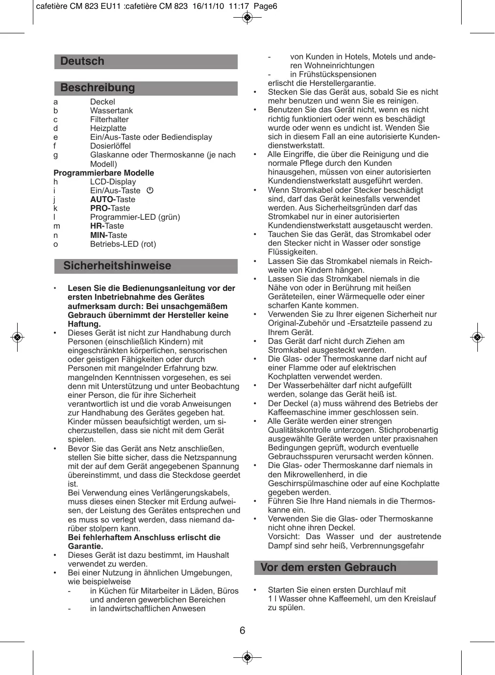 Le câble d’alimentation ne doit jamais être à proximité ou en contact avec les parties chaudes de votre appareil, près d’une source de chaleur ou sur un angle vif. Pour votre sécurité, n’utiliser que des accessoires et des pièces détachées du fabricant adaptés à votre appareil. Ne pas débrancher la fiche de la prise en tirant sur le câble. Ne pas utiliser la verseuse ou le pot isotherme sur une flamme et sur des plaques de cuisinières électriques. Ne pas remettre d’eau dans l’appareil s’il est encore chaud. Toujours fermer le couvercle (a) lors du fonctionnement de la cafetière. Tous les appareils sont soumis à un contrôle qualité sévère. Des essais d’utilisation pratiques sont faits avec des appareils pris au hasard ce qui explique d’éventuelles traces d’utilisation. Ne jamais mettre votre verseuse ou votre pot isotherme dans un four à micro-ondes, dans un lave-vaisselle ou sur une plaque de cuisson. Ne jamais introduire votre main à l’intérieur du pot isotherme. N’utilisez pas la verseuse ou le pot isotherme sans leur couvercle. Votre machine a été conçue pour un usage domestique seulement. Elle n’a pas été conçue pour être utilisée dans les cas suivants qui ne sont pas couverts par la garantie: - Dans des coins de cuisines réservés au personnel dans des magasins, bureaux et autres environnements professionnels, Dans des fermes, Par les clients des hôtels, motels et autres environnements à caractère résidentiel, Dans des environnements de type chambres d’hôtes.